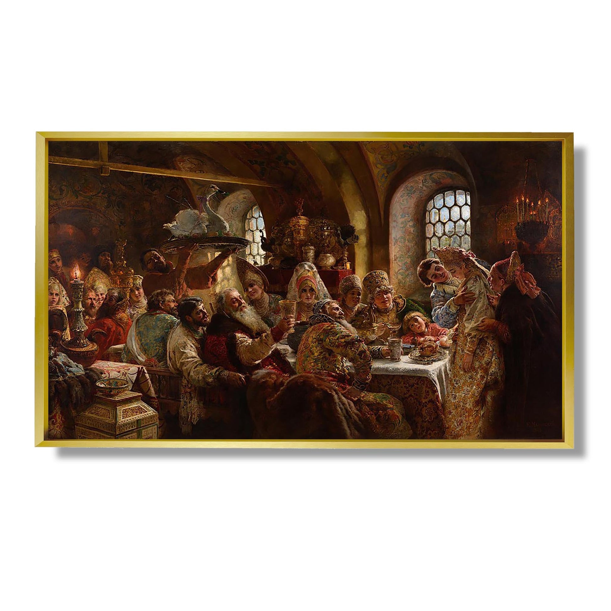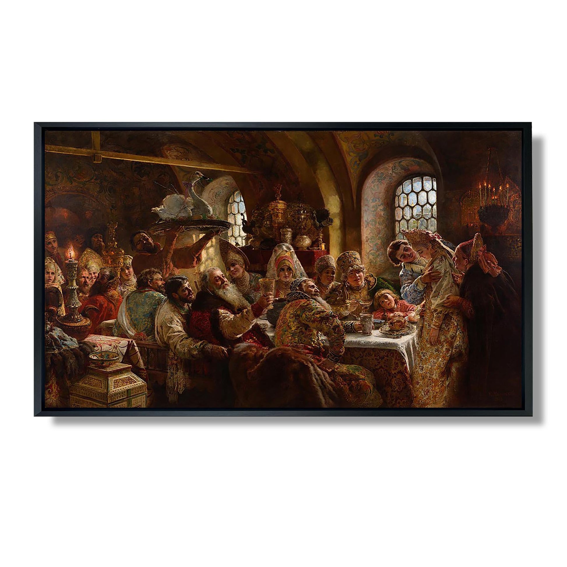„Ein Bojarenhochzeitsfest“ von Konstantin Makowski ist ein ikonisches Werk der russischen Malerei des 19. Jahrhunderts, das 1883 entstand. Dieses Gemälde zeigt eine festliche Szene einer Bojarenhochzeit und hebt den Reichtum und die Kultur der russischen Aristokratie hervor. Die in reich verzierte Trachten gekleideten Figuren sind um einen mit erlesenen Gerichten beladenen Tisch versammelt. Die Komposition ist detailreich und fängt die freudige und feierliche Atmosphäre des Ereignisses ein. Makovsky zeichnet sich durch die Verwendung lebendiger Farben und Texturen aus und schafft Werke, die sowohl realistisch als auch eindrucksvoll sind, und stellt damit sein Talent für die Verewigung russischer Traditionen unter Beweis.