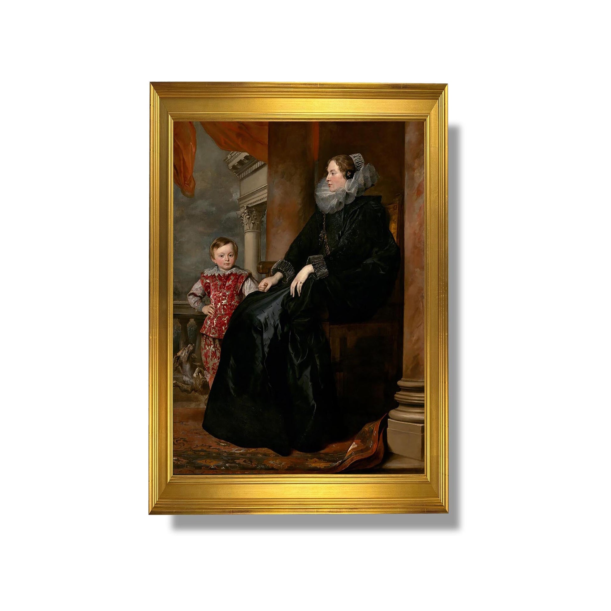 „Eine genuesische Adlige und ihr Sohn“ ist ein ikonisches Werk von Sir Anthony van Dyck, das im 17. Jahrhundert entstand. Dieses Gemälde illustriert den italienischen Adel anhand des Porträts einer Mutter und ihres Sohnes und fängt die Eleganz und Würde der genuesischen High Society ein. Van Dyck, ein Meister der Porträtmalerei, verwendet eine reiche Palette und subtile Lichtspiele, um die Texturen der Kleidung und die Weichheit der Gesichter hervorzuheben. Das Werk zeigt die Intimität und Zuneigung zwischen den beiden Charakteren und spiegelt gleichzeitig den sozialen Status und die Kultur der Zeit wider. Dieses Meisterwerk verkörpert den Barockstil und verbindet Realismus und Idealisierung.
