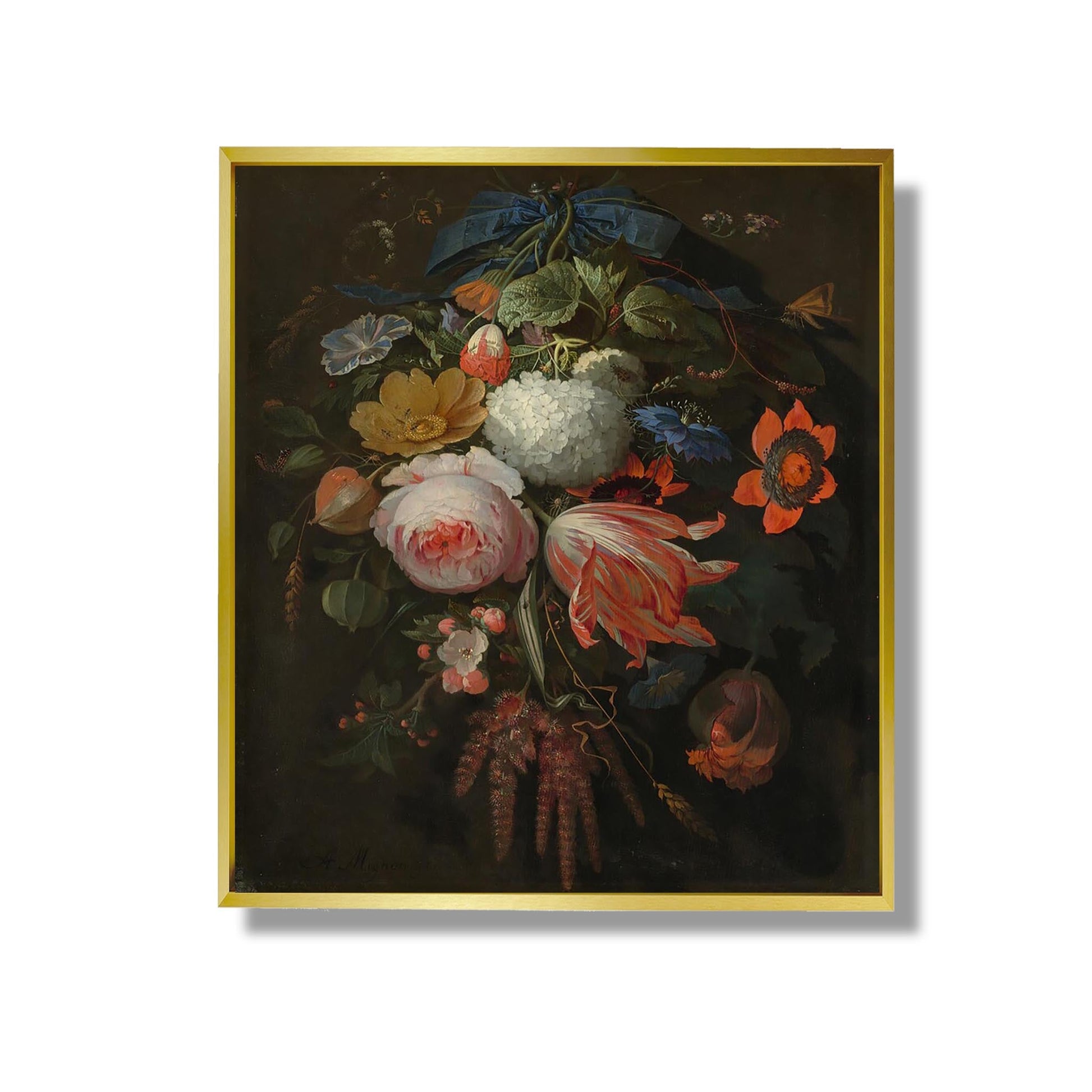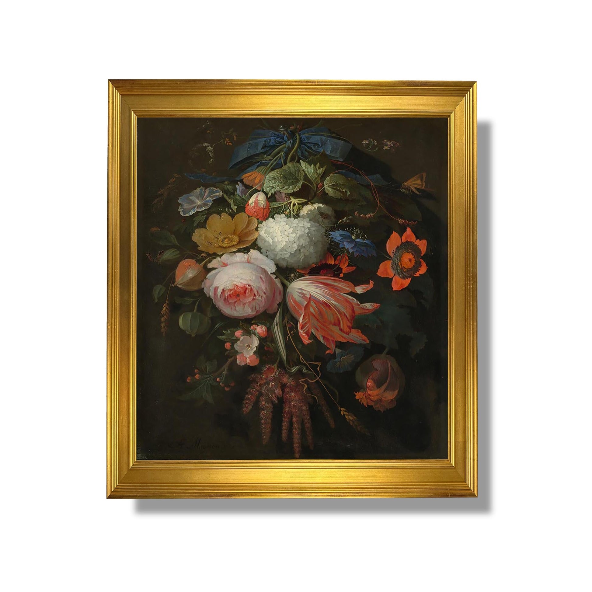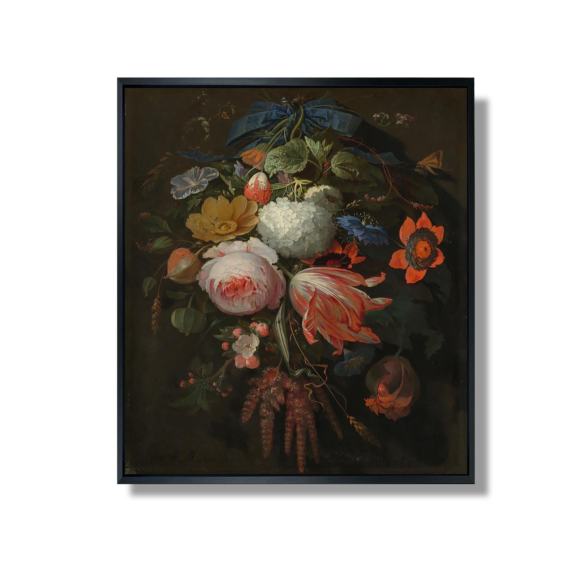 „Ein hängender Blumenstrauß“ von Abraham Mignon ist ein ikonisches Werk aus dem 17. Jahrhundert und veranschaulicht das außergewöhnliche Talent dieses niederländischen Künstlers auf dem Gebiet der Stillleben. Dieses farbenfrohe und detailreiche Gemälde zeigt einen hängenden Blumenstrauß und hebt die vergängliche Schönheit der Natur hervor. Mignon, bekannt für seine Beherrschung von Texturen und Nuancen, verwendet verschiedene Blumen, um die Vielfalt und Zerbrechlichkeit des Lebens zu symbolisieren. Das Werk thematisiert auch Eitelkeit und erinnert uns daran, dass Schönheit oft vergänglich ist. Dieses Meisterwerk ist ein Beweis für Mignons Fähigkeit, das Wesen der Natur mit bemerkenswerter Präzision einzufangen.