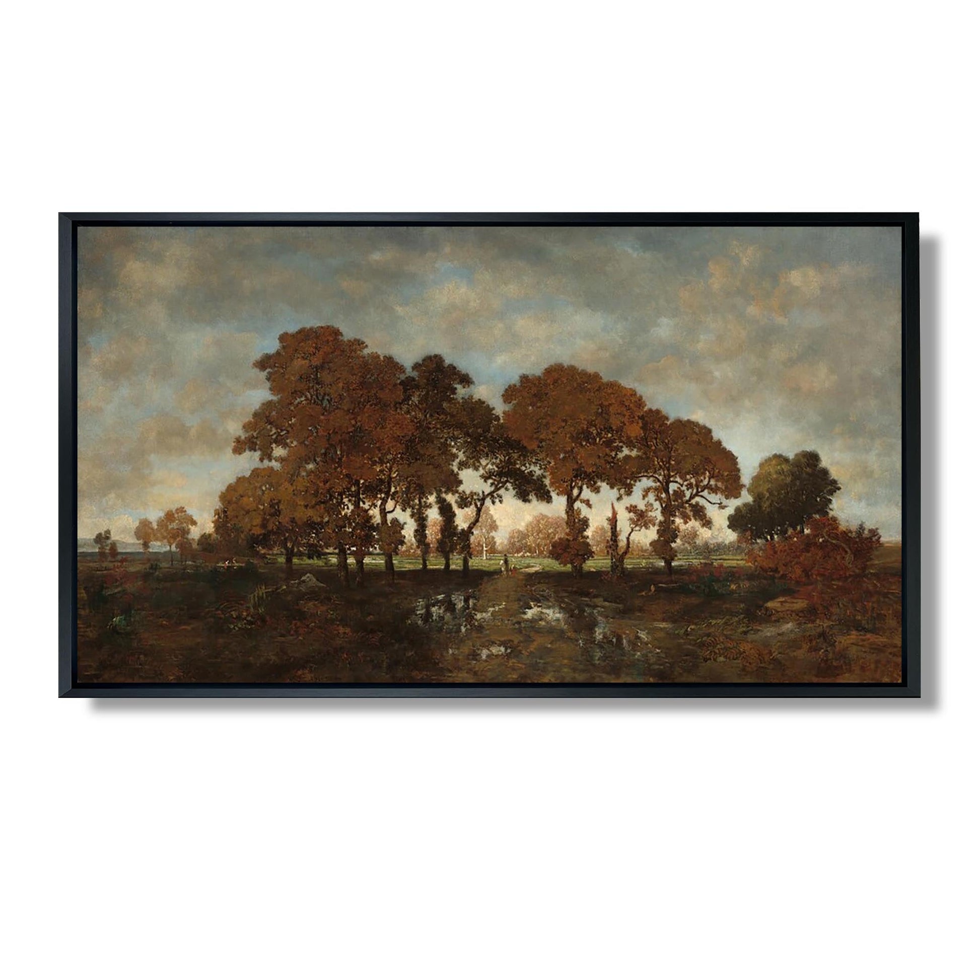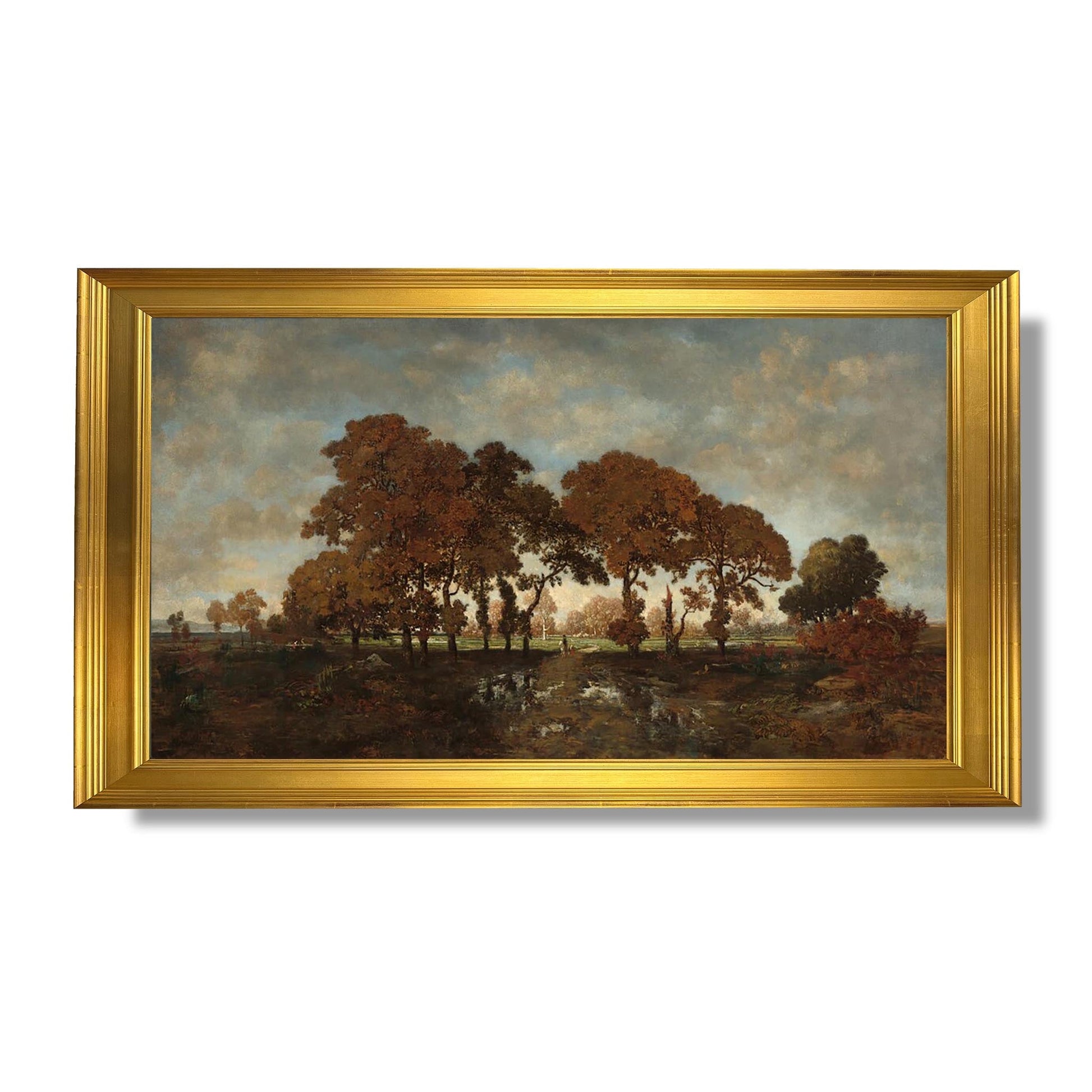 „Nach dem Regen“ ist ein ikonisches Werk von Théodore Rousseau, einem Meister der französischen Landschaftsmalerei des 19. Jahrhunderts. Dieses 1865 gemalte Gemälde auf Leinwand fängt die Schönheit einer ländlichen Landschaft ein, die im sanften Licht des jüngsten Regens getaucht ist. Rousseau, ein Mitglied der Schule von Barbizon, bevorzugte einen naturalistischen Ansatz und betonte den Reichtum an Farben und Texturen. Die majestätischen Bäume, der bewölkte Himmel und der feuchte Boden erzeugen eine Atmosphäre der Gelassenheit und Erneuerung. Dieses Werk illustriert perfekt Rousseaus Bestreben, die Natur in all ihrer Pracht darzustellen und demonstriert seinen tiefen Respekt für die Umwelt.
