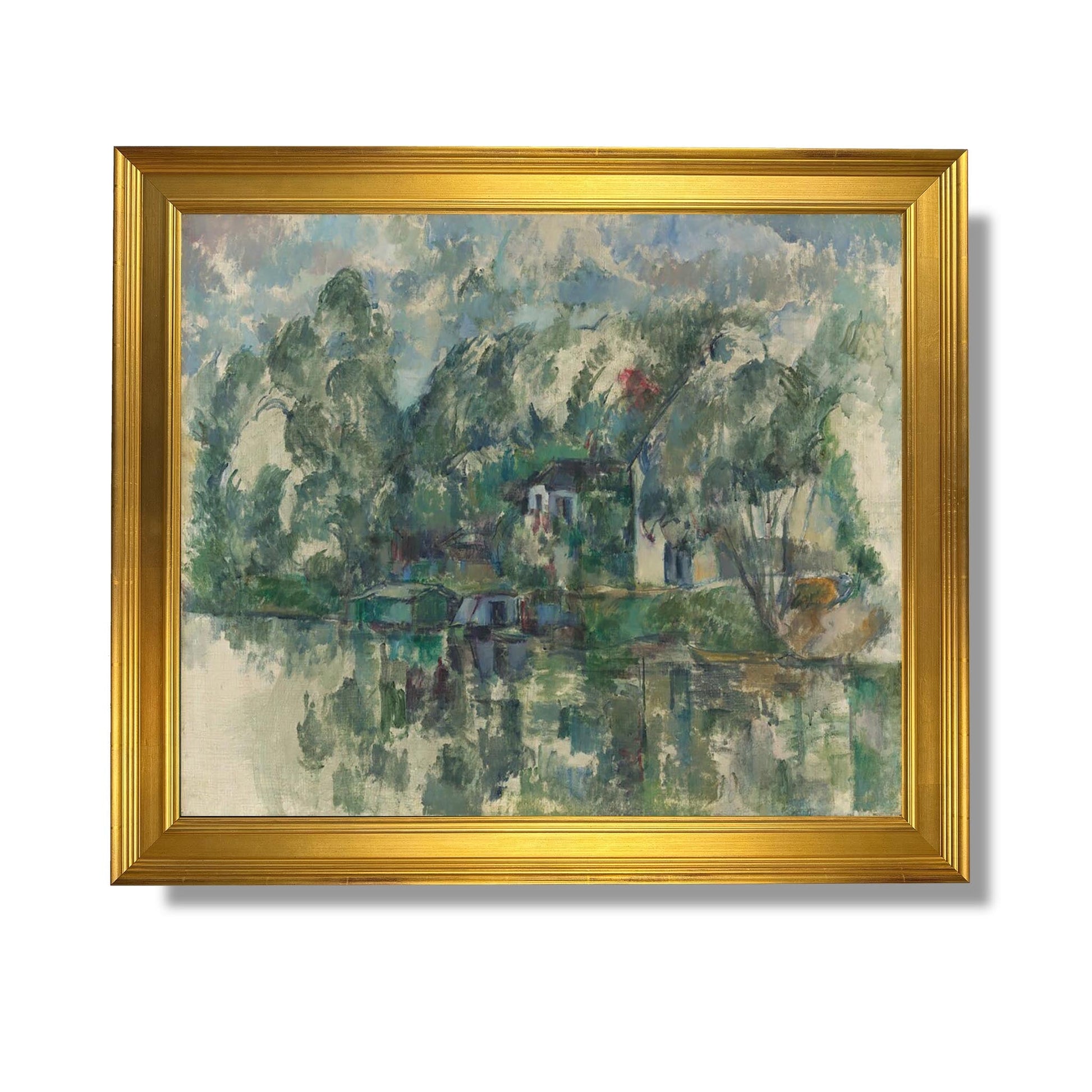„Au Bord de l'Eau“ ist ein ikonisches Werk von Paul Cézanne, das zwischen 1876 und 1877 gemalt wurde. Dieses Gemälde veranschaulicht den Übergang vom Impressionismus zum Postimpressionismus, der für Cézannes Stil charakteristisch ist. Die Szene zeigt eine friedliche Landschaft, in der die Natur durch lebendige Farben und geometrische Formen hervorgehoben wird. Bäume, Wasser und Himmel verschmelzen zu einer subtilen Harmonie und spiegeln die Besessenheit des Künstlers von Struktur und Perspektive wider. Cézanne lädt den Betrachter ein, über die schlichte Schönheit der Natur nachzudenken und gleichzeitig die Beziehungen zwischen den Elementen zu erkunden.