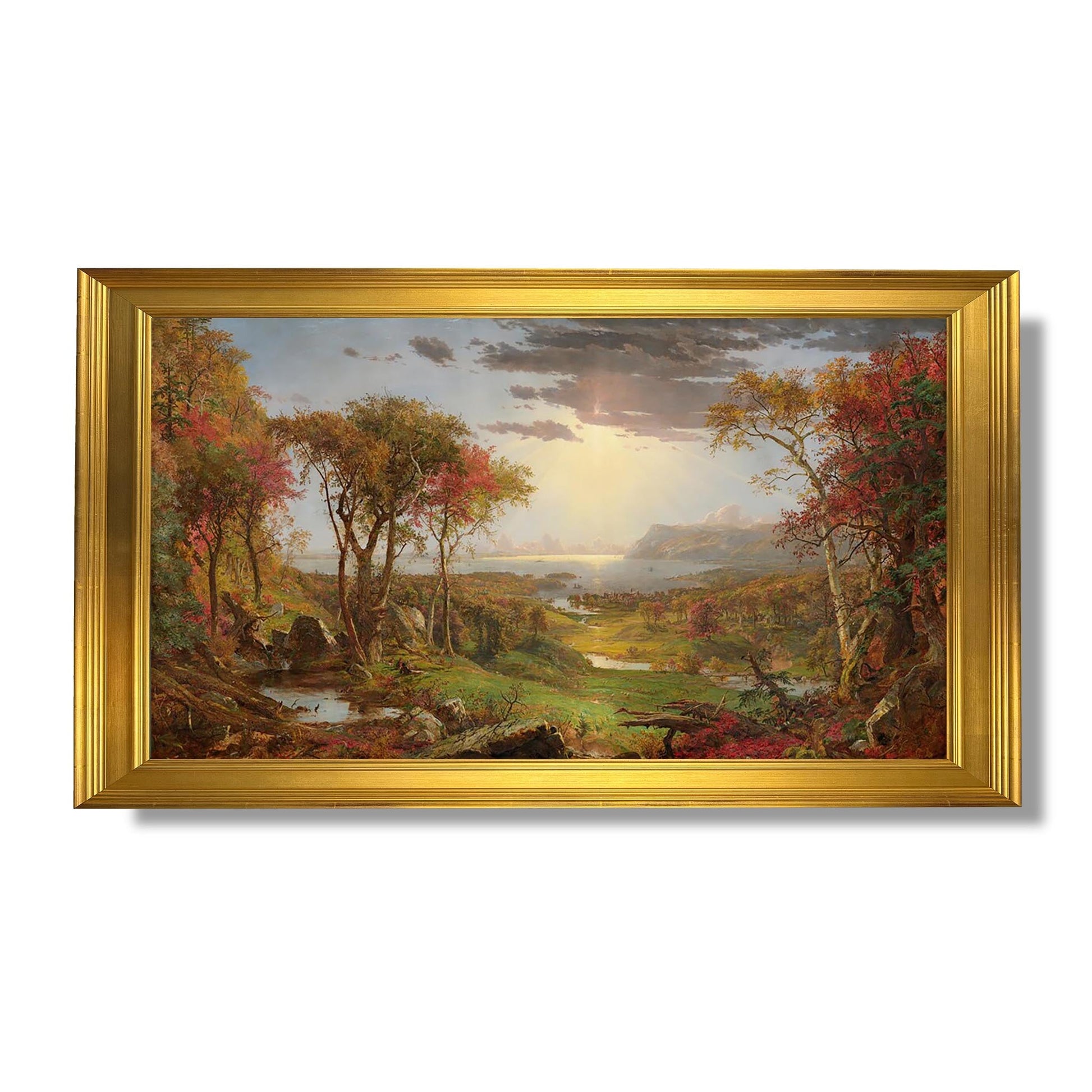 „Herbst – am Hudson River“ ist ein ikonisches Werk von Jasper Francis Cropsey, einem amerikanischen Maler des 19. Jahrhunderts, der für seine romantischen Landschaften bekannt ist. Dieses 1860 gemalte Gemälde fängt die leuchtende Schönheit des Herbstes am Hudson River ein. Cropsey verwendet leuchtende Farben und kleinste Details, um die Ruhe und Erhabenheit der Natur hervorzurufen. Die Bäume mit ihrem leuchtenden Laub, der helle Himmel und die Spiegelungen im Wasser schaffen eine friedliche Atmosphäre. Dieses Werk illustriert perfekt die Harmonie zwischen Mensch und Natur, ein zentrales Thema in Cropseys Kunst.