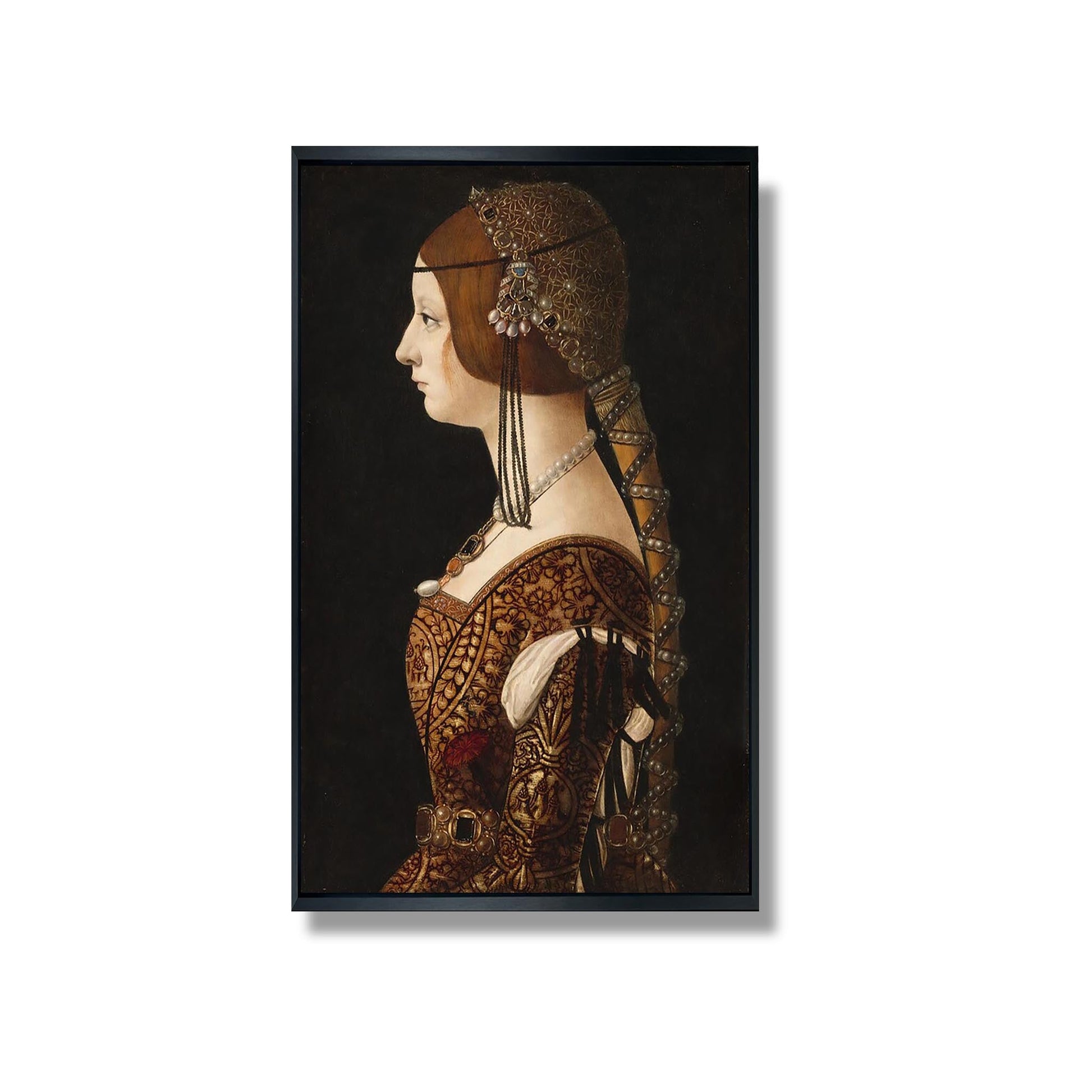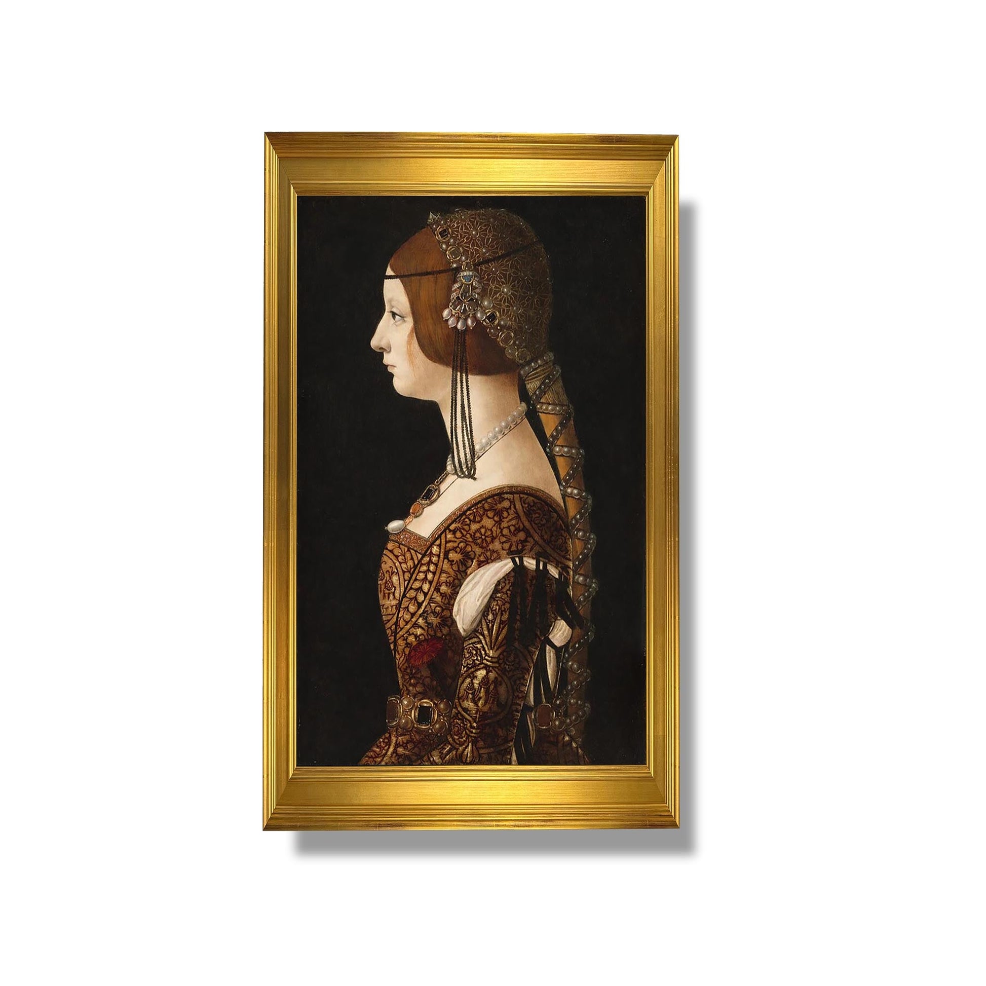 Das um 1490 entstandene Werk „Bianca Maria Sforza“ von Ambrogio de Predis ist ein emblematisches Porträt der italienischen Renaissance. Dieses Gemälde zeigt Bianca Maria Sforza, eine Mailänder Adlige, mit akribischer Liebe zum Detail und einer zarten Farbpalette. Das von Gelassenheit erfüllte Gesicht der jungen Frau wird von einem reich verzierten Kopfschmuck umrahmt, der ihren Status symbolisiert. De Predis verwendet Licht und Schatten, um eine beeindruckende Tiefe zu erzeugen, während der neutrale Hintergrund die Schönheit seines Motivs hervorhebt. Dieses Werk veranschaulicht das weibliche Schönheitsideal der damaligen Zeit und zeugt vom außergewöhnlichen Talent des Künstlers.