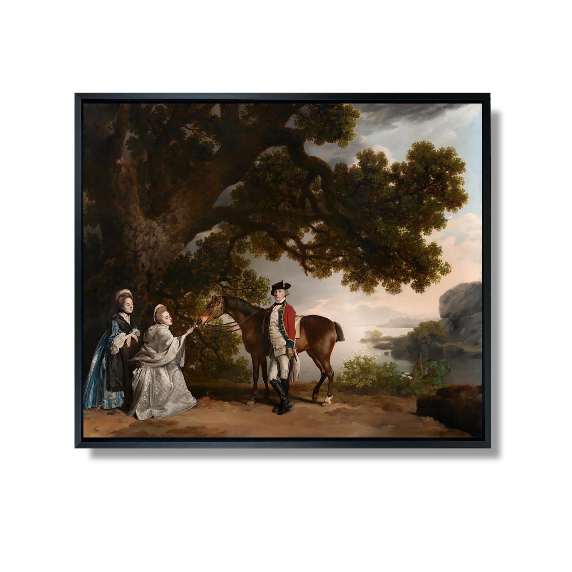 George Stubbs‘ um 1780 entstandenes Gemälde „Captain Samuel Sharpe Pocklington mit seiner Frau Pleasance und möglicherweise seiner Schwester Frances“ veranschaulicht das außergewöhnliche Talent des Künstlers, das aristokratische Leben seiner Zeit einzufangen. Dieses Porträt zeigt Captain Pocklington, umgeben von seiner Frau und einer Frau, die seine Schwester sein könnte. Stubbs, berühmt für seine Pferdedarstellungen, zeichnet sich hier durch die Wiedergabe menschlicher Emotionen und Kleidungsdetails aus. Die harmonische Komposition und der subtile Einsatz von Licht zeigen sein Geschick, eine intime Atmosphäre zu schaffen und gleichzeitig das georgische Gesellschafts- und Familienleben zu zelebrieren.