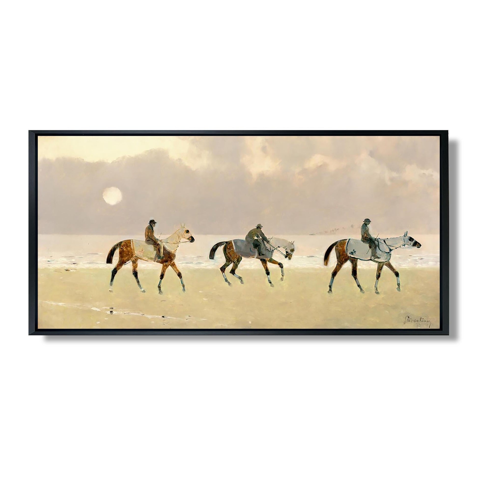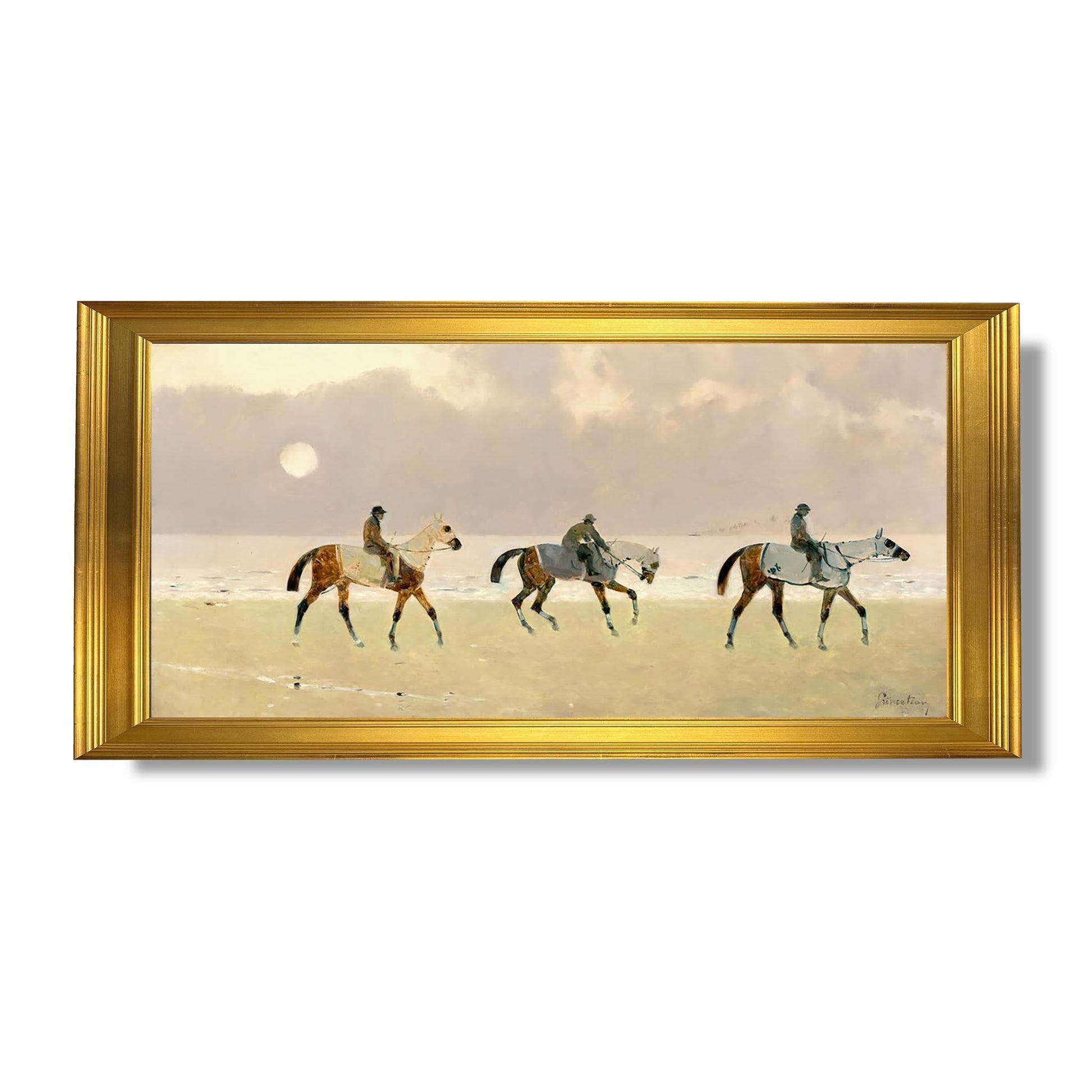 René Pierre Charles Princeteau, ein französischer Maler des 19. Jahrhunderts, ist für seine fesselnden Werke bekannt, die das alltägliche Leben und Seestücke einfangen. In „Reiter am Strand von Dieppe“ schildert er eine lebendige Szene von Reitern, die sich am Ufer entlang bewegen und dabei sowohl Freiheit als auch Eleganz hervorrufen. Das sanfte Licht der untergehenden Sonne spiegelt sich in den Wellen und schafft eine friedliche Atmosphäre. Princeteau verwendet leuchtende Farben und sorgfältige Details, um die Energie der Szene zu vermitteln und gleichzeitig der natürlichen Schönheit der Küste der Normandie zu huldigen. Dieses Werk veranschaulicht sein Talent, flüchtige Momente des Lebens zu verewigen.