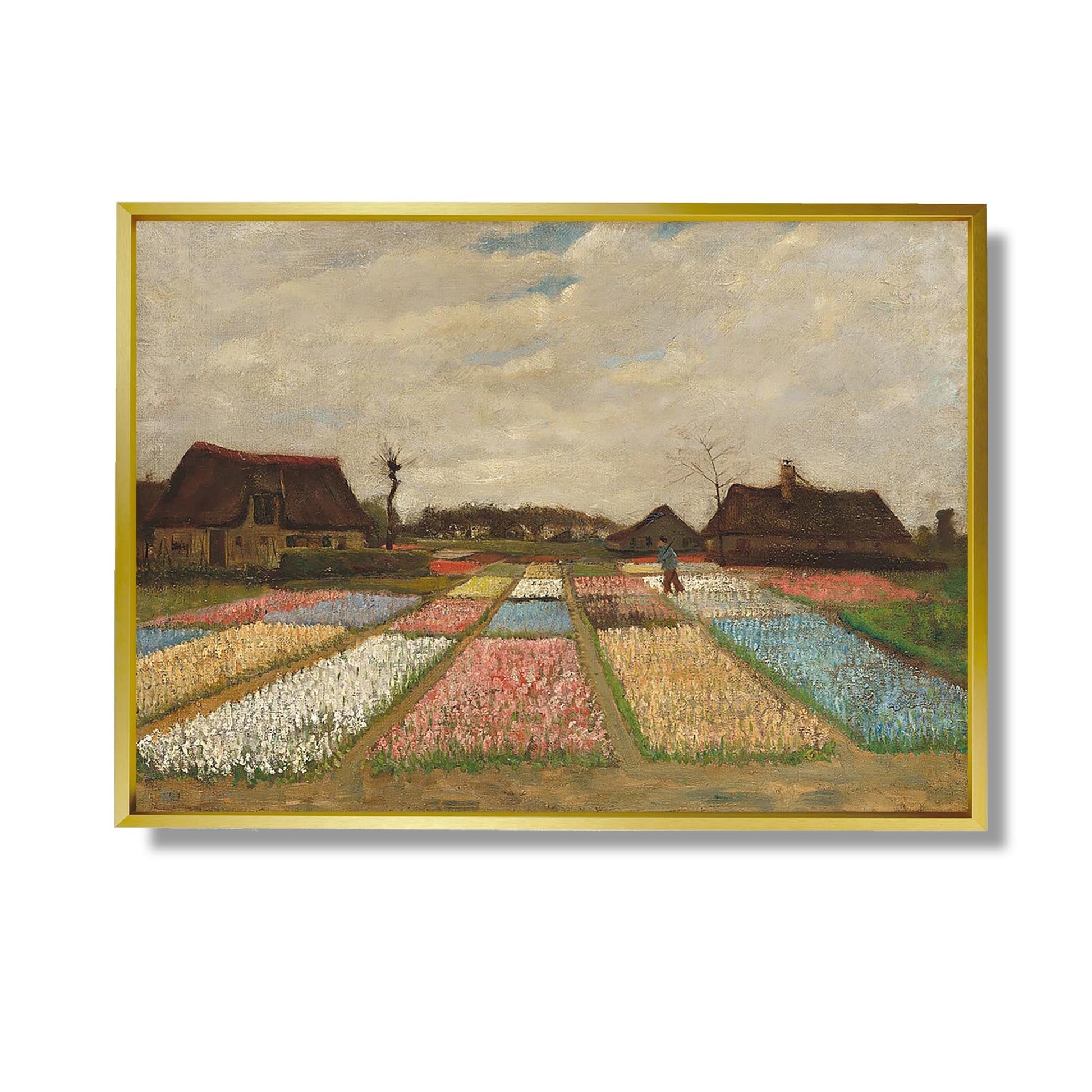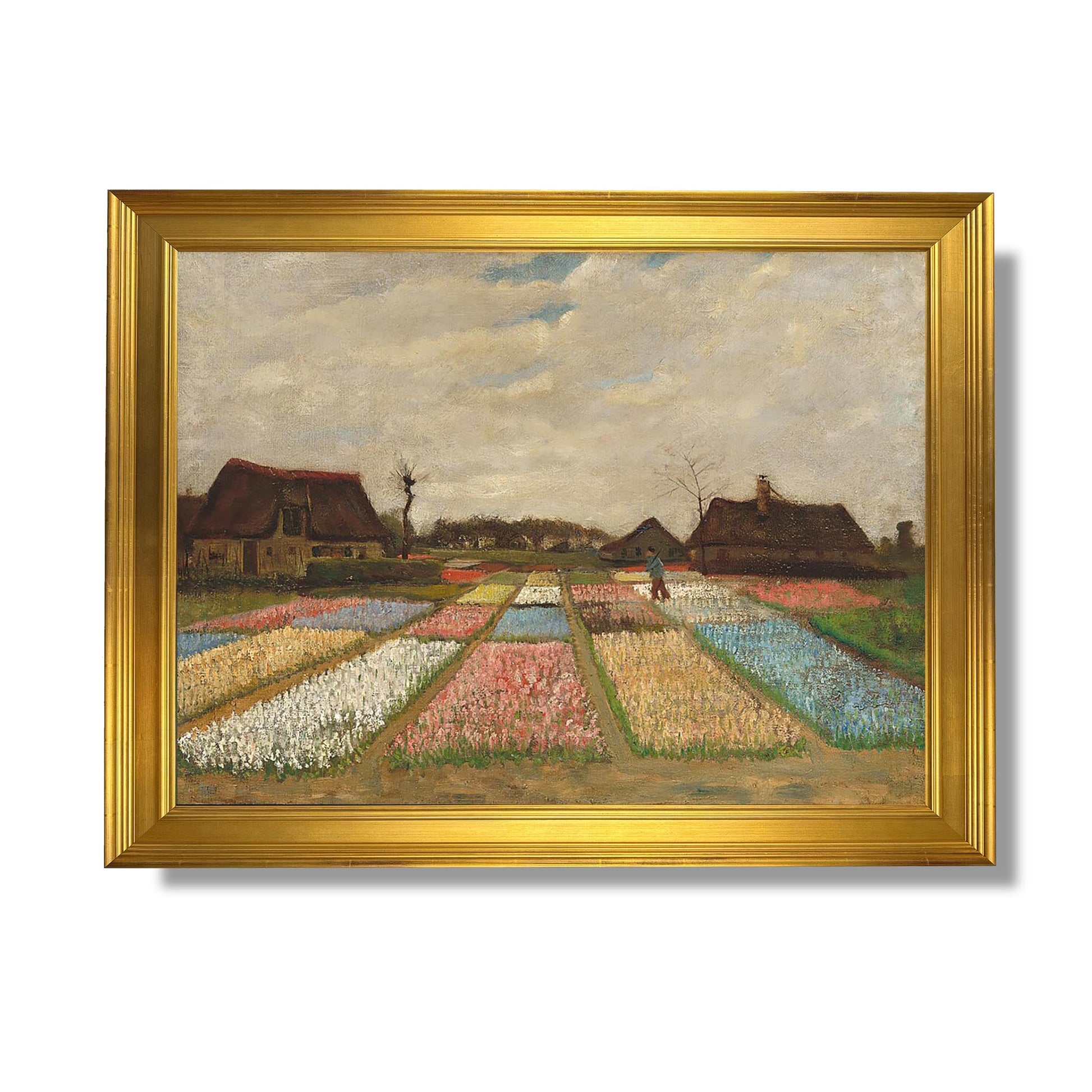 „Blumenfelder in Holland“ ist ein ikonisches Werk von Vincent Van Gogh, gemalt im Jahr 1883. Dieses Gemälde illustriert die Leidenschaft des Künstlers für die Natur und seine Faszination für Blumenlandschaften. Die leuchtenden Farben und dynamischen Pinselstriche zeugen von seinem postimpressionistischen Stil. Van Gogh fängt die Schönheit der Blumenfelder mit emotionaler Intensität ein und ruft sowohl Freude als auch Melancholie hervor. Dieses Werk spiegelt seinen Wunsch wider, die Vitalität des Lebens durch die Natur zu vermitteln und stellt zugleich seine künstlerische Entwicklung hin zu gewagteren und ausdrucksstärkeren Kompositionen vorweg.