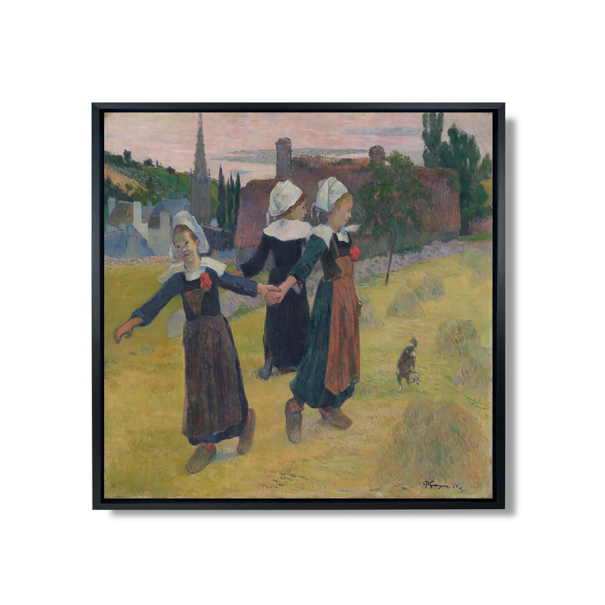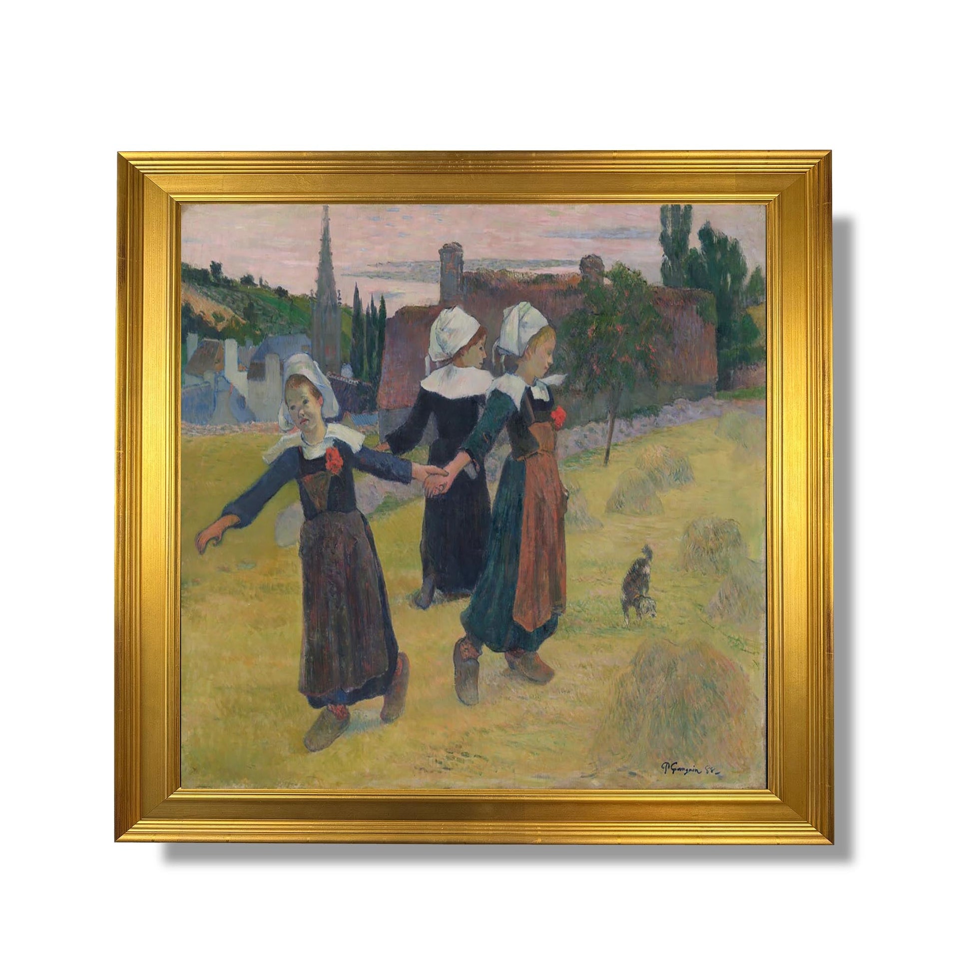 „Tanz der bretonischen Mädchen, Pont-Aven“ ist ein emblematisches Werk von Paul Gauguin aus dem Jahr 1890. Dieses Gemälde veranschaulicht die Faszination des Künstlers für die bretonische Kultur und ihre Traditionen. In einer lebendigen Komposition stellt Gauguin junge Frauen in traditionellen Kostümen dar, die fröhlich inmitten einer ländlichen Landschaft tanzen. Die hellen Farben und stilisierten Formen spiegeln seinen postimpressionistischen Ansatz wider, bei dem es eher darum geht, Emotionen als die Realität auszudrücken. Dieses Werk spiegelt seinen Wunsch nach Flucht und seine Suche nach Authentizität wider und nimmt zugleich moderne Kunstbewegungen vorweg.