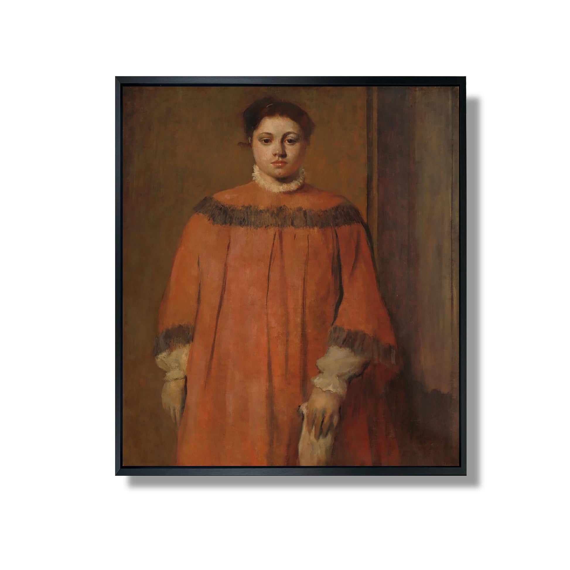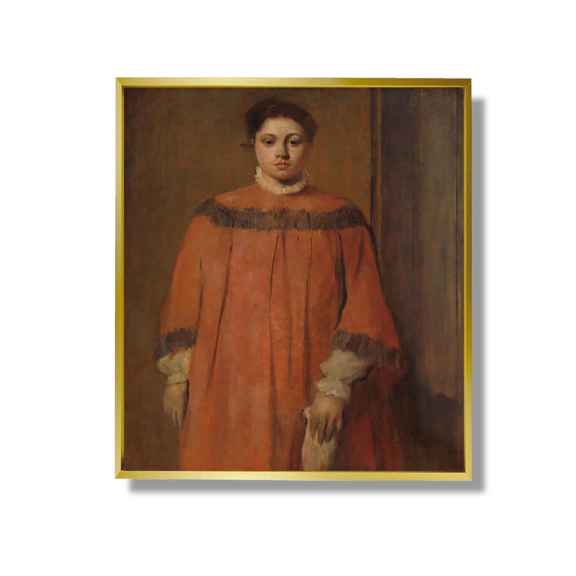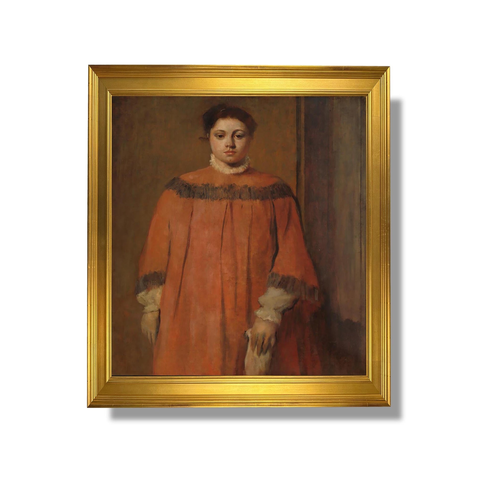 Edgar Degas, Meister des Impressionismus, schuf um 1890 „Frau in Rot“, ein ikonisches Werk, das sein Interesse an der Darstellung des modernen Lebens veranschaulicht. Dieses Gemälde zeigt eine elegante Frau in einem roten Kleid in einem Moment der Kontemplation. Die dynamische Komposition mit lebendigen Farbtupfern und Lichtspielen unterstreicht die Sinnlichkeit und Anmut des Motivs. Degas, bekannt für seine Studien von Bewegung und Haltung, verwendet kräftige Winkel, um ein Gefühl von Tiefe zu erzeugen, was diesem Werk sowohl intim als auch universell macht.