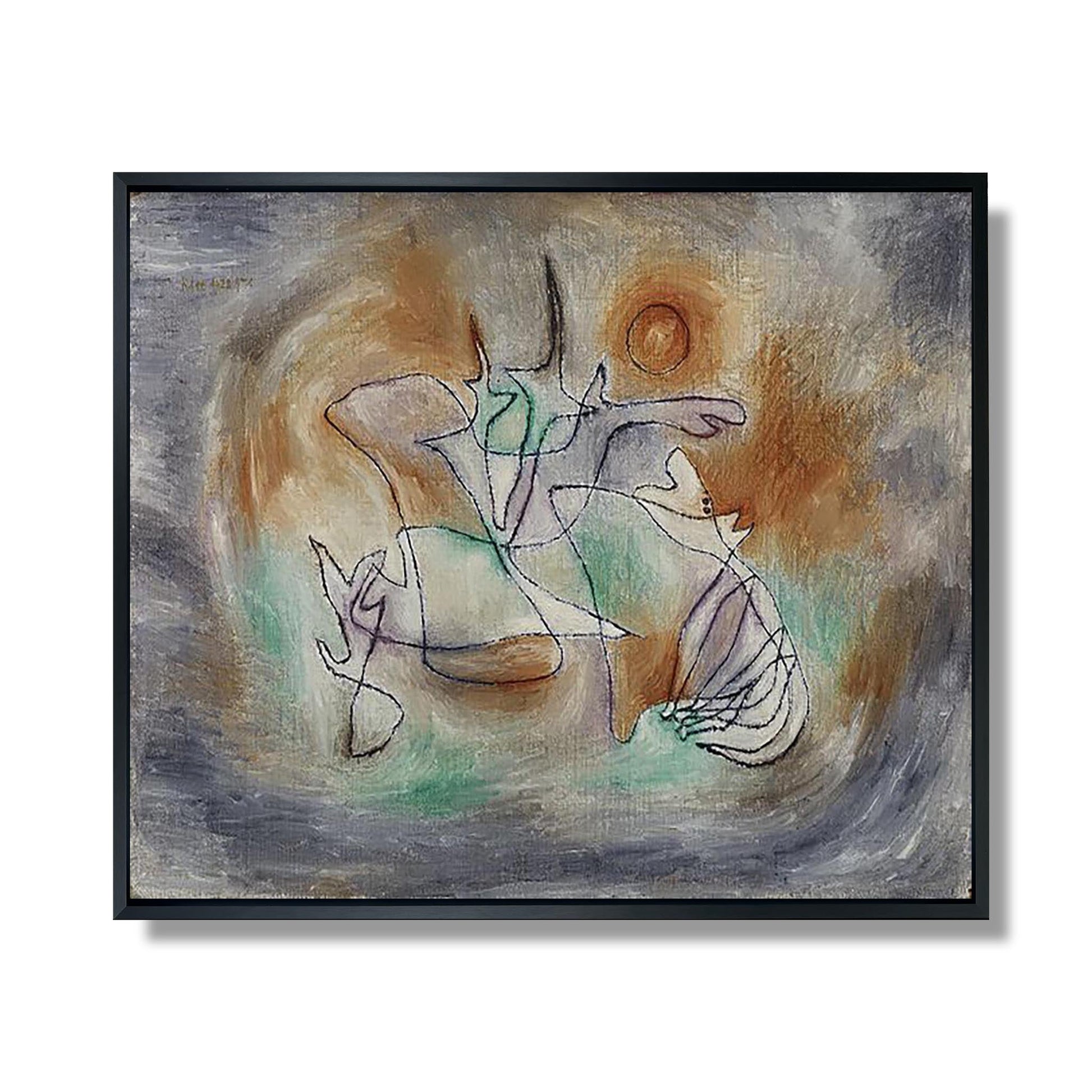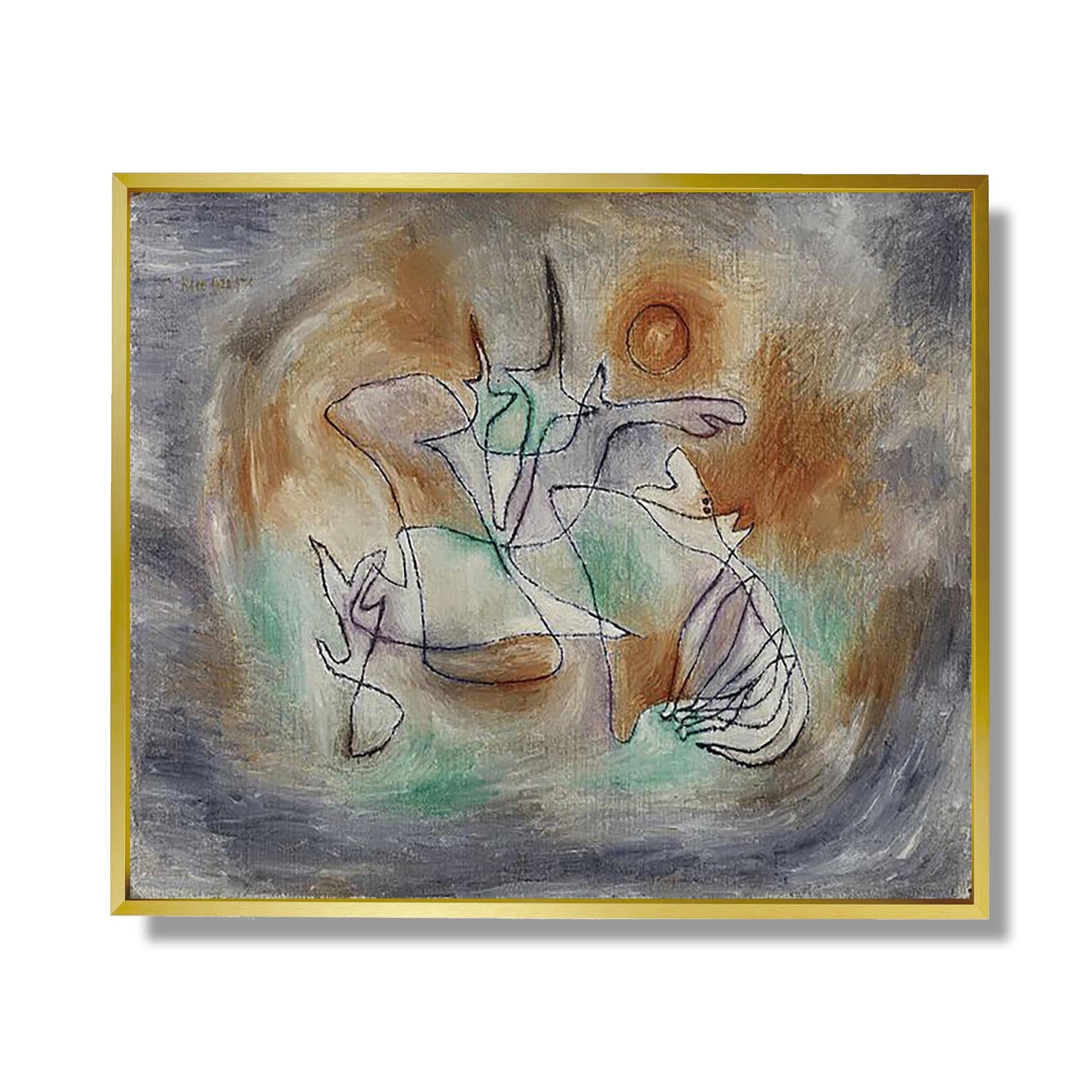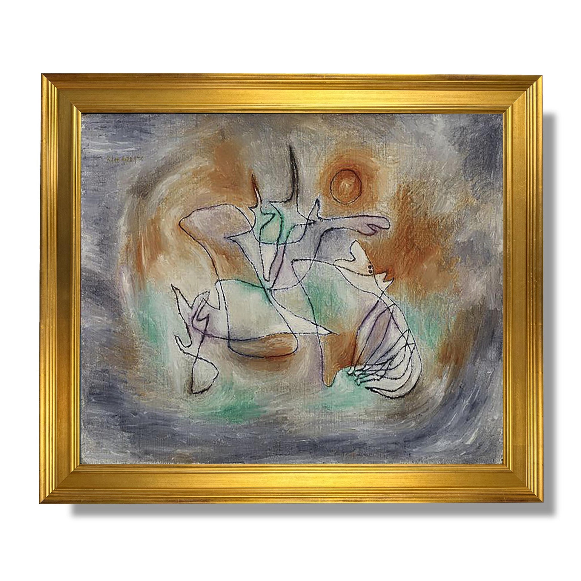 „Fischzauber“ ist ein ikonisches Werk von Paul Klee, das 1925 entstand. Dieses Gemälde, das Abstraktion und Figuration vereint, veranschaulicht die Faszination des Künstlers für die Wasserwelt und Träume. Klee verwendet leuchtende Farben und stilisierte Formen, um ein traumhaftes Universum zu erschaffen, in dem Fische in einem geheimnisvollen Raum schweben. Geometrische Muster und gewundene Linien erzeugen eine magische Atmosphäre und laden den Betrachter ein, in eine Welt der Symbole und der Fantasie einzutauchen. Dieses Werk spiegelt die Bedeutung des Unbewussten und der Poesie in Klees Kunst wider.