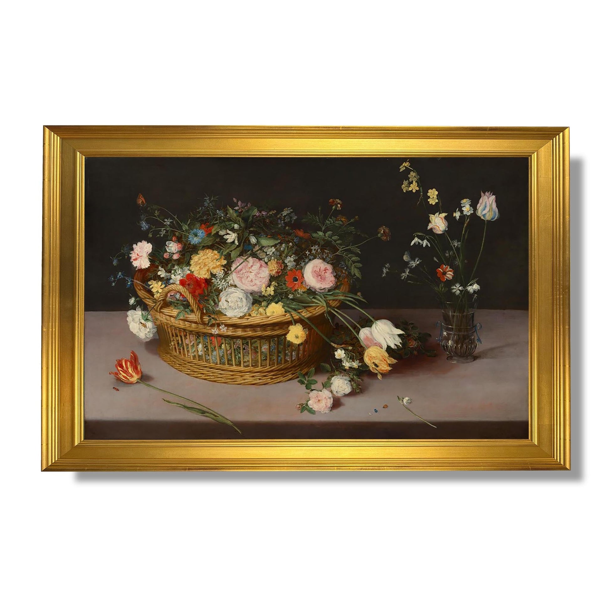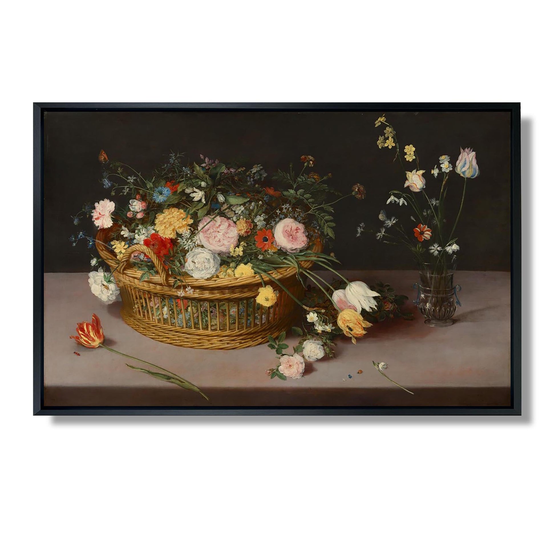 „Blumen in einem Korb und einer Vase“ ist ein ikonisches Werk von Jan Brueghel dem Älteren, einem flämischen Meister des 17. Jahrhunderts. Dieses um 1600 entstandene Gemälde veranschaulicht die Virtuosität des Künstlers in der Blumendarstellung. Brueghel stellt eine Fülle von Blumen dar, die sorgfältig in einem Korb und einer Vase arrangiert sind, und hebt so die Artenvielfalt und den Reichtum der Farben hervor. Jedes Detail, von zarten Blütenblättern bis zu üppigen Blättern, ist ein Beweis seiner sorgfältigen Beobachtung der Natur. Dieses Werk vereint Schönheit und Symbolik und erinnert an die Zerbrechlichkeit des Lebens und die vergängliche Schönheit der Blumen.