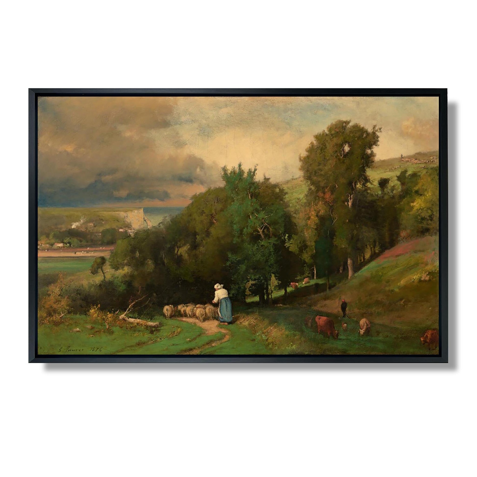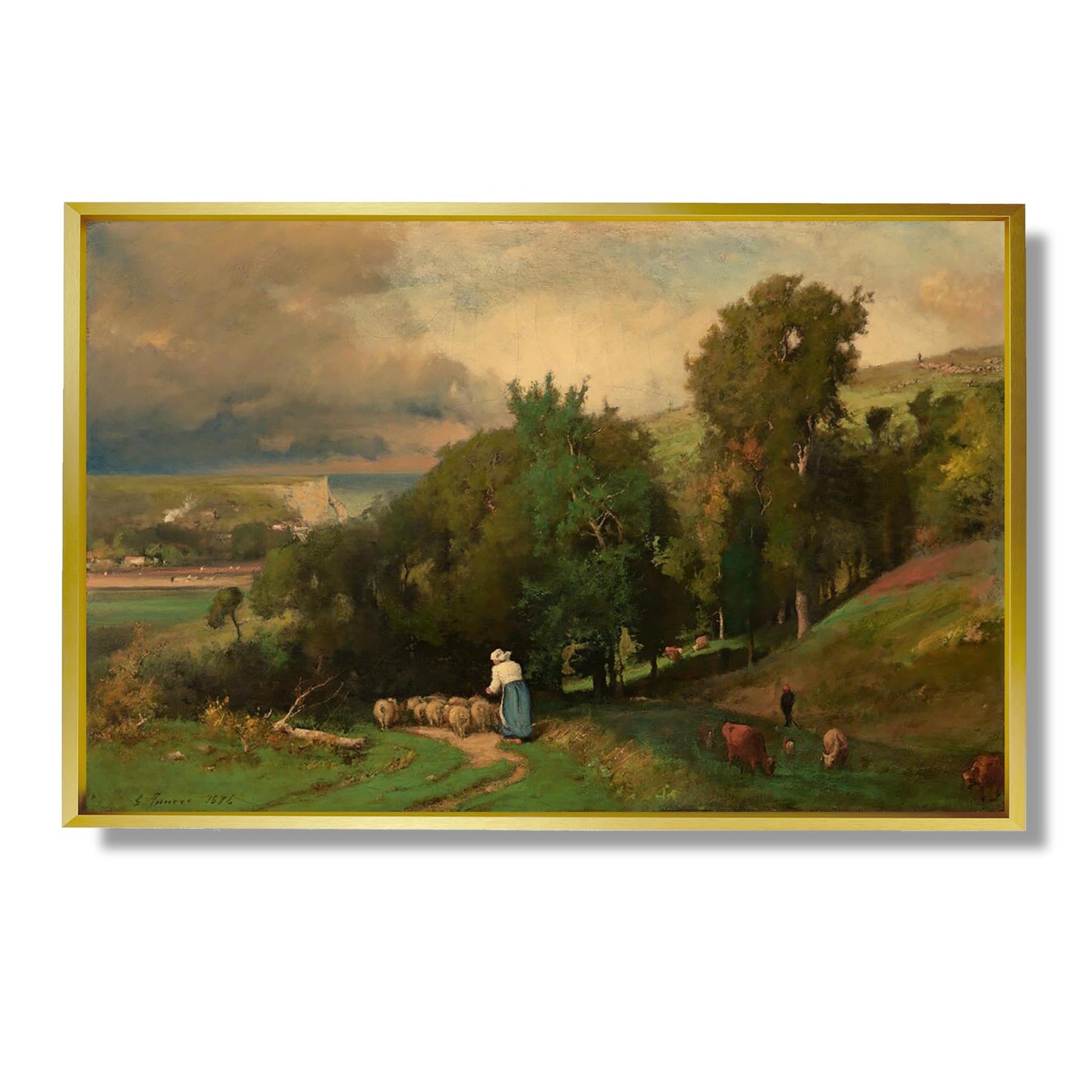 „Hillside at Étretat“ ist ein ikonisches Werk von George Inness, einem amerikanischen Maler des 19. Jahrhunderts, der für seinen impressionistischen Ansatz und seine Fähigkeit, Licht und Atmosphäre einzufangen, bekannt ist. In diesem Gemälde stellt Inness die Küstenlandschaft von Étretat in Frankreich mit ihren majestätischen Klippen und der üppigen Vegetation dar. Die sanfte Farbpalette und die fließenden Pinselstriche erzeugen eine heitere und besinnliche Stimmung. Das Werk spiegelt die Harmonie zwischen Mensch und Natur wider, ein zentrales Thema in Inness‘ Arbeit, die durch die Schönheit der natürlichen Welt tiefe Emotionen hervorrufen möchte.