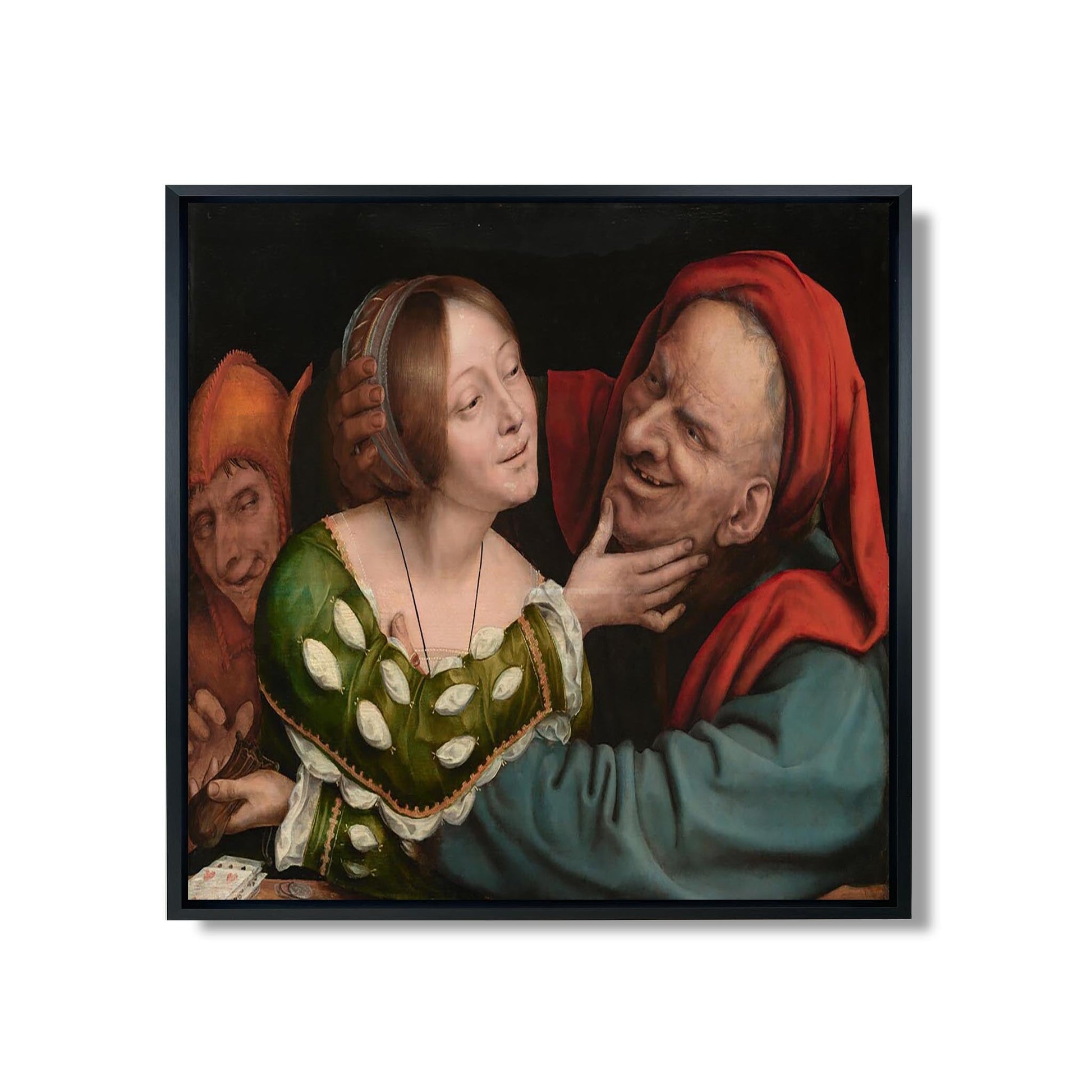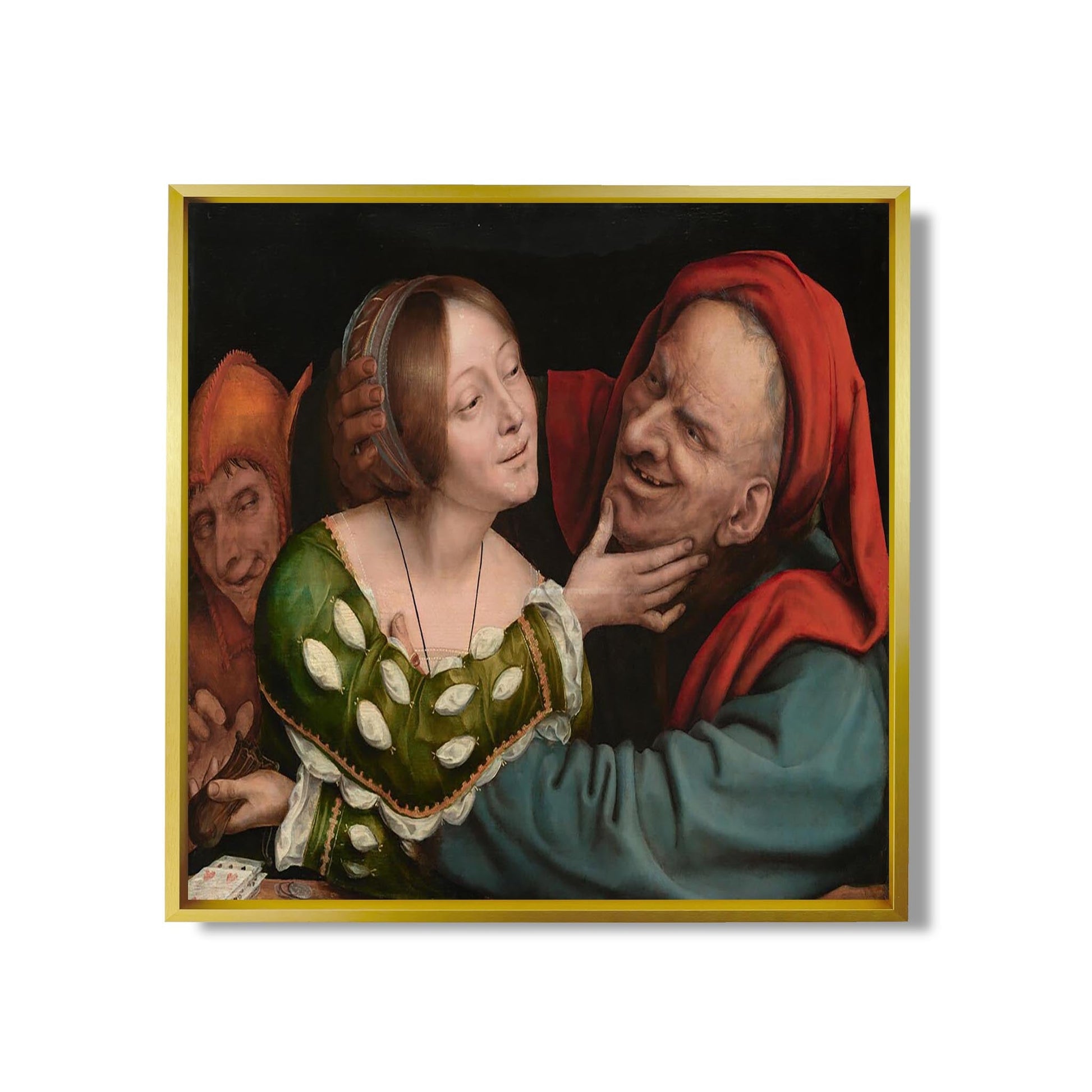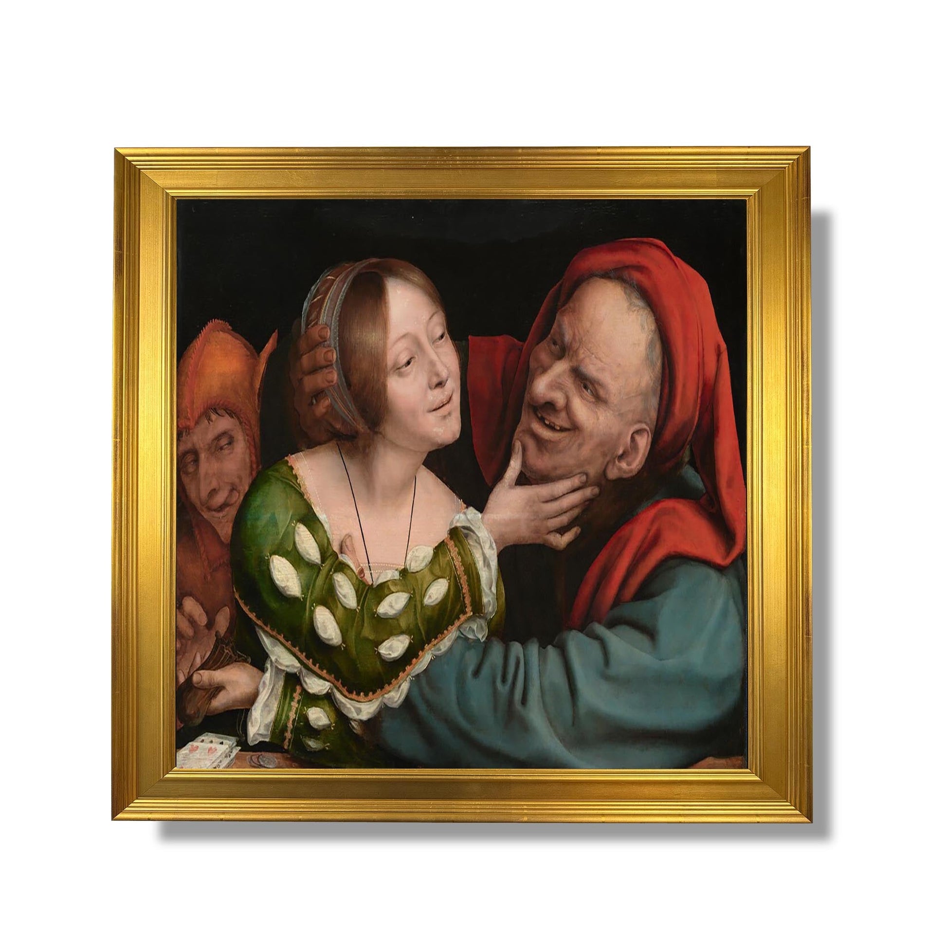 „Ungleiche Liebende“ ist ein ikonisches Werk von Quentin Massys, einem Meister der flämischen Malerei des 16. Jahrhunderts. Dieses um 1520 gemalte Gemälde zeigt die Begegnung zweier Liebender mit gegensätzlichen Eigenschaften und symbolisiert die Spannung zwischen Verlangen und Vernunft. Die Komposition hebt kleinste Details, emotionsgeladene Gesichtsausdrücke und einen subtilen Einsatz von Licht hervor. Durch die Integration von Elementen des alltäglichen Lebens lädt Massys den Betrachter dazu ein, über die Dynamik menschlicher Beziehungen nachzudenken und stellt dabei sein technisches Können und seine Beobachtungsgabe unter Beweis.