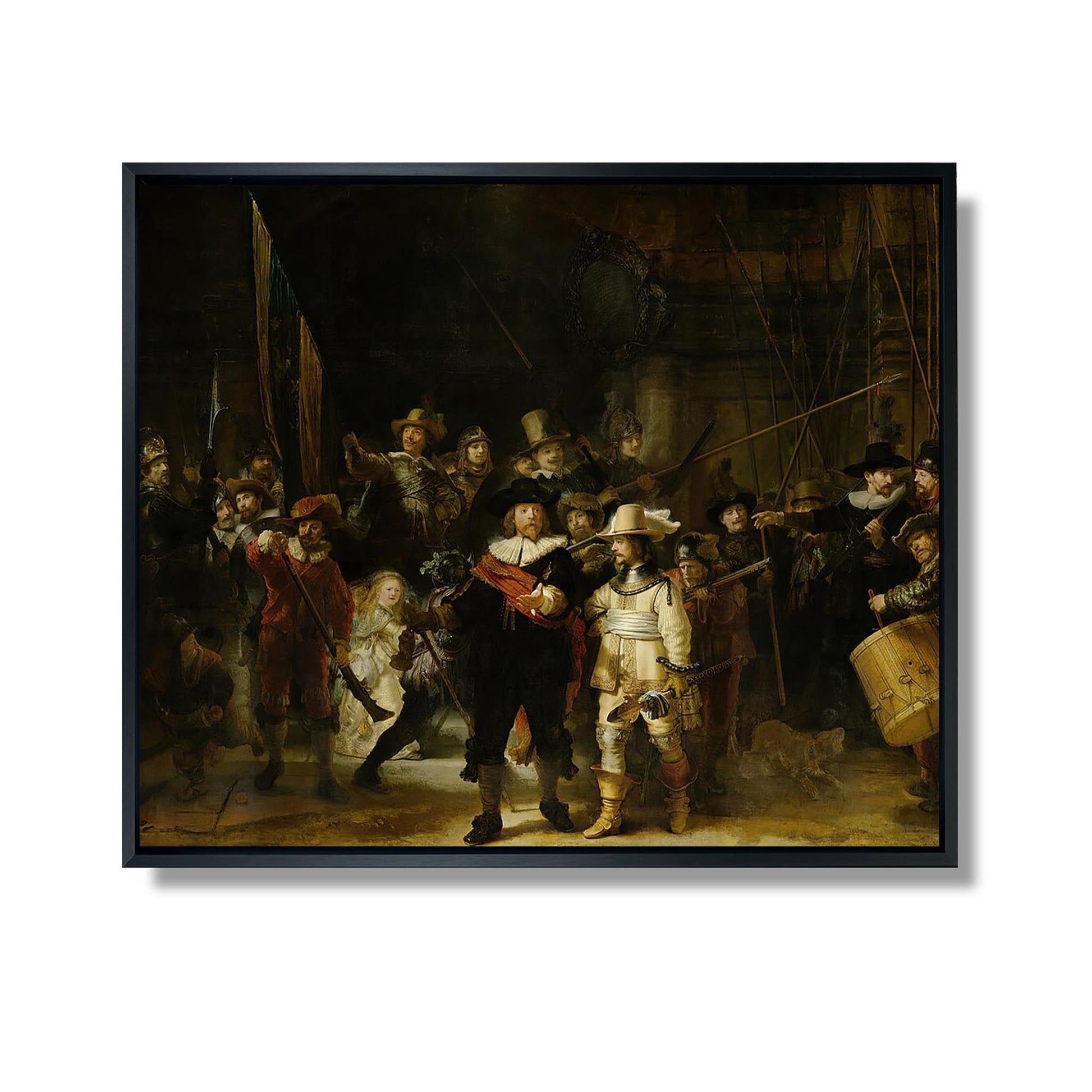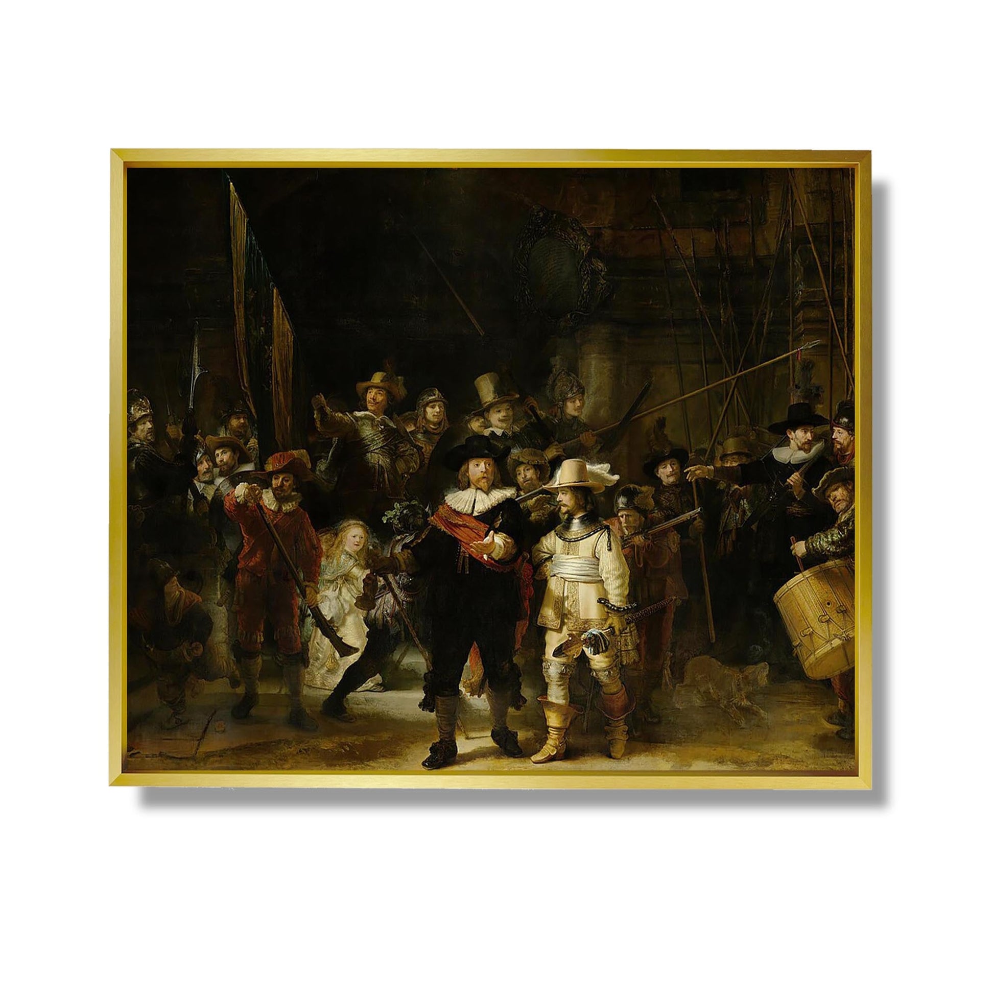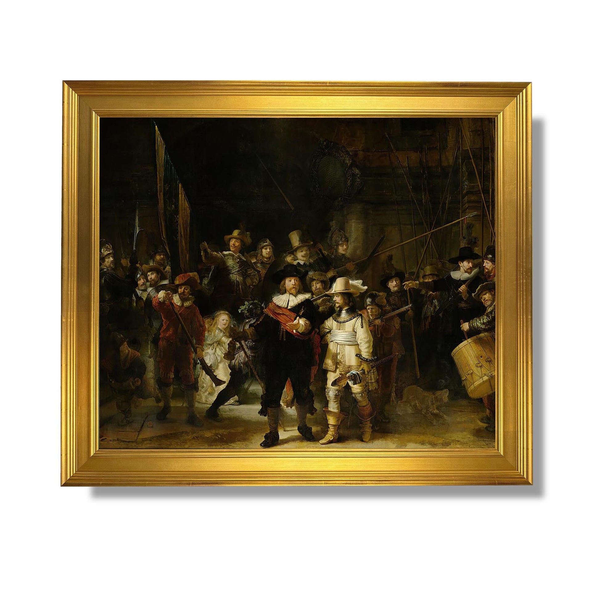 „Die Nachtwache“, 1642 von Rembrandt gemalt, ist ein emblematisches Werk des niederländischen Barock. Dieses monumentale Gemälde zeigt eine Kompanie Amsterdamer Milizionäre unter der Führung von Hauptmann Frans Banning Cocq und seinem Leutnant Willem van Ruytenburch. Entgegen den Konventionen seiner Zeit entschied sich Rembrandt dafür, einen dynamischen Moment festzuhalten, in dem die Figuren in einer von dramatischem Licht erhellten Nachtszene zum Leben zu erwachen scheinen. Die detailgetreuen Darstellungen der Kostüme und die Ausdrucksformen der Figuren zeugen von der technischen Meisterschaft des Künstlers. Dieses Werk veranschaulicht nicht nur Rembrandts Talent für Hell-Dunkel, sondern auch sein Interesse an der Psychologie der Charaktere, wodurch jede Figur einzigartig und lebendig wird.