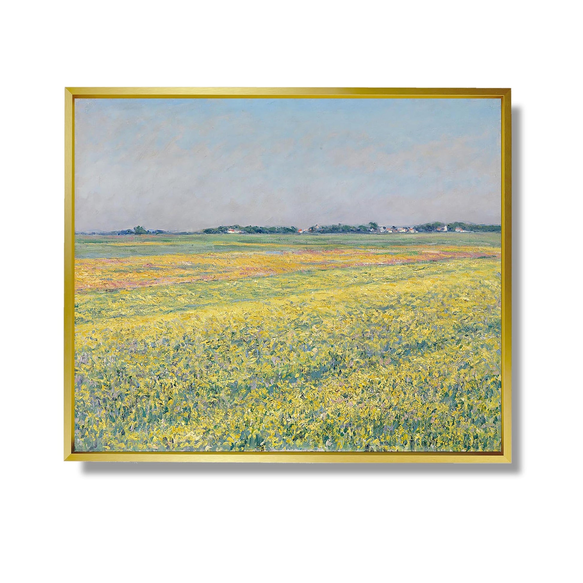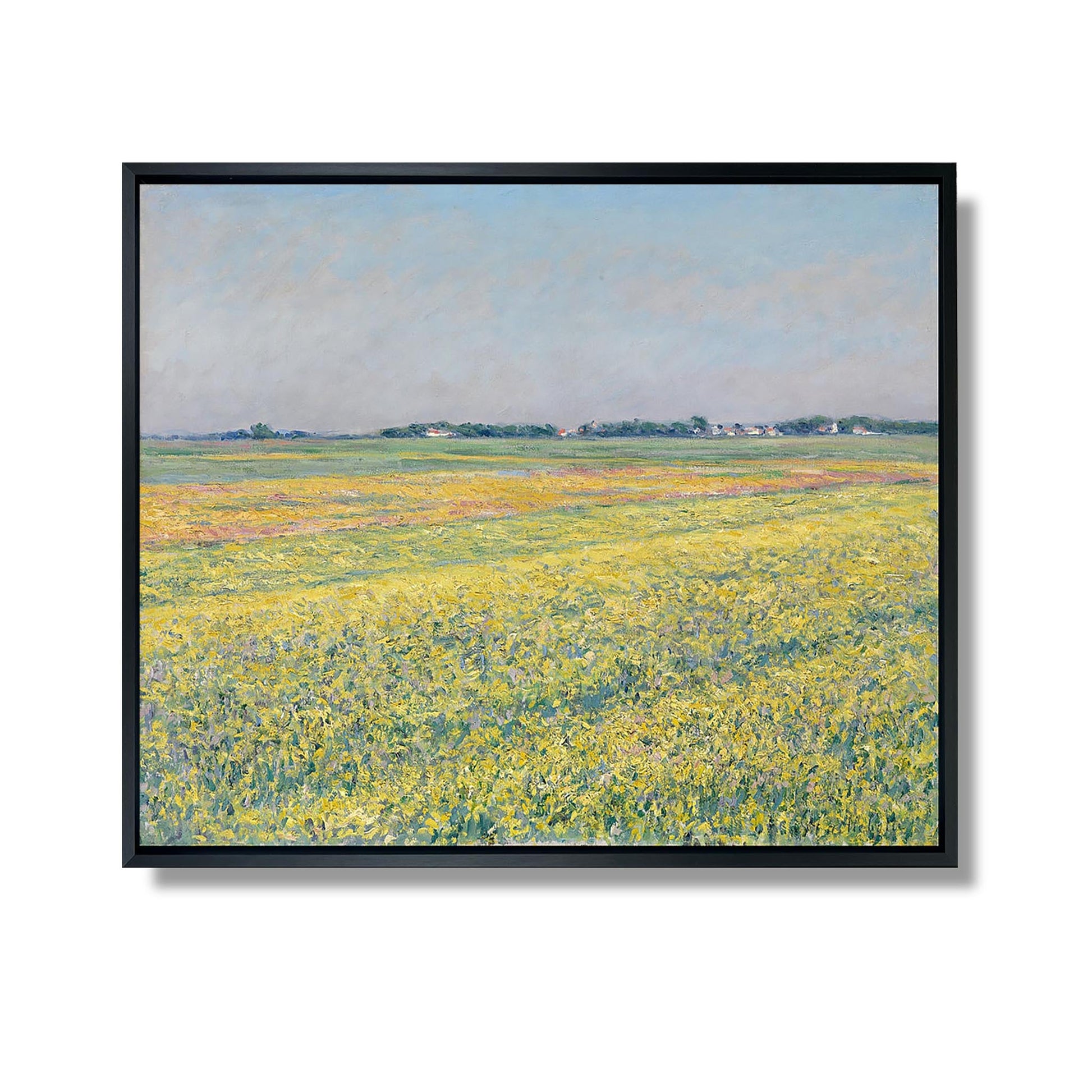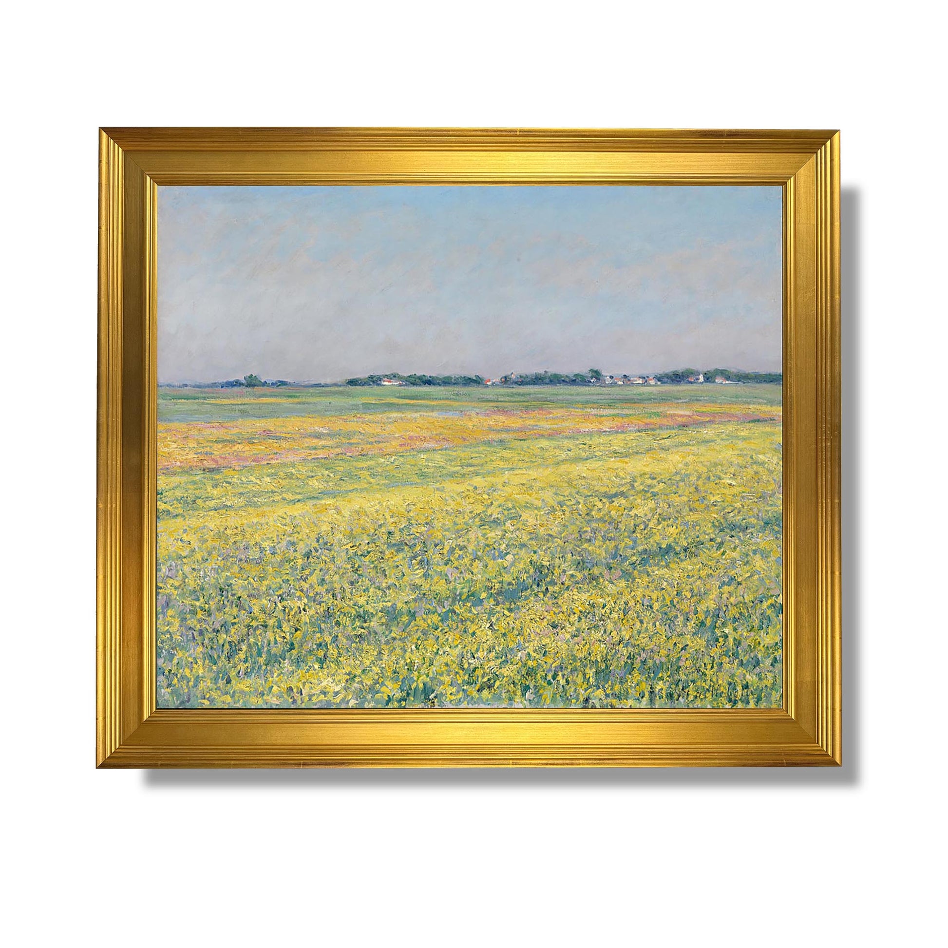 „Die Ebene von Gennevilliers, gelbe Felder“ ist ein ikonisches Werk von Gustave Caillebotte, gemalt im Jahr 1884. Dieses Gemälde zeigt die französische ländliche Landschaft, gekennzeichnet durch goldene Weizenfelder, die sich soweit das Auge reicht erstrecken. Caillebotte, bekannt für seinen realistischen Ansatz und seine meisterhafte Beherrschung des Lichts, fängt hier die schlichte Schönheit der Natur ein. Die Gelb- und Grüntöne erinnern an die Wärme des Sommers, während die dynamische Perspektive den Betrachter einlädt, in diese Landschaft einzutauchen. Dieses Werk zeigt das Interesse des Künstlers am täglichen Leben und der Veränderung ländlicher Räume während der Ära des Impressionismus.