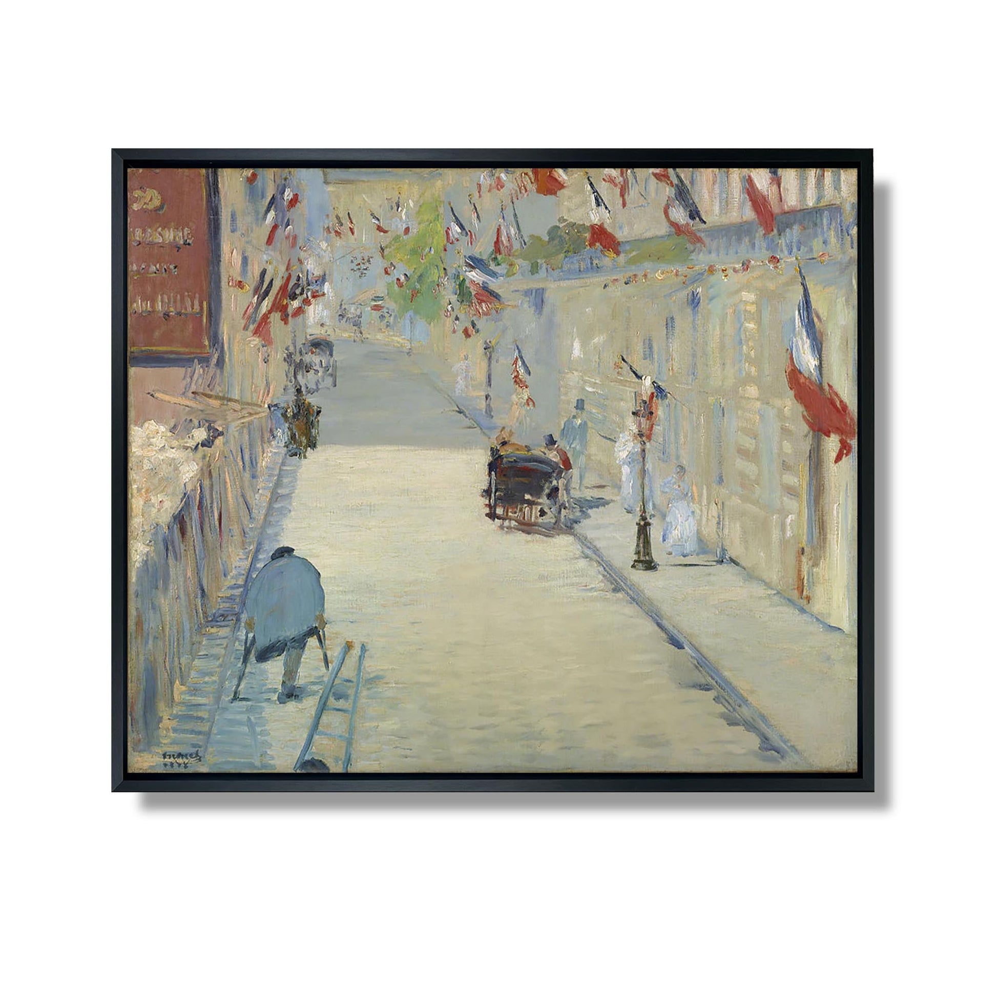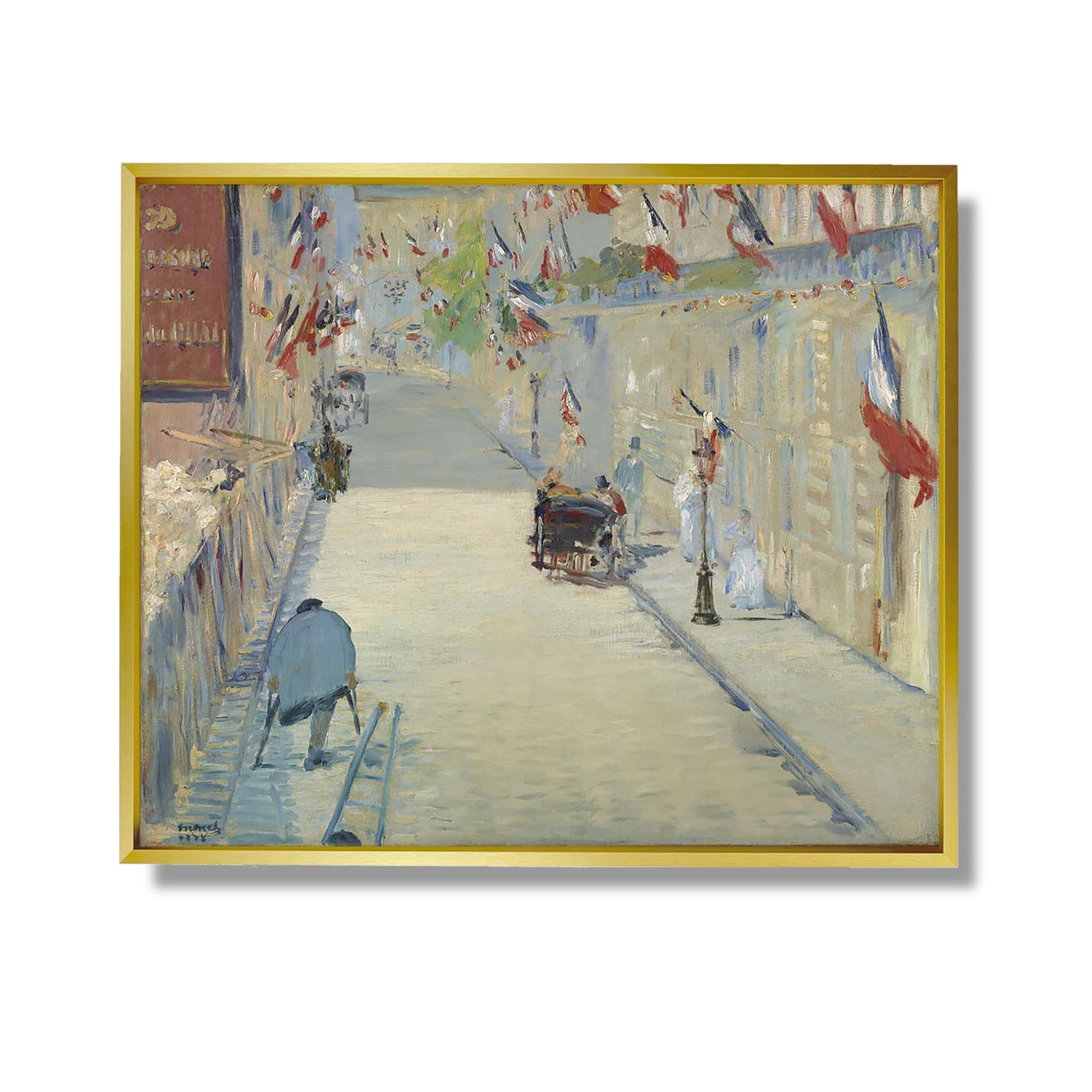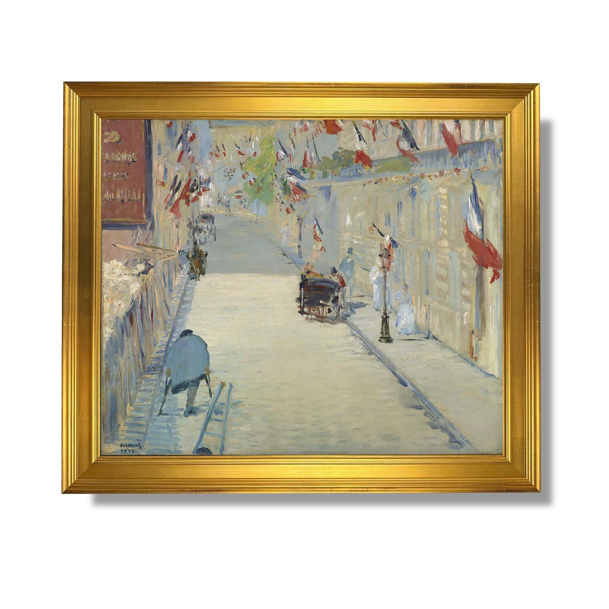 „Rue Mosnier mit Flaggen“ ist ein ikonisches Werk von Édouard Manet, gemalt im Jahr 1878. Dieses Gemälde zeigt eine lebhafte Straßenszene in Paris, in der der Sieg Frankreichs im Deutsch-Französischen Krieg gefeiert wird. Manet stellt wehende Flaggen, Symbole des Patriotismus und fröhliche Figuren dar, die eine festliche Atmosphäre schaffen. Die dynamische Komposition und der kräftige Einsatz von Farben sind ein Beweis für seinen innovativen Stil. Mit diesem Werk fängt Manet den Geist seiner Zeit ein, indem er Realismus und Impressionismus vermischt und gleichzeitig die künstlerischen Konventionen seiner Zeit in Frage stellt.