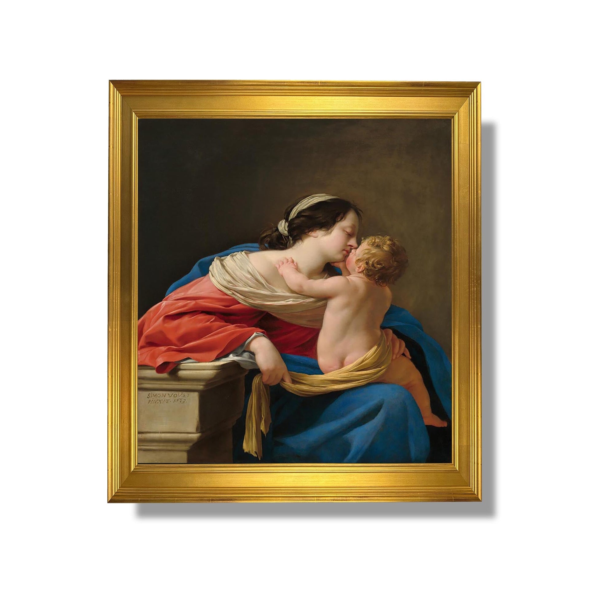 „Jungfrau mit Kind“, ein emblematisches Werk von Simon Vouet, veranschaulicht die Beherrschung des Barockstils durch den Künstler. Dieses im 17. Jahrhundert entstandene Gemälde zeigt die Jungfrau Maria, die das Jesuskind in einer intimen und warmen Umgebung hält. Die satten Farben und das Lichtspiel betonen die Zartheit der Szene, während die Ausdrücke der Figuren tiefe Emotionen vermitteln. Vouet, beeinflusst von Caravaggio, verwendet eindrucksvolles Helldunkel, um eine spirituelle Atmosphäre zu schaffen. Dieses Werk zeugt von seinem Talent und seiner Schlüsselrolle in der Entwicklung der französischen Malerei.