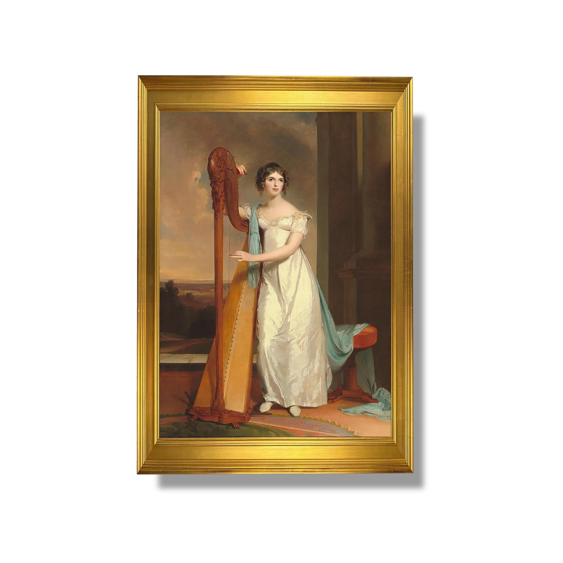 „Lady with a Harp: Eliza Ridgely“ ist ein ikonisches Werk des amerikanischen Malers Thomas Sully aus dem Jahr 1818. Dieses Porträt zeigt Eliza Ridgely, eine junge, elegant gekleidete Dame der High Society, die eine Harfe hält. Sully, bekannt für seinen romantischen Stil und seine meisterhafte Porträtmalerei, fängt die Anmut und Schönheit seines Modells mit sorgfältiger Liebe zum Detail ein. Das sanfte Licht und die zarten Farben unterstreichen den Ausdruck von Melancholie und Gelassenheit. Dieses Gemälde veranschaulicht nicht nur Sullys Talent, sondern auch die Bedeutung von Musik und Kunst im aristokratischen Leben zu Beginn des 19. Jahrhunderts.