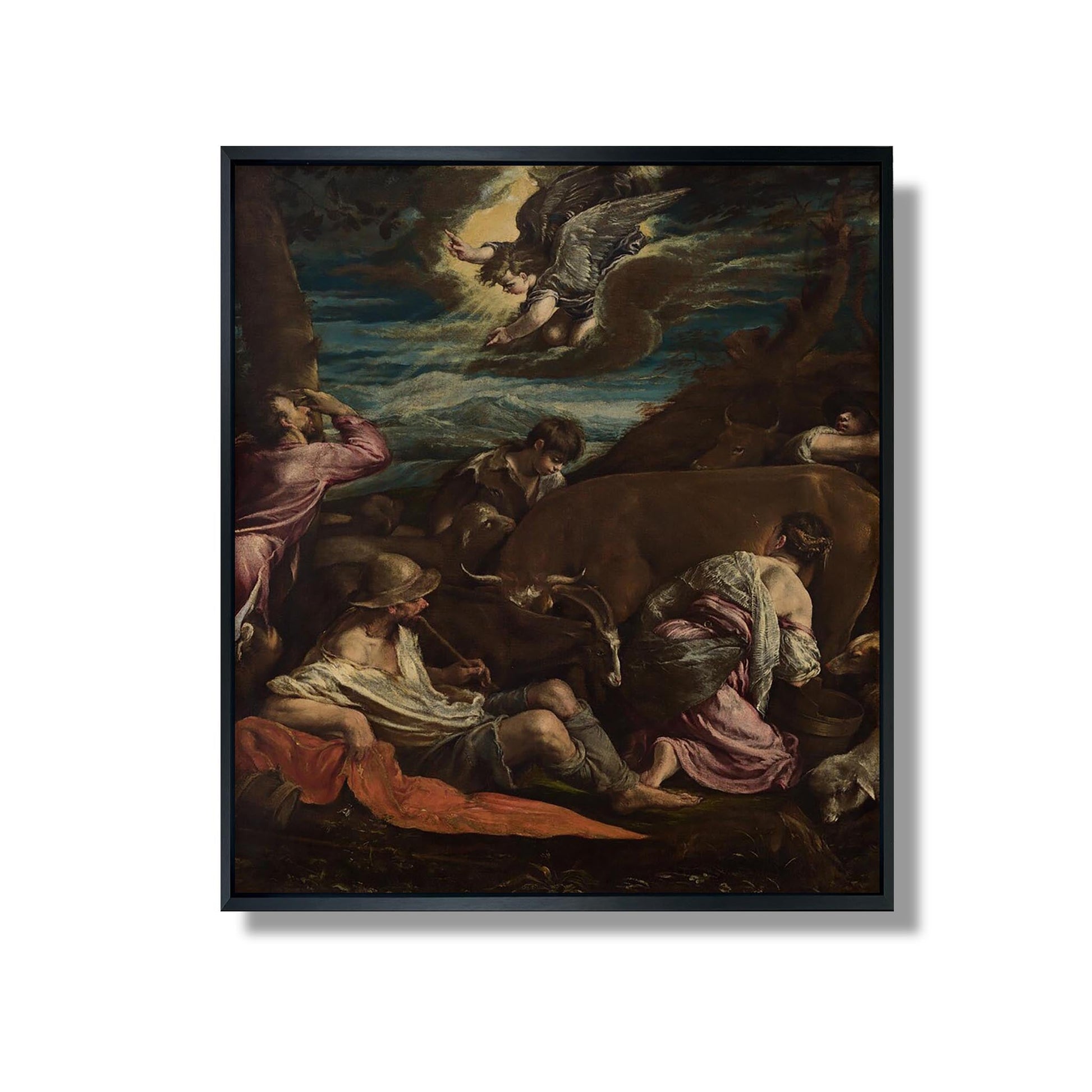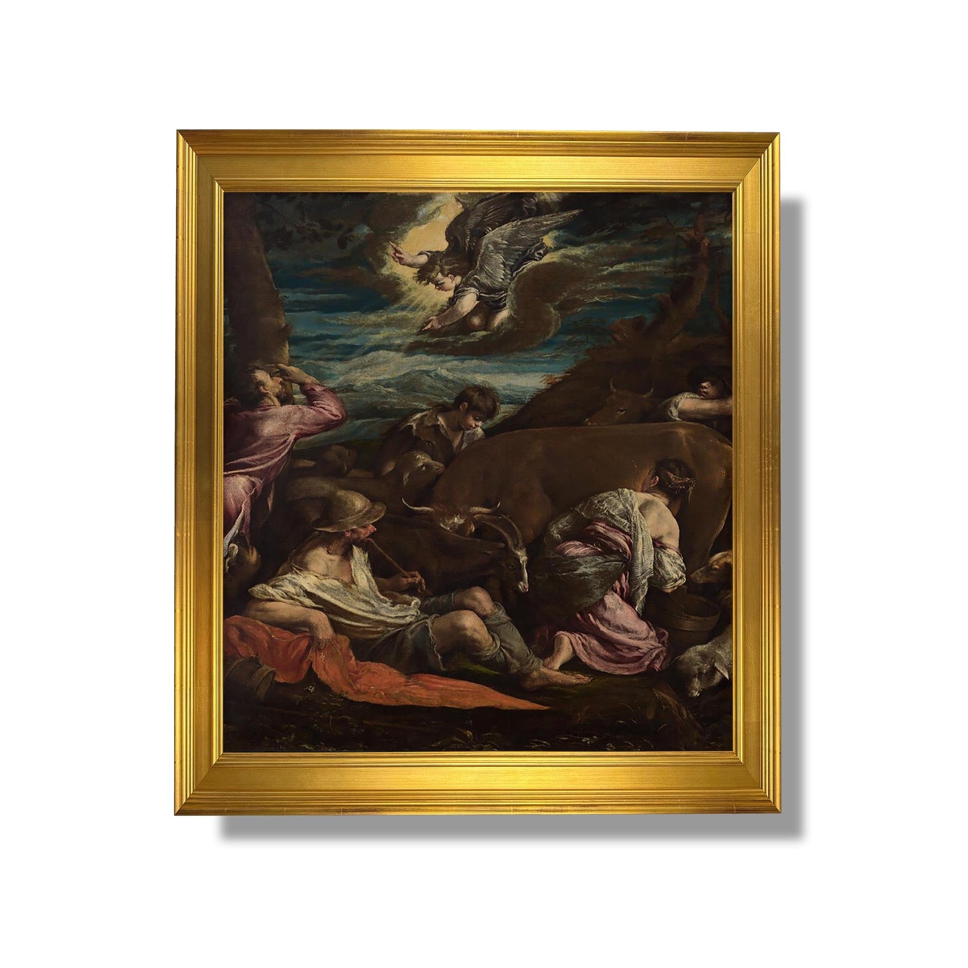 Die Verkündigung an die Hirten, im 16. Jahrhundert von Jacopo Bassano gemalt, ist ein emblematisches Werk der italienischen Renaissance. Dieses Gemälde illustriert die biblische Szene, in der Engel den Hirten die Geburt Christi verkünden. Bassano, bekannt für seinen ausdrucksstarken Einsatz von Licht und Farbe, schafft eine Atmosphäre, die zugleich mystisch und warm ist. Die Figuren sind mit bemerkenswertem Realismus dargestellt, während die Landschaft im Hintergrund eine erzählerische Dimension hinzufügt. Das Werk zeugt von der für Bassanos Stil charakteristischen Verschmelzung von Spiritualität und Menschlichkeit und lädt den Betrachter ein, über die Freude der Geburt Christi nachzudenken.