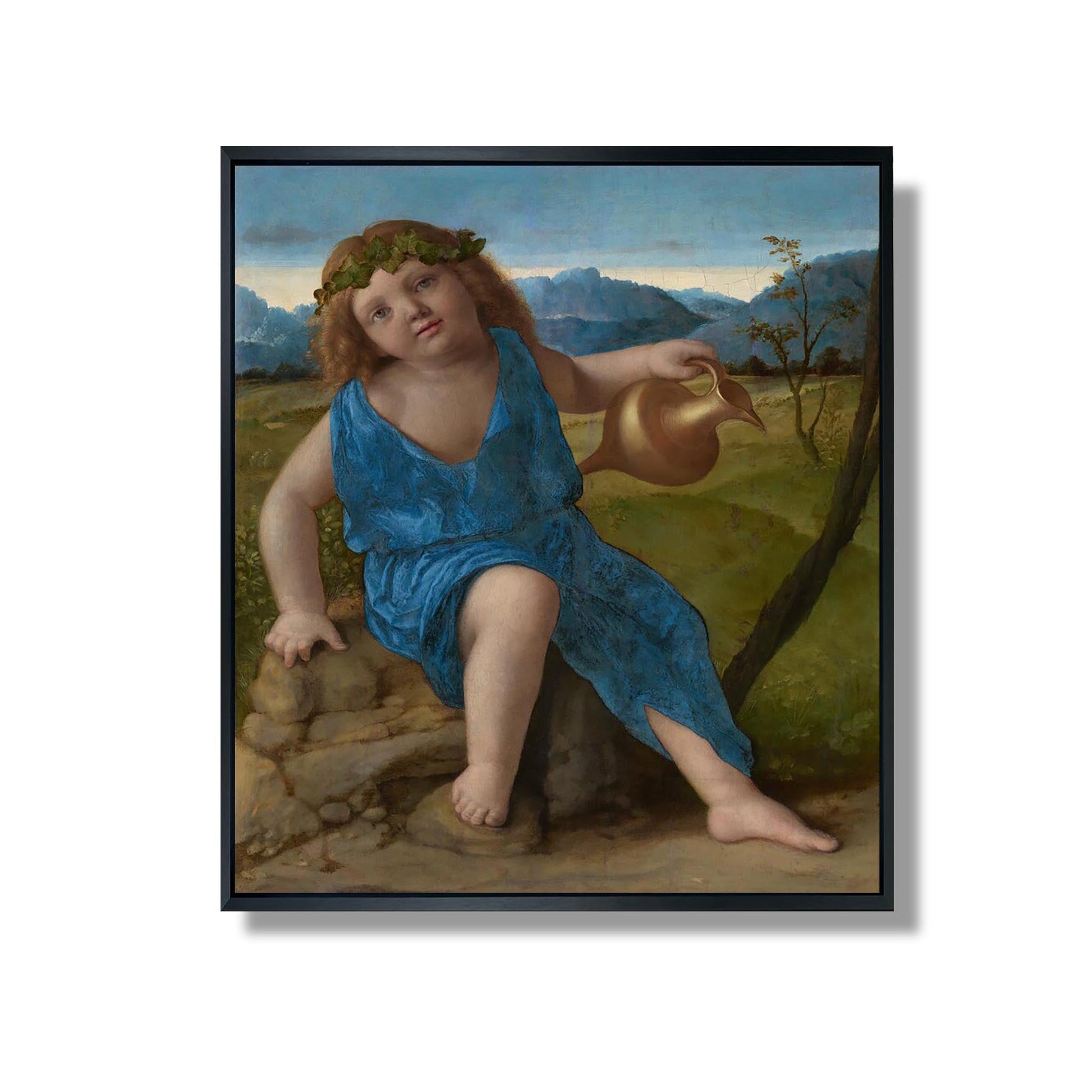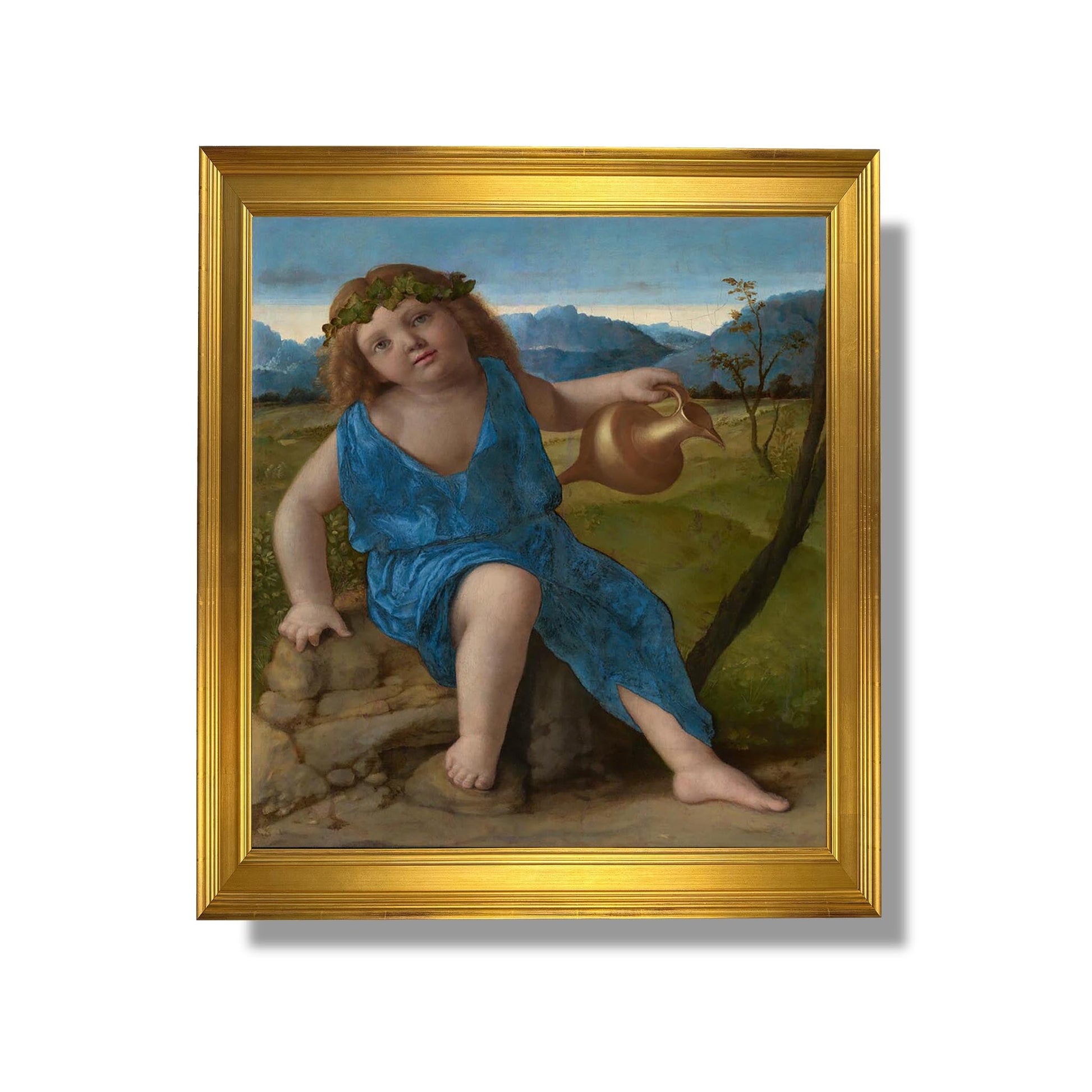 „Der Bacchus-Kind“, von Giovanni Bellini um 1510 gemalt, ist ein emblematisches Werk der venezianischen Renaissance. Dieses Gemälde zeigt den jungen Bacchus, den Gott des Weines, umgeben von Früchten und Weinreben, als Symbol für Überfluss und Lebensfreude. Die Zartheit der Gesichtszüge und die Fülle der Farben zeugen von Bellinis Talent, Licht und Textur einzufangen. Das Werk erinnert sowohl an Mythologie als auch an die Natur und spiegelt gleichzeitig die Harmonie zwischen dem Menschen und seiner Umwelt wider. Dieses Meisterwerk veranschaulicht den Übergang zu einem sinnlicheren und ausdrucksstärkeren Stil und markiert den Höhepunkt der venezianischen Kunst.
