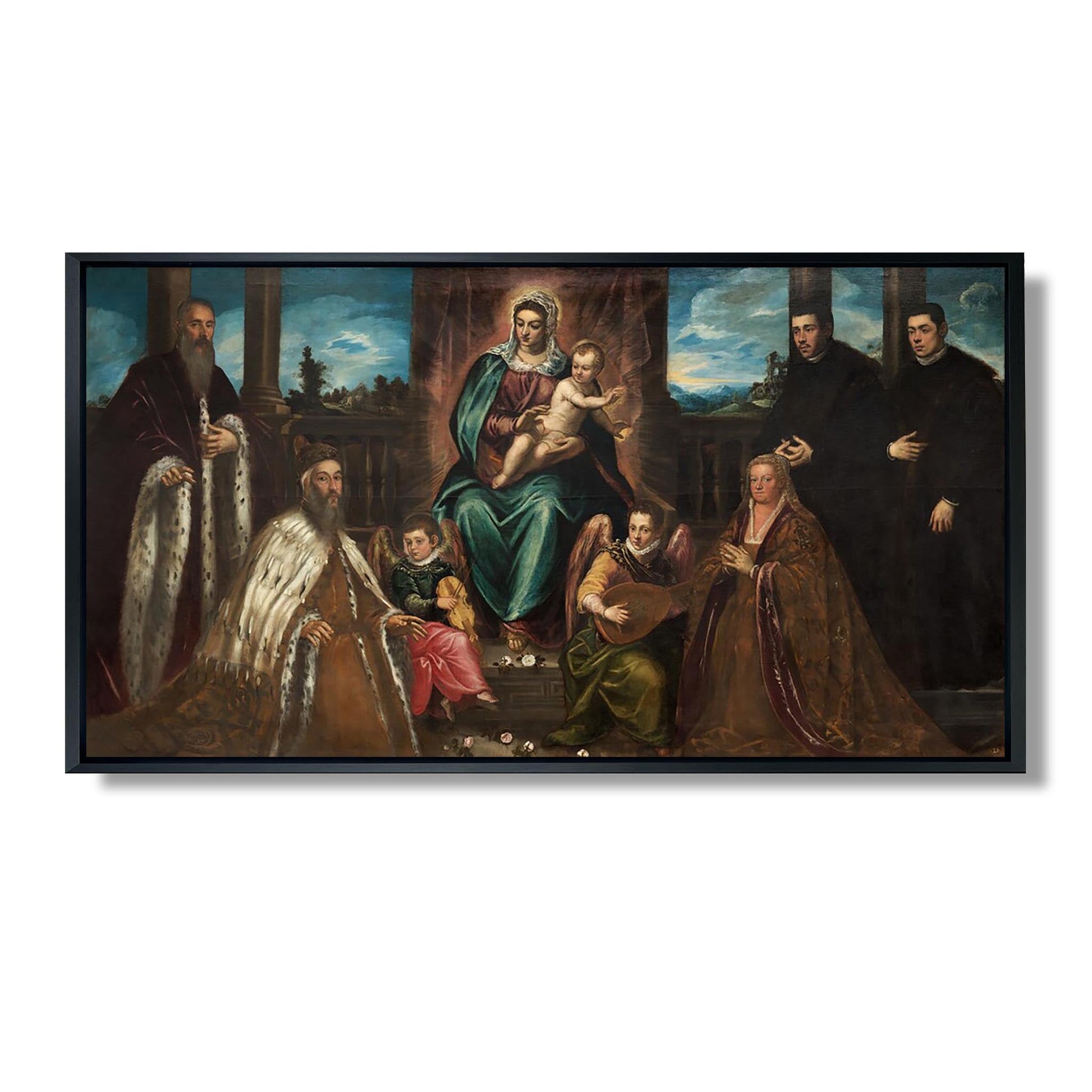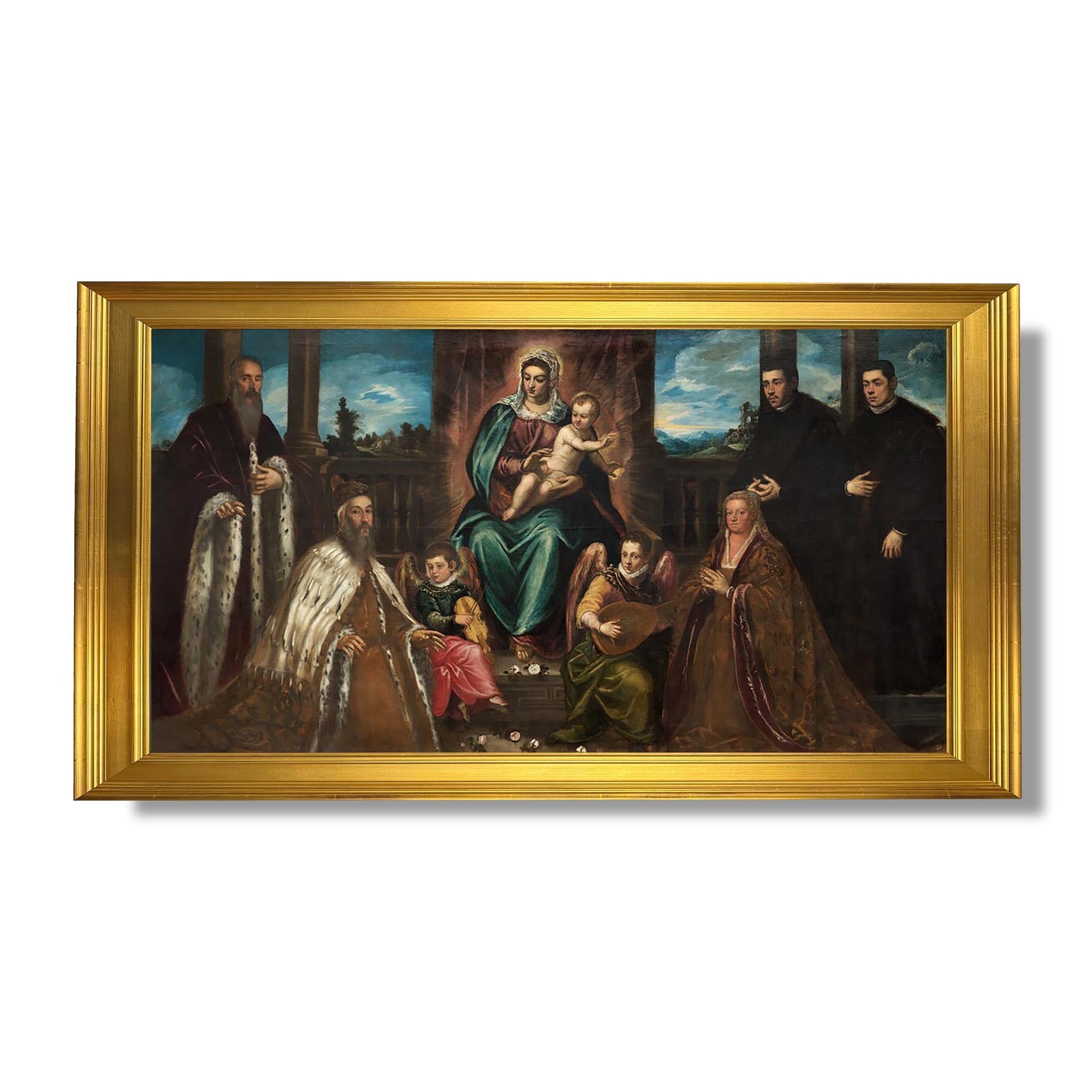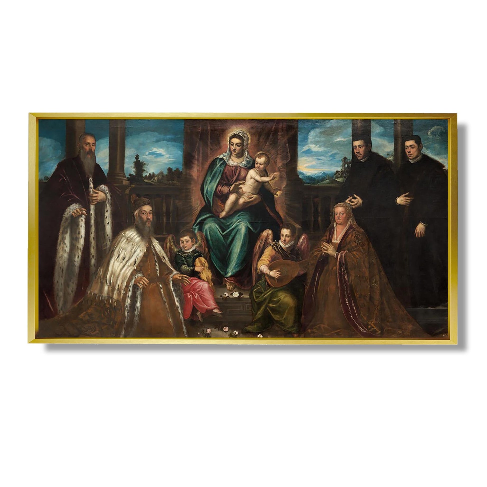 Das Gemälde „Der Doge Alvise Mocenigo und seine Familie vor der Jungfrau mit dem Kind“ von Jacopo Tintoretto ist ein emblematisches Werk der venezianischen Renaissance. Dieses um 1580 gemalte Werk veranschaulicht die Hingabe des Dogen und seiner Familie, die im Gebet vor der Jungfrau mit dem Kind dargestellt sind. Tintoretto, Meister des Hell-Dunkel-Malens, verwendet leuchtende Farben und dynamische Kompositionen, um eine spirituelle und feierliche Atmosphäre zu schaffen. Das Gemälde veranschaulicht die Bedeutung des Glaubens im öffentlichen und privaten Leben Venedigs und hebt zugleich den gesellschaftlichen Status des Dogen hervor.