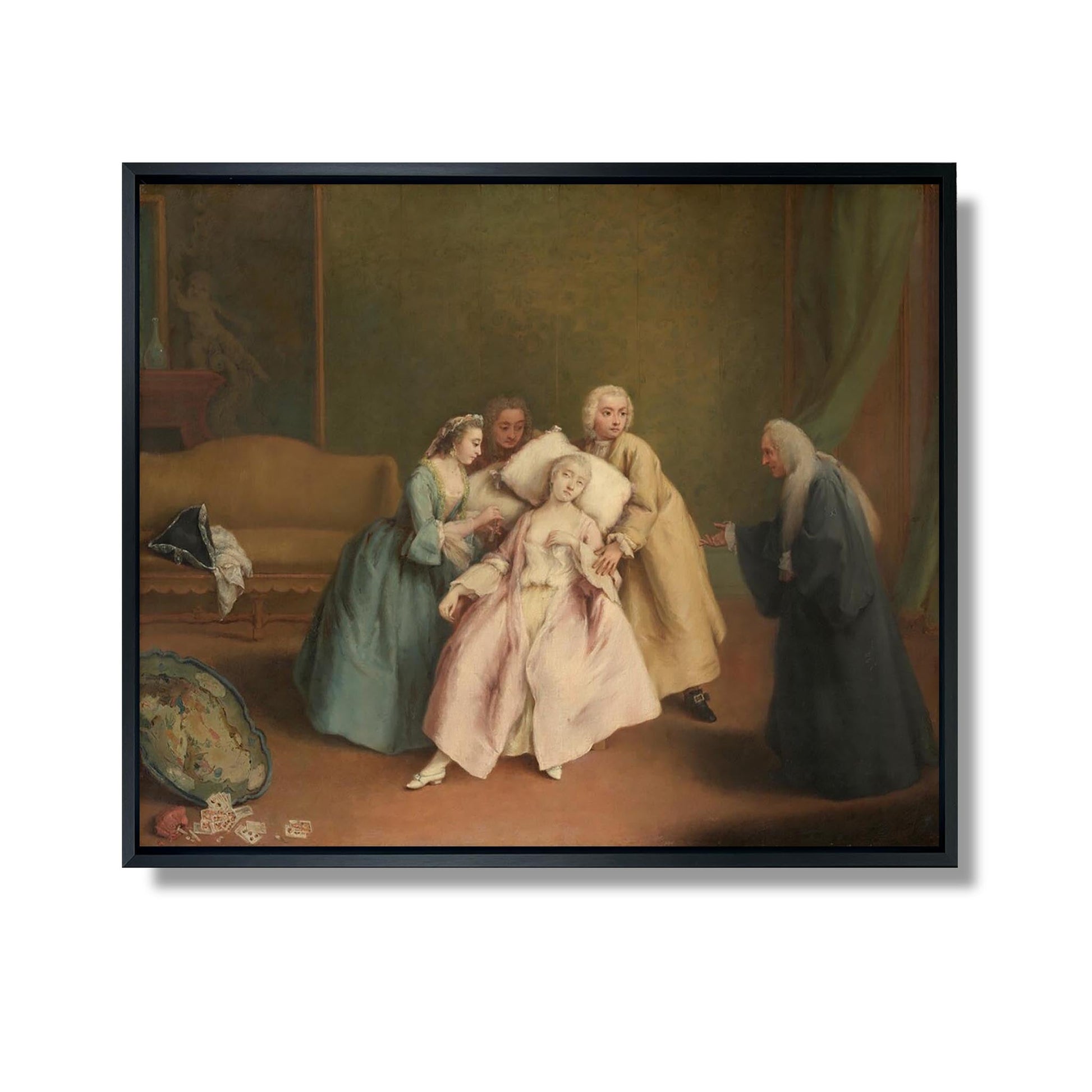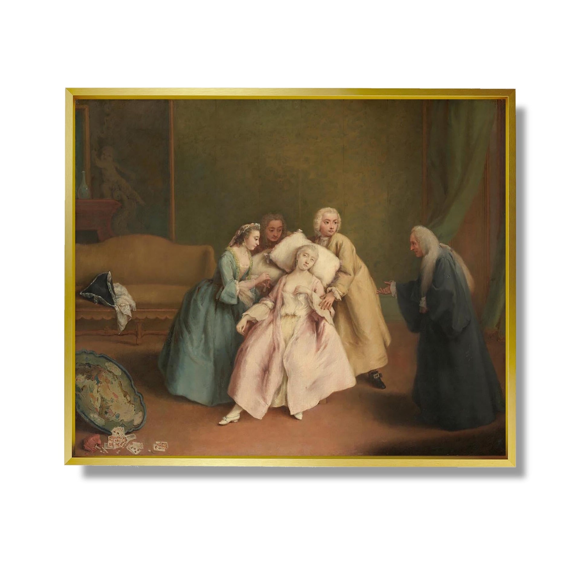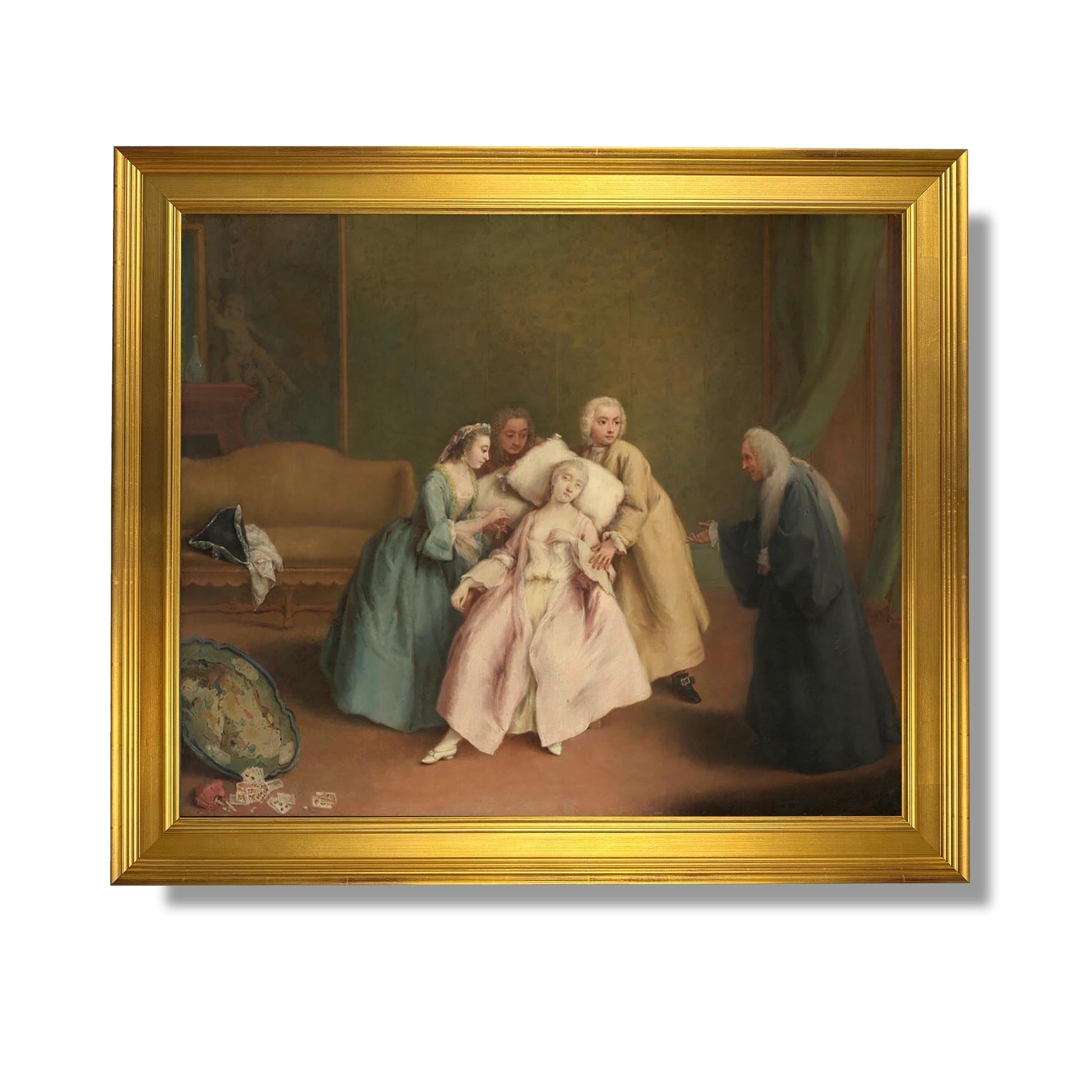 „Der Schwache“ von Pietro Longhi ist ein emblematisches Werk des 18. Jahrhunderts, das das tägliche Leben und die Sitten des venezianischen Adels illustriert. In diesem Gemälde fängt Longhi einen Moment menschlicher Verletzlichkeit und Zerbrechlichkeit ein und zeigt eine Figur, die von intensiven Emotionen erfasst wird. Die Komposition zeichnet sich durch sorgfältige Details und eine zarte Farbpalette aus und spiegelt den Rokoko-Stil wider. Der für seine Genreszenen bekannte Künstler untersucht in diesem Werk Themen wie Schwäche und die menschliche Verfassung und bietet gleichzeitig Einblicke in die Gesellschaft seiner Zeit.