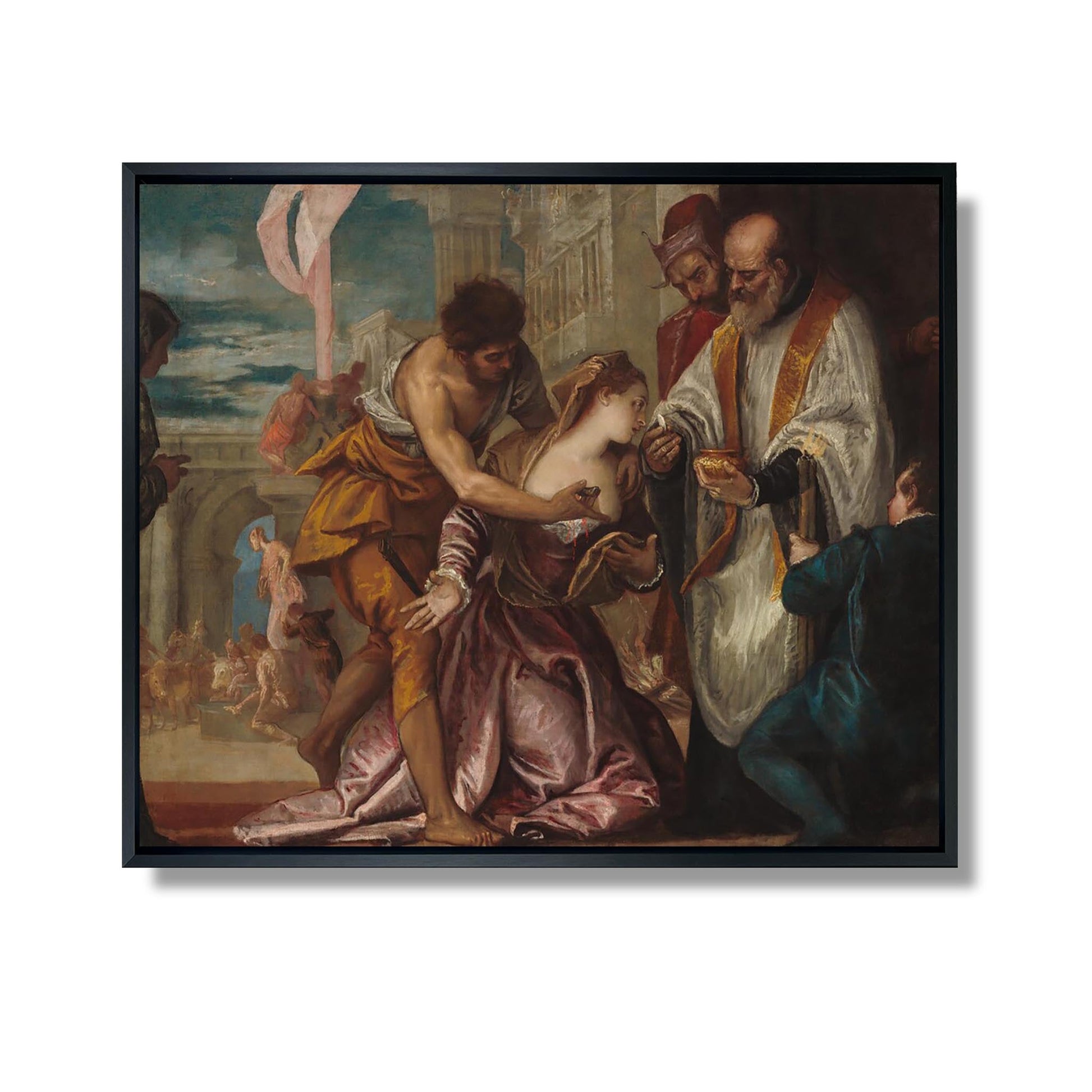 „Das Martyrium und die letzte Kommunion der Heiligen Lucia“ ist ein emblematisches Werk von Paolo Veronese, das im 16. Jahrhundert entstand. Dieses Gemälde illustriert in zwei unterschiedlichen Szenen das tragische Leben der Heiligen Lucia, einer christlichen Märtyrerin. Links ist die Szene ihres Martyriums, bei der sie mit Grausamkeit konfrontiert wird, von dramatischer Spannung erfüllt, während rechts ihre letzte Kommunion eine spirituelle Gelassenheit hervorruft. Veronese verwendet lebendige Farben und eine dynamische Komposition, um die Emotionen und die Tiefe des Glaubens einzufangen. Dieses Werk zeigt seine Fähigkeit, religiöse Erzählungen und barocke Ästhetik zu verbinden.
