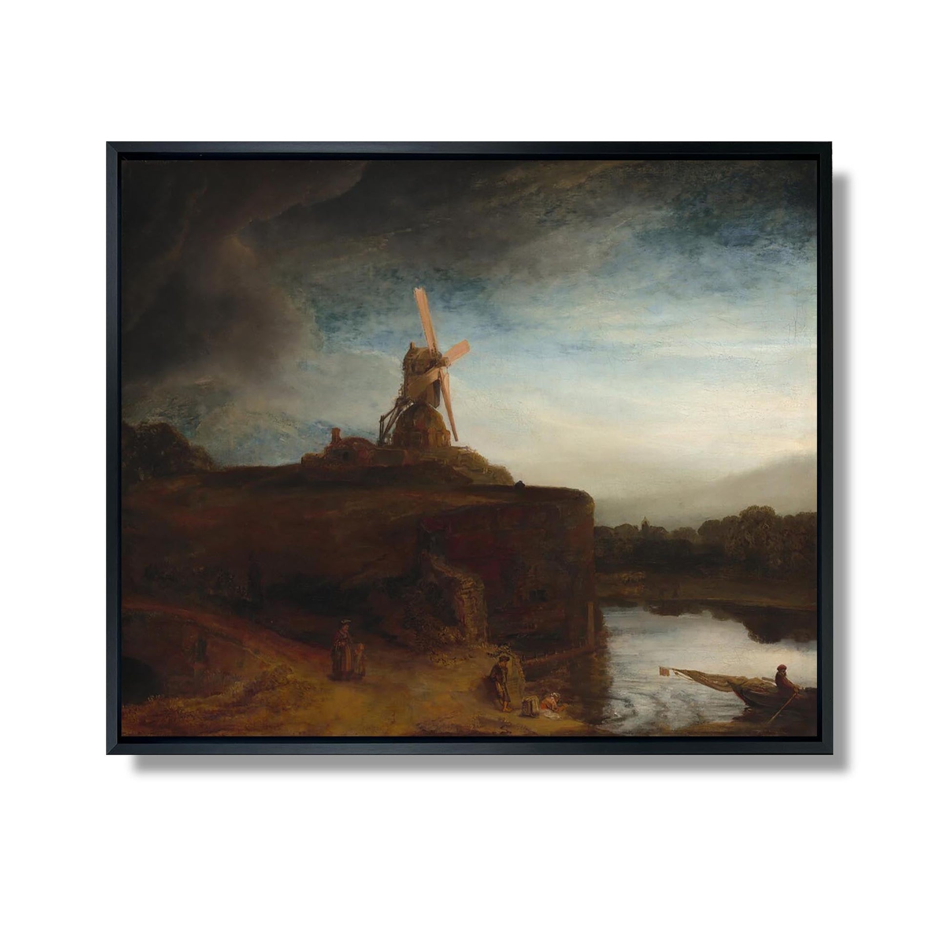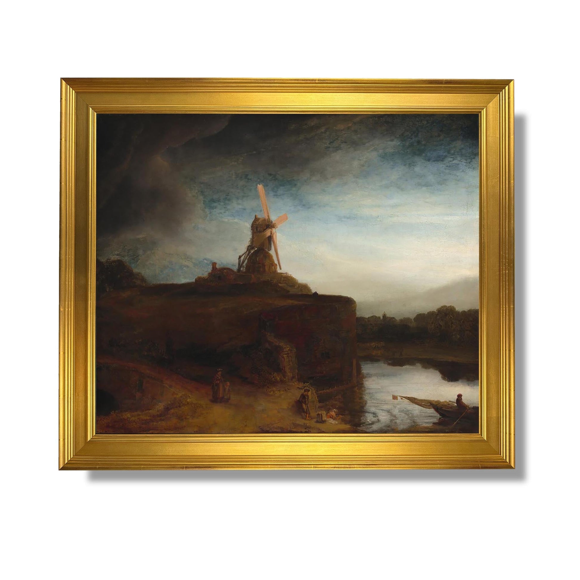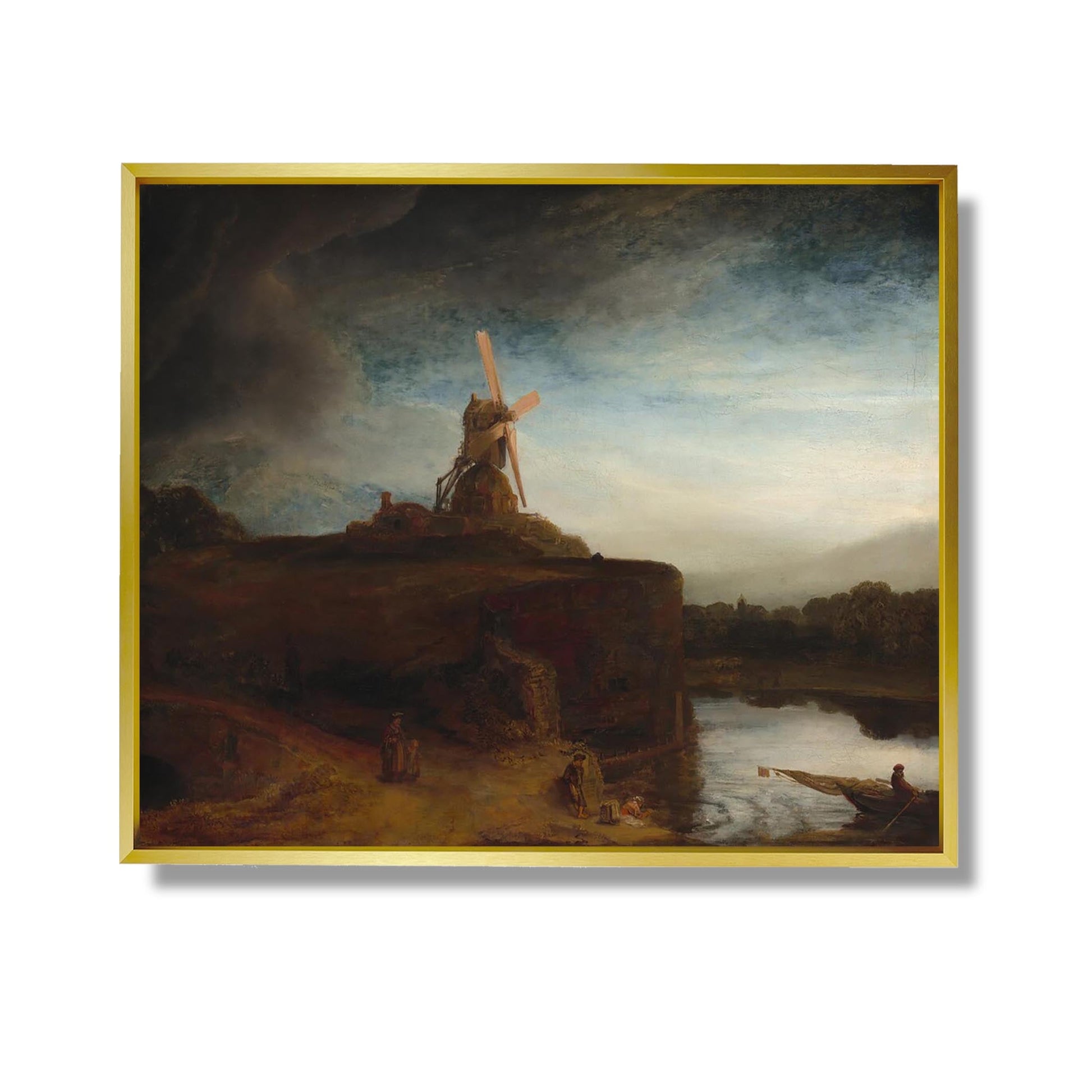 „Die Mühle“ ist ein ikonisches Werk von Rembrandt, gemalt im Jahr 1650. Dieses Gemälde zeigt eine niederländische ländliche Landschaft, in der eine Windmühle majestätisch inmitten eines wolkigen Himmels steht. Das für den Meister charakteristische Licht spielt mit den Naturelementen und schafft eine Atmosphäre, die zugleich heiter und dramatisch ist. Rembrandt verwendet Chiaroscuro-Techniken, um die Kontraste zwischen Licht und Schatten hervorzuheben und der Szene Leben zu verleihen. Dieses Werk veranschaulicht nicht nur Rembrandts Talent, die Natur einzufangen, sondern auch seine tiefe Verbundenheit mit dem alltäglichen Leben in den Niederlanden.