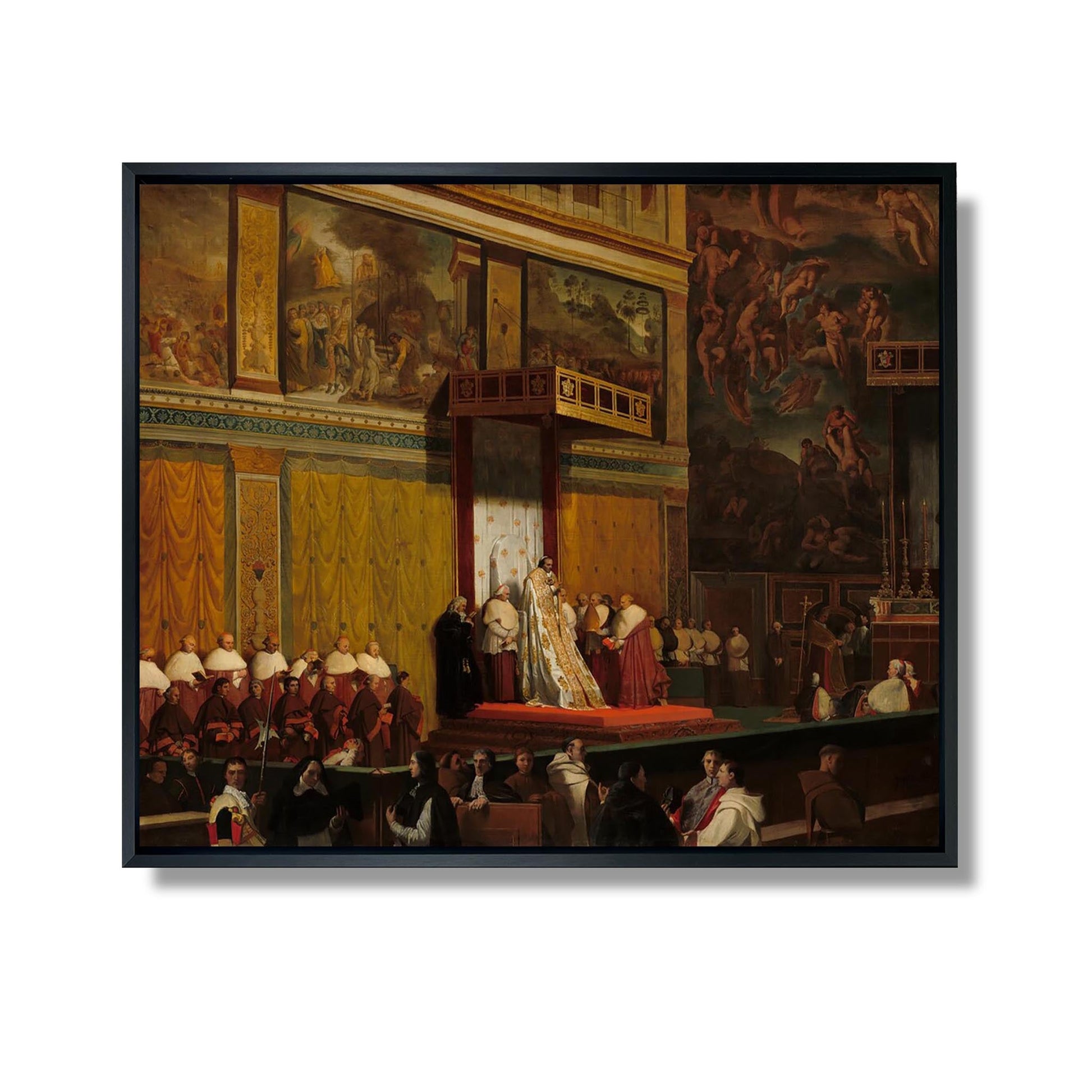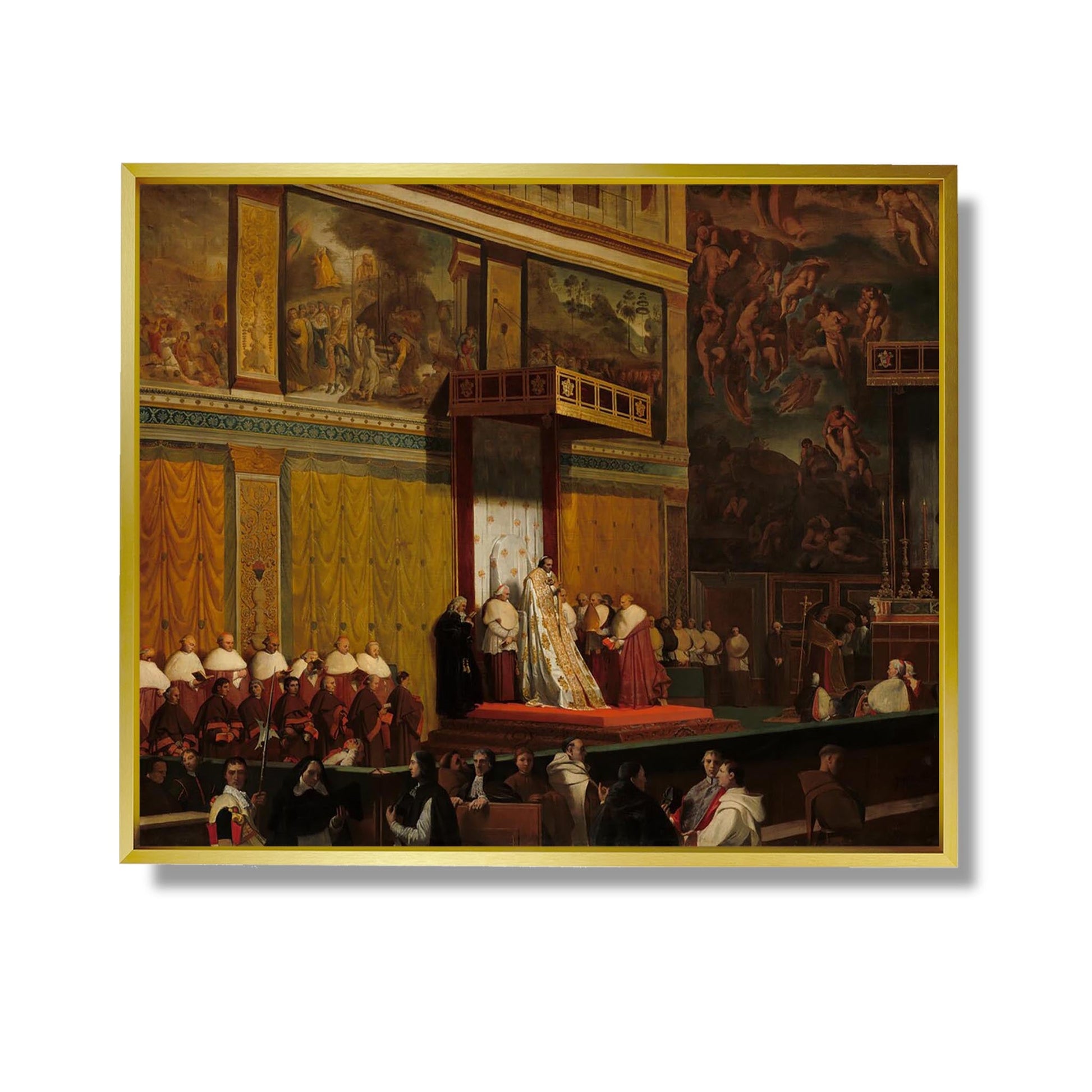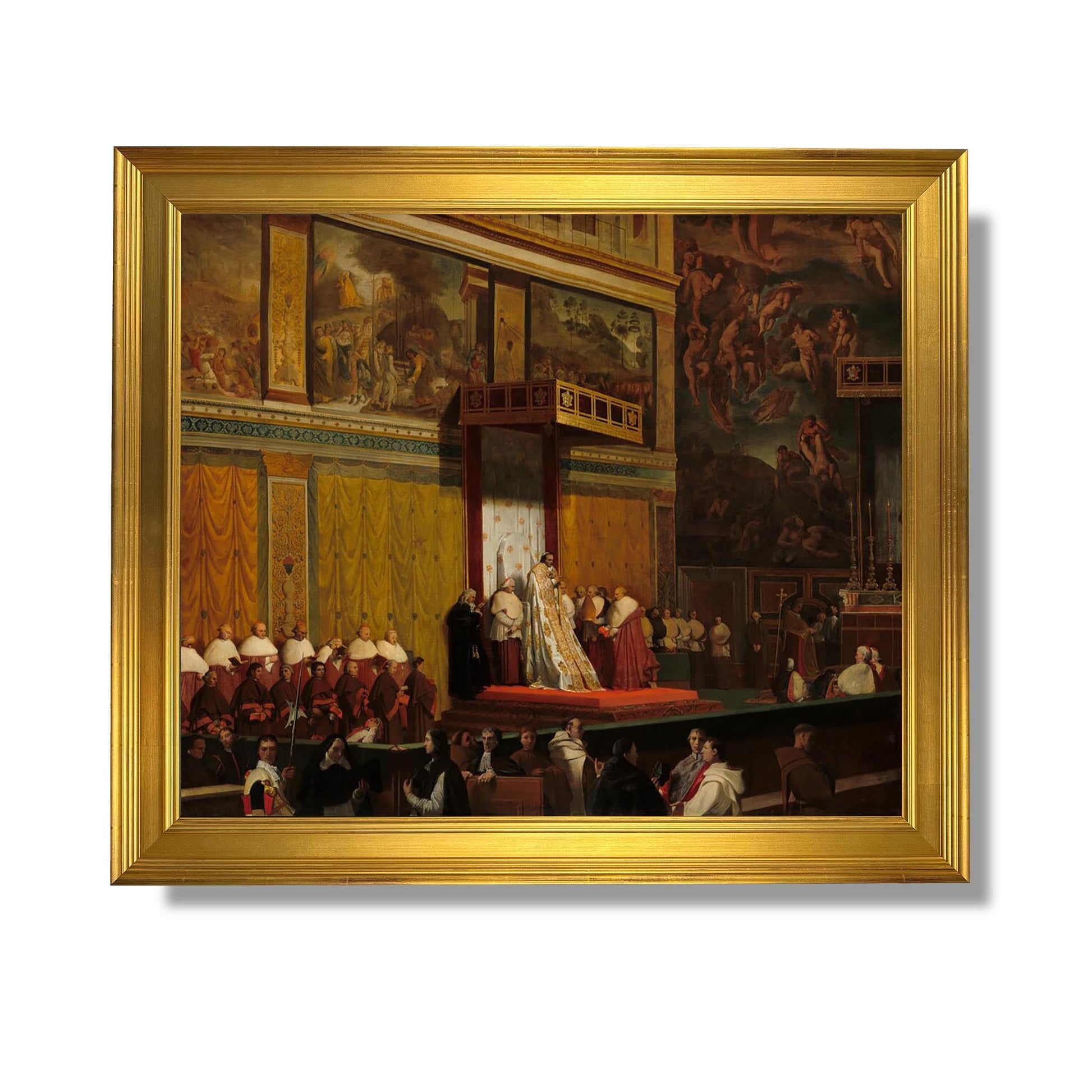 Das 1819 entstandene Werk „Papst Pius VII. in der Sixtinischen Kapelle“ von Jean-Auguste-Dominique Ingres ist eine emblematische Darstellung der Begegnung zwischen geistiger und künstlerischer Macht. In diesem Gemälde stellt Ingres Papst Pius VII., eine zentrale Figur der katholischen Kirche, in einer majestätischen Umgebung dar und betont dabei seine Autorität und Würde. Die Komposition zeichnet sich durch fließende Linien und sorgfältige Liebe zum Detail aus und spiegelt den neoklassischen Stil des Künstlers wider. Die satten Farben und das subtile Licht betonen die Feierlichkeit der Szene und machen dieses Werk zu einem kraftvollen Zeugnis von Glaube und Kunst im frühen 19. Jahrhundert.