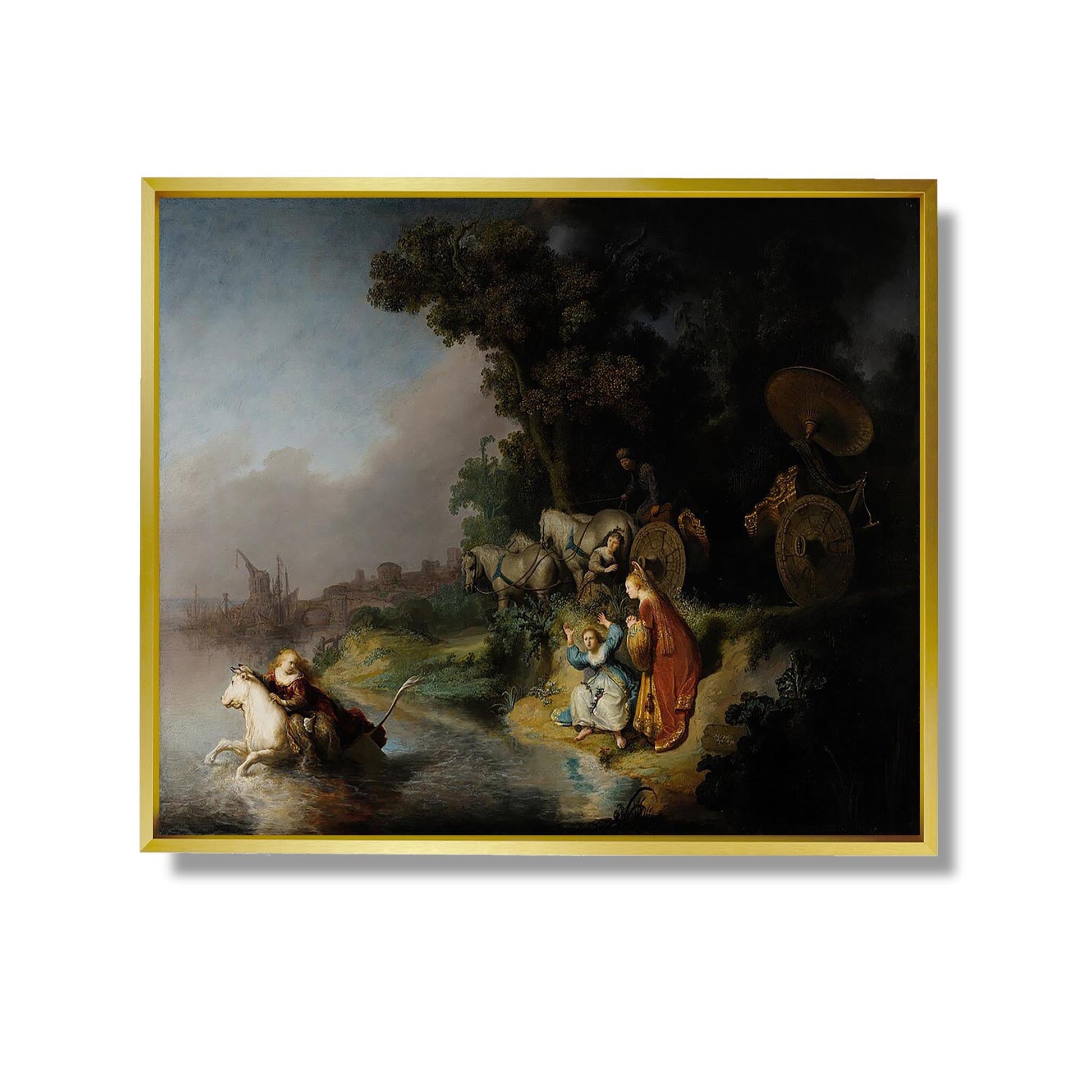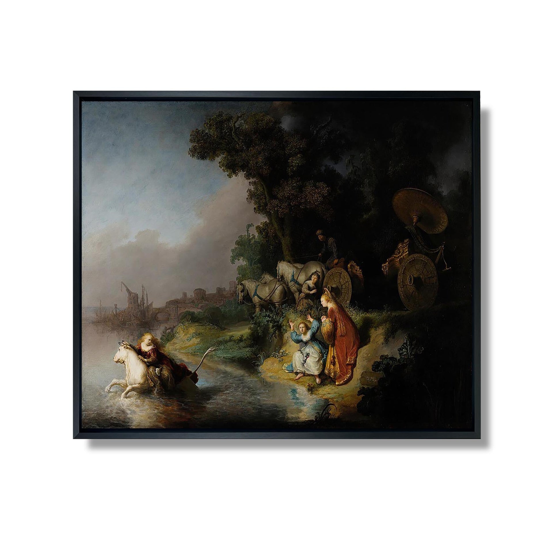 „Die Entführung der Europa“ ist ein ikonisches Werk von Rembrandt, das um 1632 entstand. Dieses Gemälde illustriert eine Episode aus der griechischen Mythologie, in der Zeus in Gestalt eines Stiers die phönizische Prinzessin Europa entführt. Rembrandts dynamische Komposition und das charakteristische Lichtspiel heben die Emotionen der Figuren hervor und schaffen eine Atmosphäre, die sowohl dramatisch als auch poetisch ist. Die winzigen Details der Gesichter und Faltenwürfe zeugen von seinem technischen Können. Dieses Werk spiegelt nicht nur Rembrandts Talent wider, sondern auch sein Interesse an mythologischen Themen und menschlichen Beziehungen.