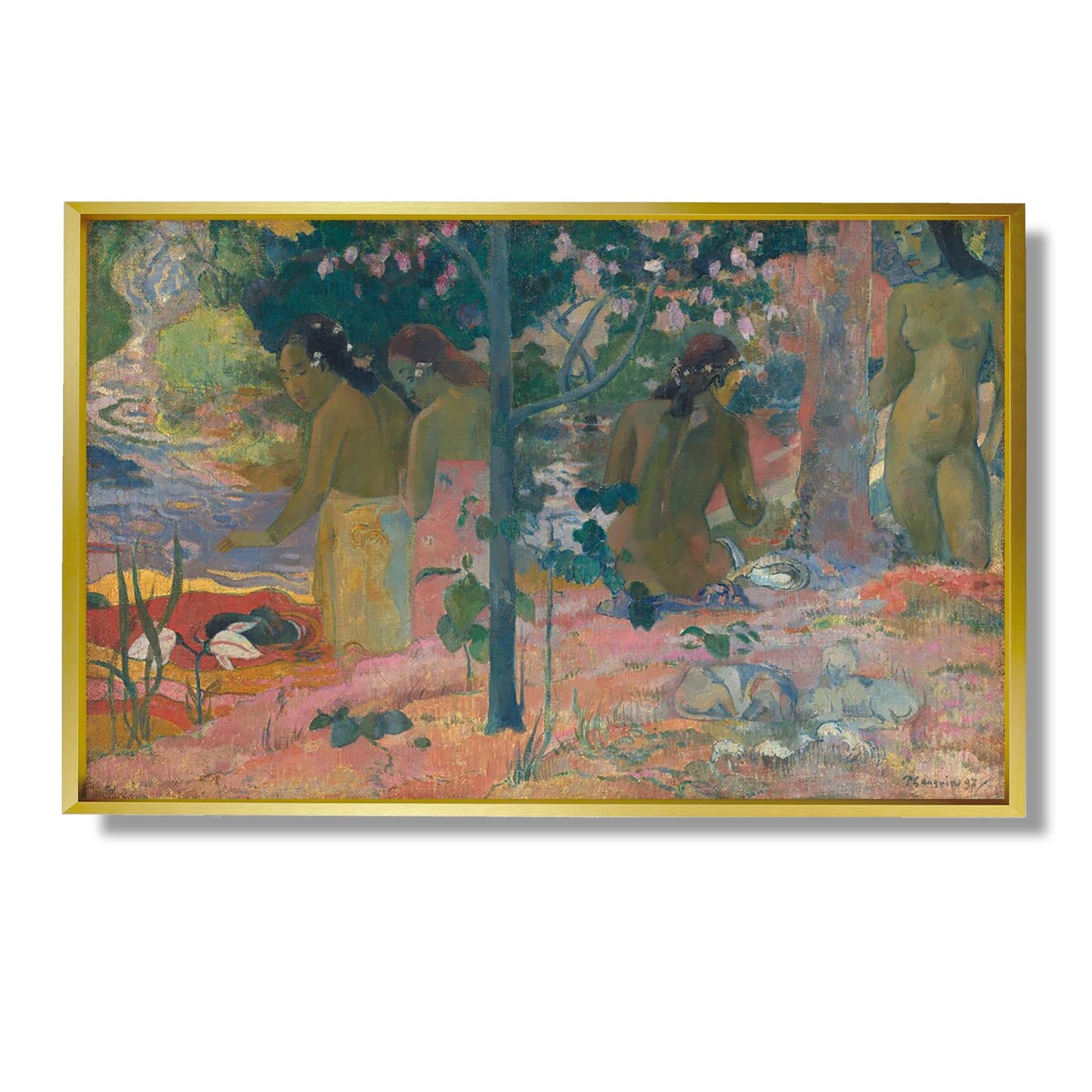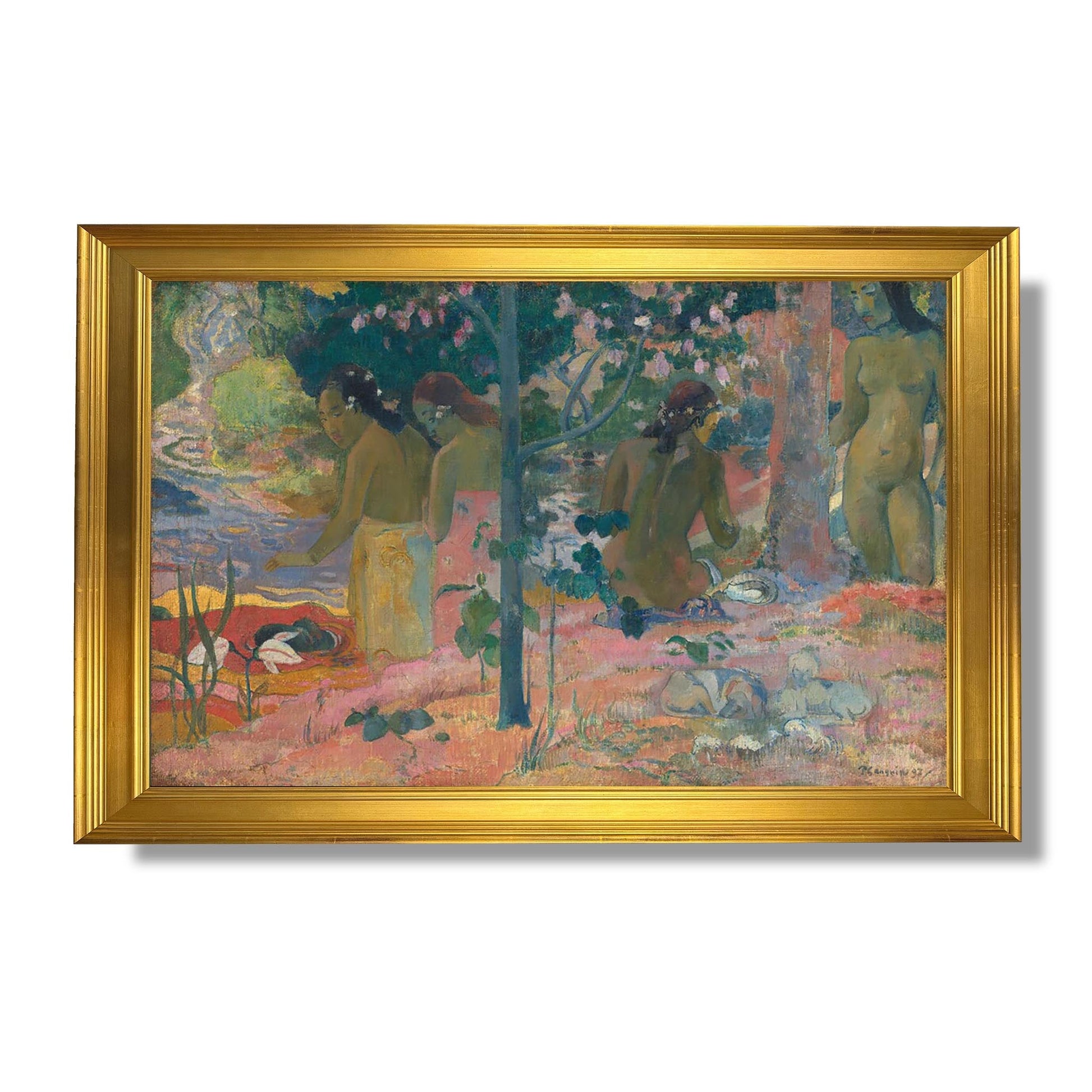 „Die Badenden“ ist ein ikonisches Werk von Paul Gauguin, gemalt im Jahr 1896, das seinen postimpressionistischen Stil und sein Interesse an exotischen Themen veranschaulicht. Dieses Gemälde zeigt menschliche Figuren, getaucht in lebendiges Licht, umgeben von üppiger Natur. Die Badenden erzeugen mit ihren stilisierten Formen und kräftigen Farben eine Atmosphäre der Gelassenheit und Harmonie. Beeinflusst durch seinen Aufenthalt auf Tahiti versuchte Gauguin, die Unschuld und Schönheit des primitiven Lebens einzufangen. Das Werk zeugt von seiner Suche nach einer spirituelleren Kunst, fernab europäischer Konventionen.