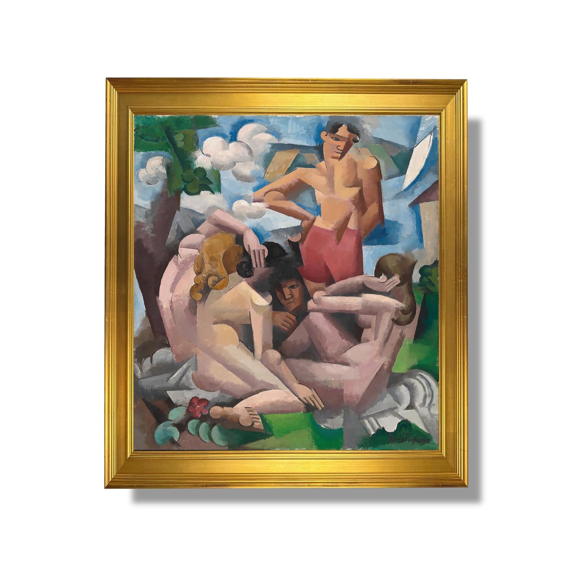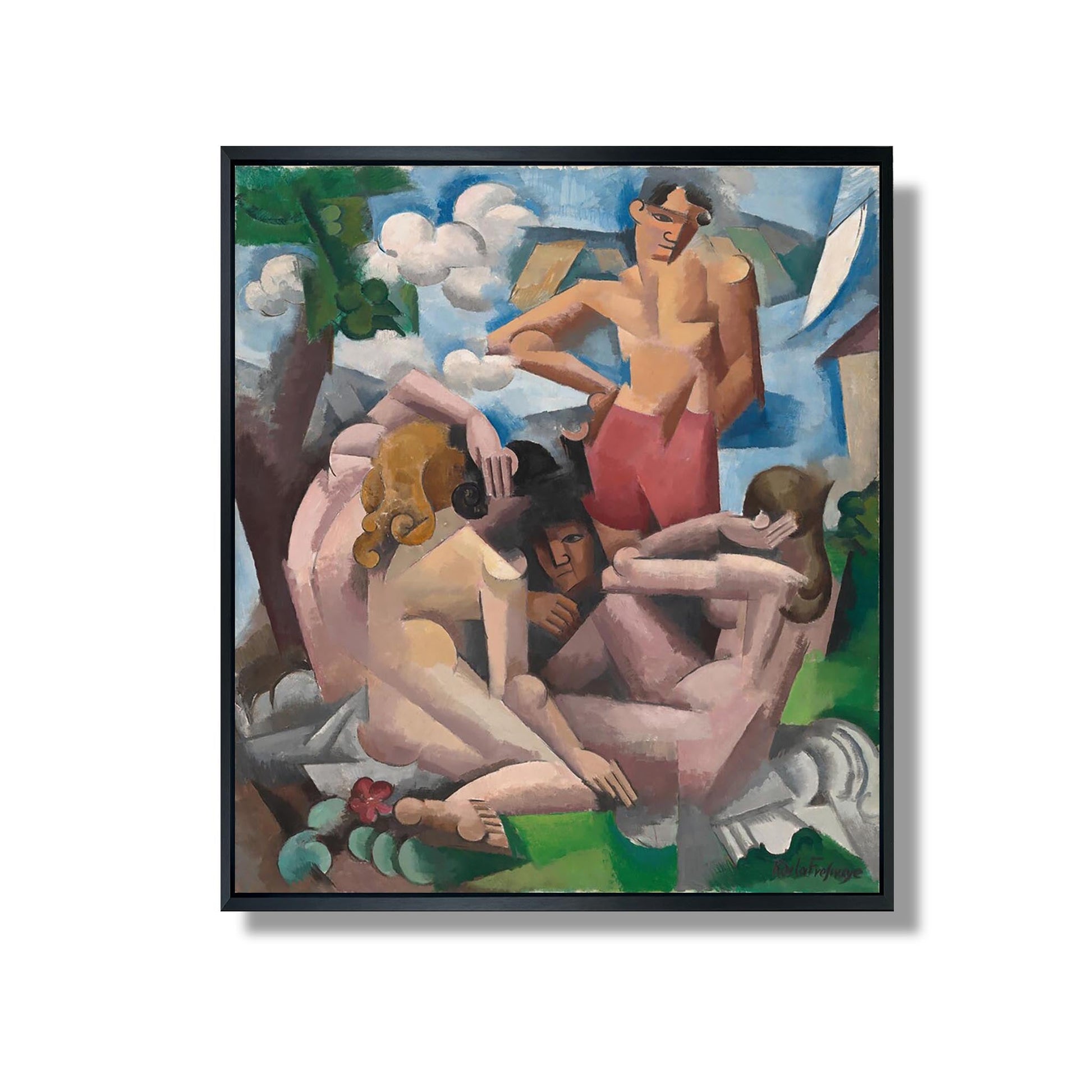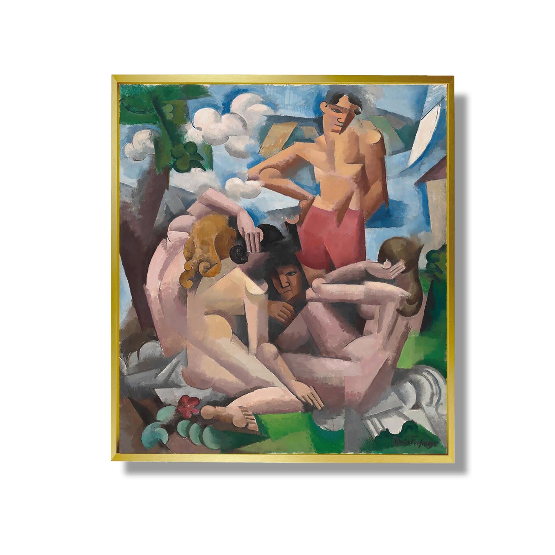 „Die Badenden“ von Roger de La Fresnaye, gemalt im Jahr 1910, ist ein emblematisches Werk des Kubismus. Dieses Gemälde zeigt menschliche Figuren im Freien, in Licht getaucht, in einem geometrischen und stilisierten Stil. Die dynamische Komposition stellt eckige Formen und leuchtende Farben gegenüber und schafft so eine Atmosphäre, die sowohl fröhlich als auch nachdenklich ist. La Fresnaye erforscht die Beziehung zwischen Mensch und Natur und stellt dabei die künstlerischen Konventionen seiner Zeit in Frage. Dieses Meisterwerk veranschaulicht die Suche des Künstlers nach einer neuen Ästhetik, die Moderne und Tradition vereint.