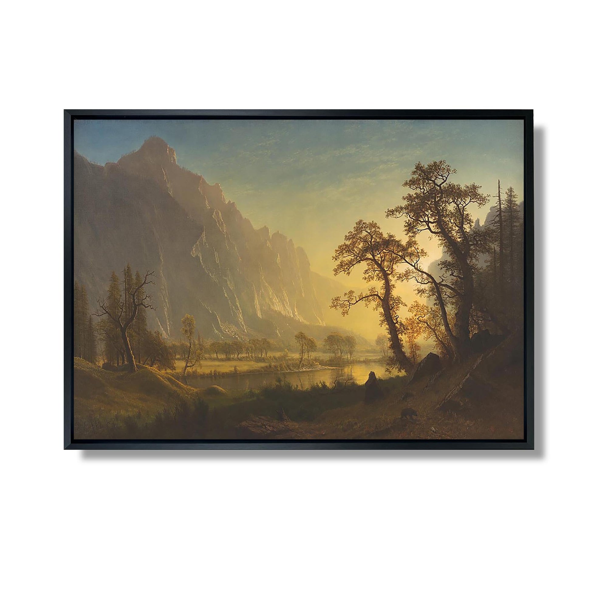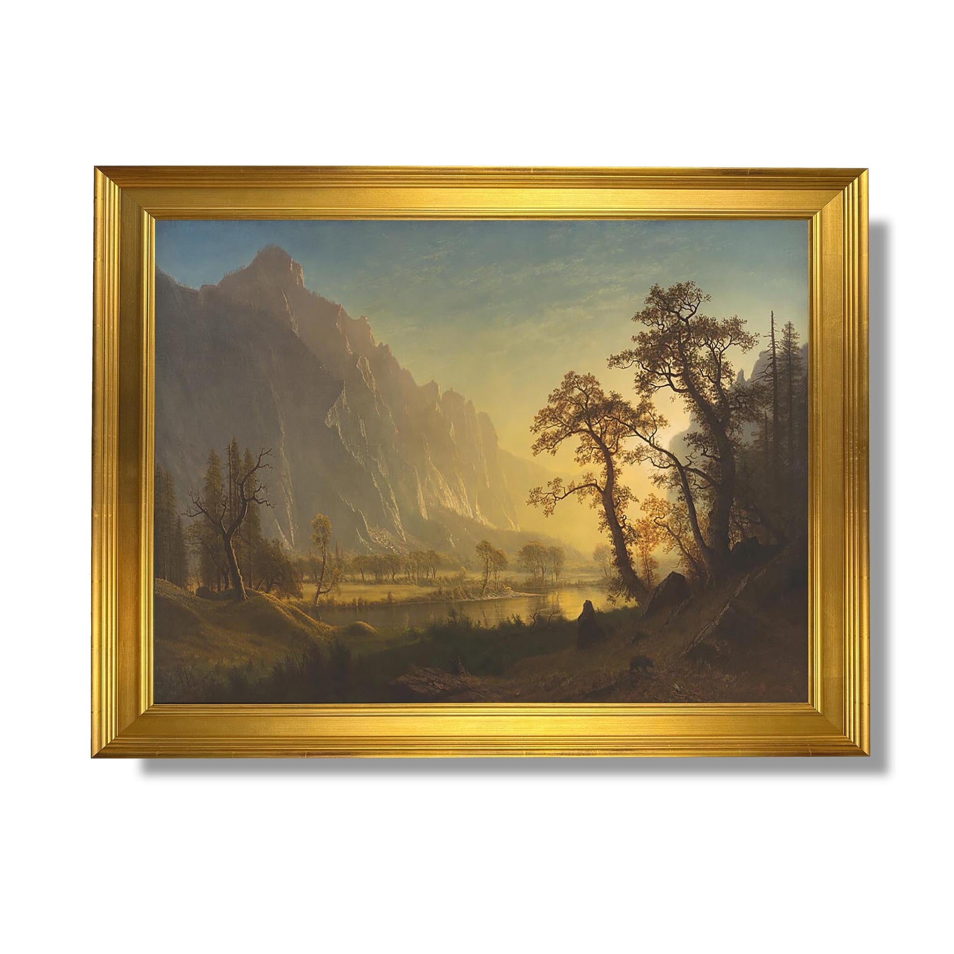 „Sunrise, Yosemite Valley“ ist ein ikonisches Werk von Albert Bierstadt, einem amerikanischen Maler des 19. Jahrhunderts, der für seine grandiosen Landschaften bekannt ist. Dieses 1864 gemalte Gemälde fängt die Majestät der Yosemite Mountains ein, die bei Sonnenaufgang in goldenes Licht getaucht sind. Bierstadt verwendet leuchtende Farben und kleinste Details, um die wilde Schönheit der Natur hervorzurufen. Sein romantischer Stil spiegelt den Entdecker- und Wundergeist der damaligen Zeit wider und betont zugleich, wie wichtig es ist, natürliche Landschaften zu bewahren. Dieses Werk verkörpert die Harmonie zwischen Mensch und Natur.
