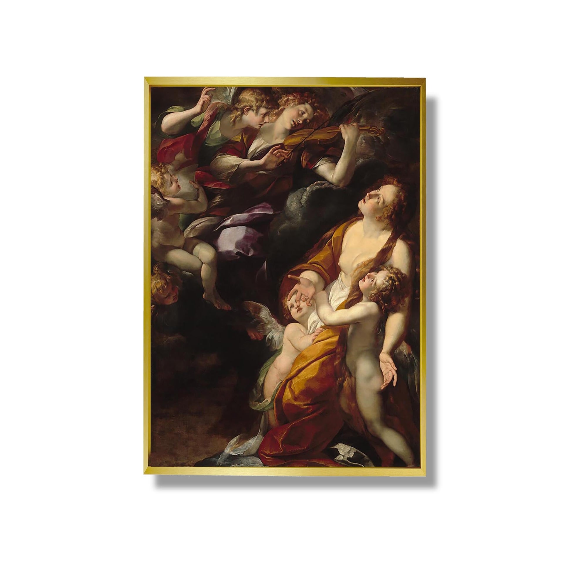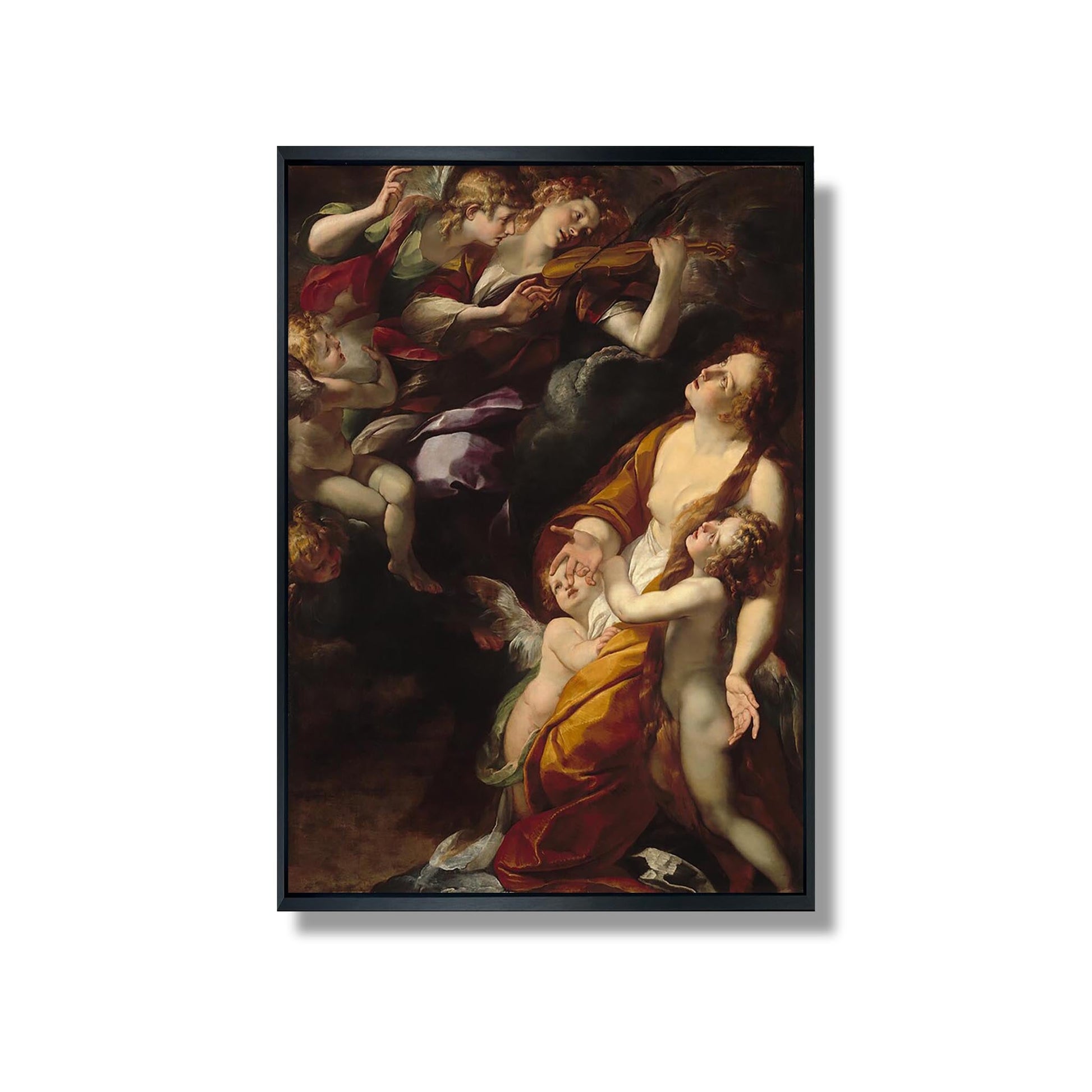 „Die Ekstase der Maria Magdalena“, ein ikonisches Werk von Giulio Cesare Procaccini, veranschaulicht die spirituelle und emotionale Tiefe der biblischen Figur der Maria Magdalena. Dieses zu Beginn des 17. Jahrhunderts gemalte Gemälde zeigt eine Madeleine in tiefer Kontemplation, wobei ihr Gesicht sowohl Leiden als auch Gelassenheit ausdrückt. Das gekonnt orchestrierte Licht hebt die Details ihres Gesichts und ihrer Kleidung hervor und erzeugt einen eindrucksvollen Kontrast. Procaccini, ein Meister des Barock, betont durch kräftige Farben und tiefe Schatten die mystische Dimension der Szene und lädt den Betrachter ein, über Glauben und Erlösung nachzudenken.