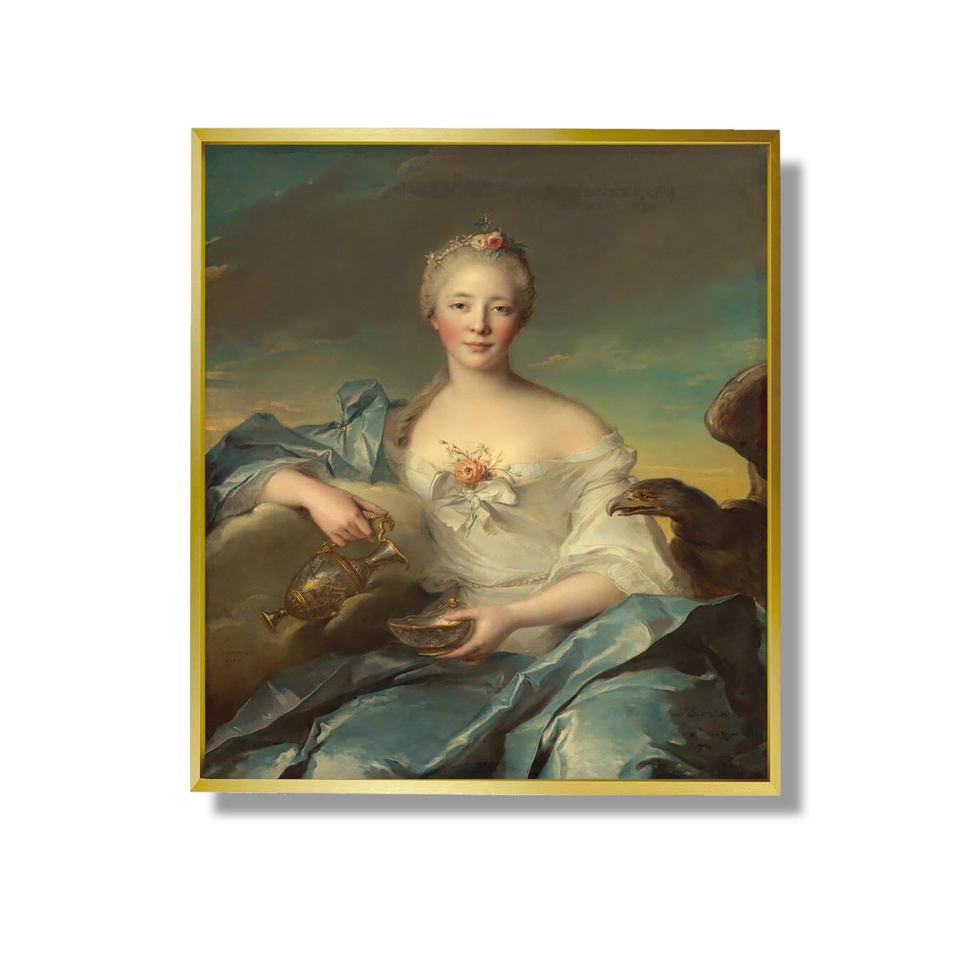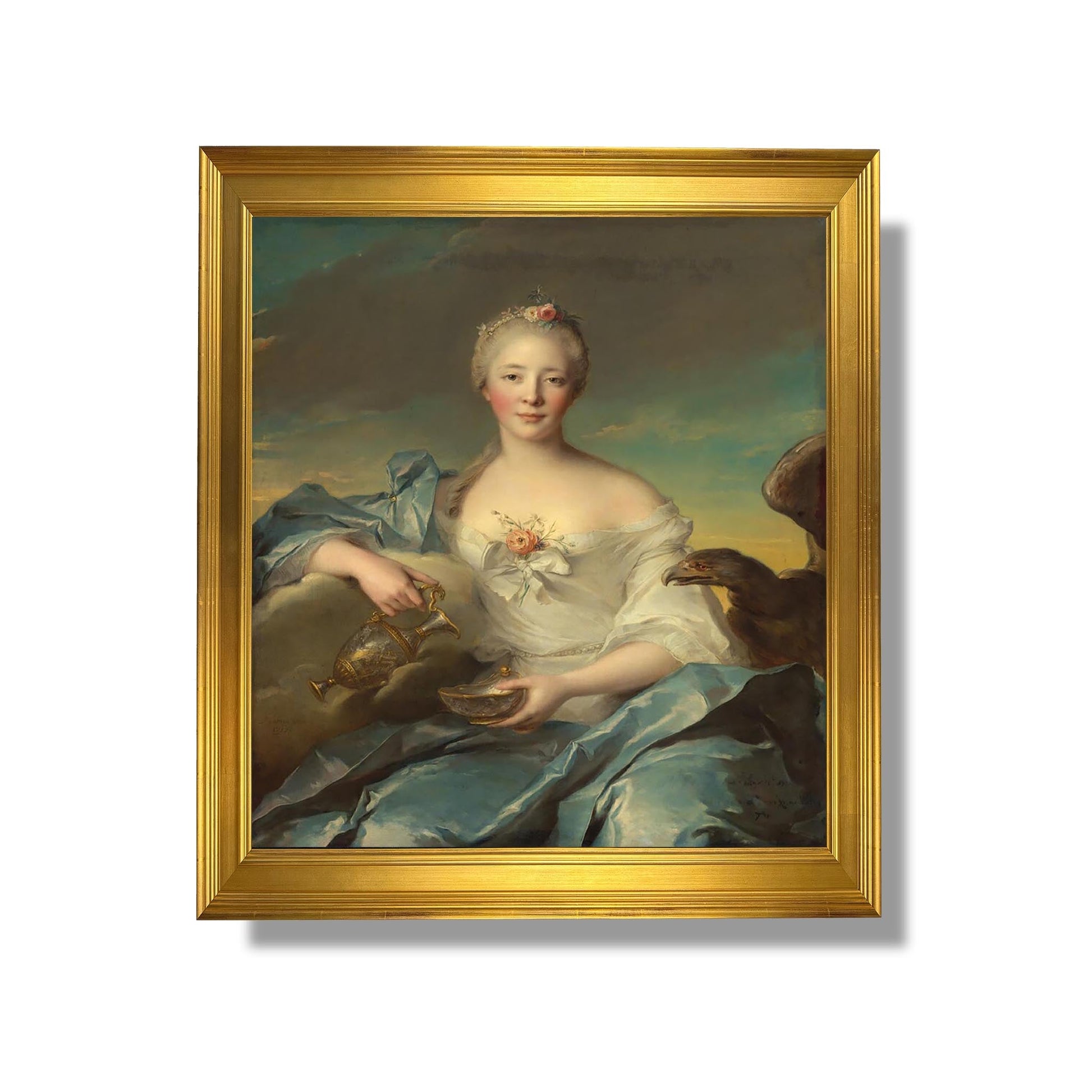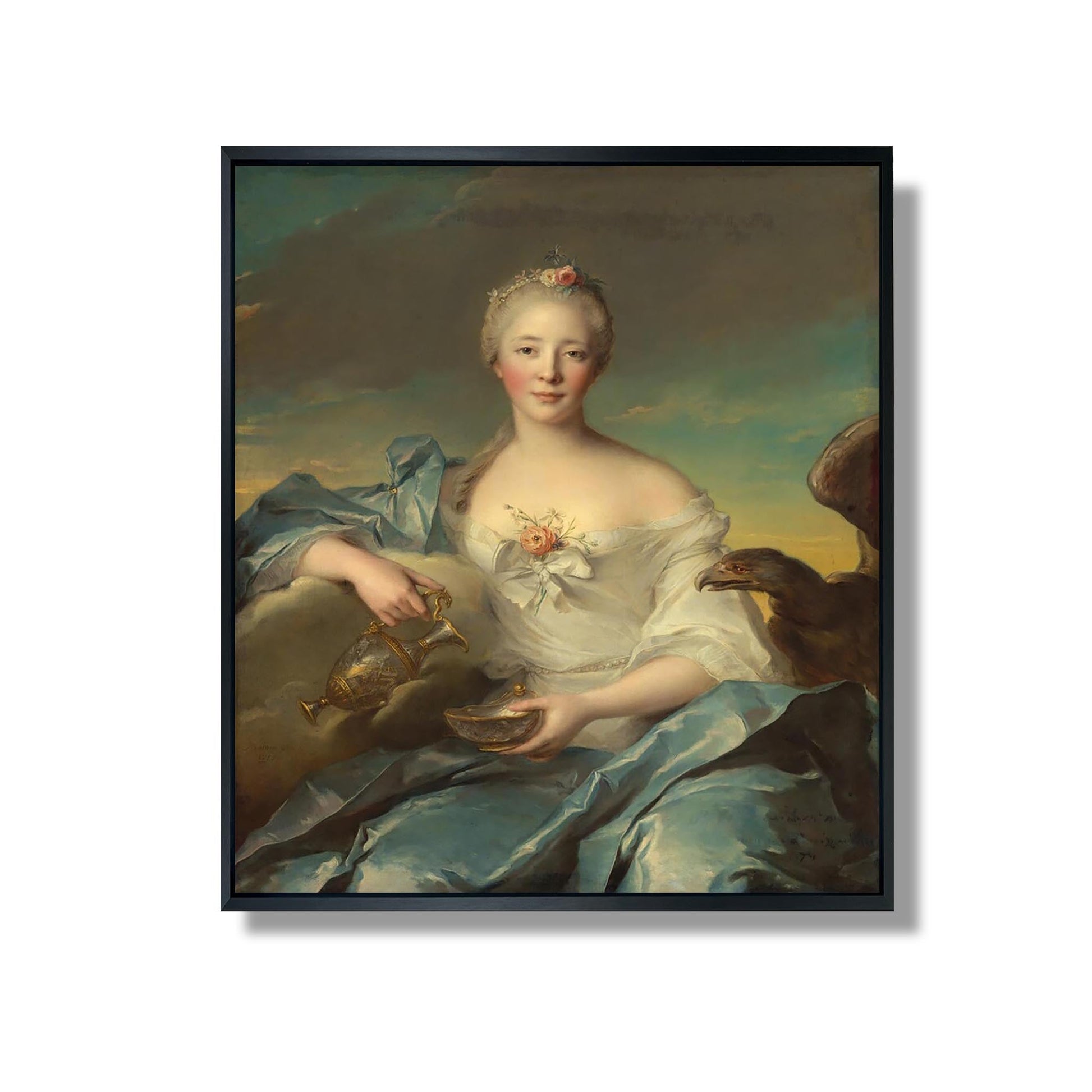 Das 1753 gemalte Werk „Madame Le Fèvre de Caumartin als Hébé“ von Jean-Marc Nattier verkörpert die Eleganz und Raffinesse des Rokoko-Stils. Dieses Porträt zeigt die Literatin und Salonnière Madame Le Fèvre de Caumartin in der Rolle der Hébé, der Göttin der Jugend. Nattier verwendet eine weiche und leuchtende Farbpalette, die die Schönheit und Anmut seines Modells betont. Die Komposition mit zarten Drapierungen und mythologischen Elementen unterstreicht das Weiblichkeitsideal der damaligen Zeit. Dieses Gemälde illustriert perfekt Nattiers Kunst und verbindet intimes Porträt und klassische Allegorie.