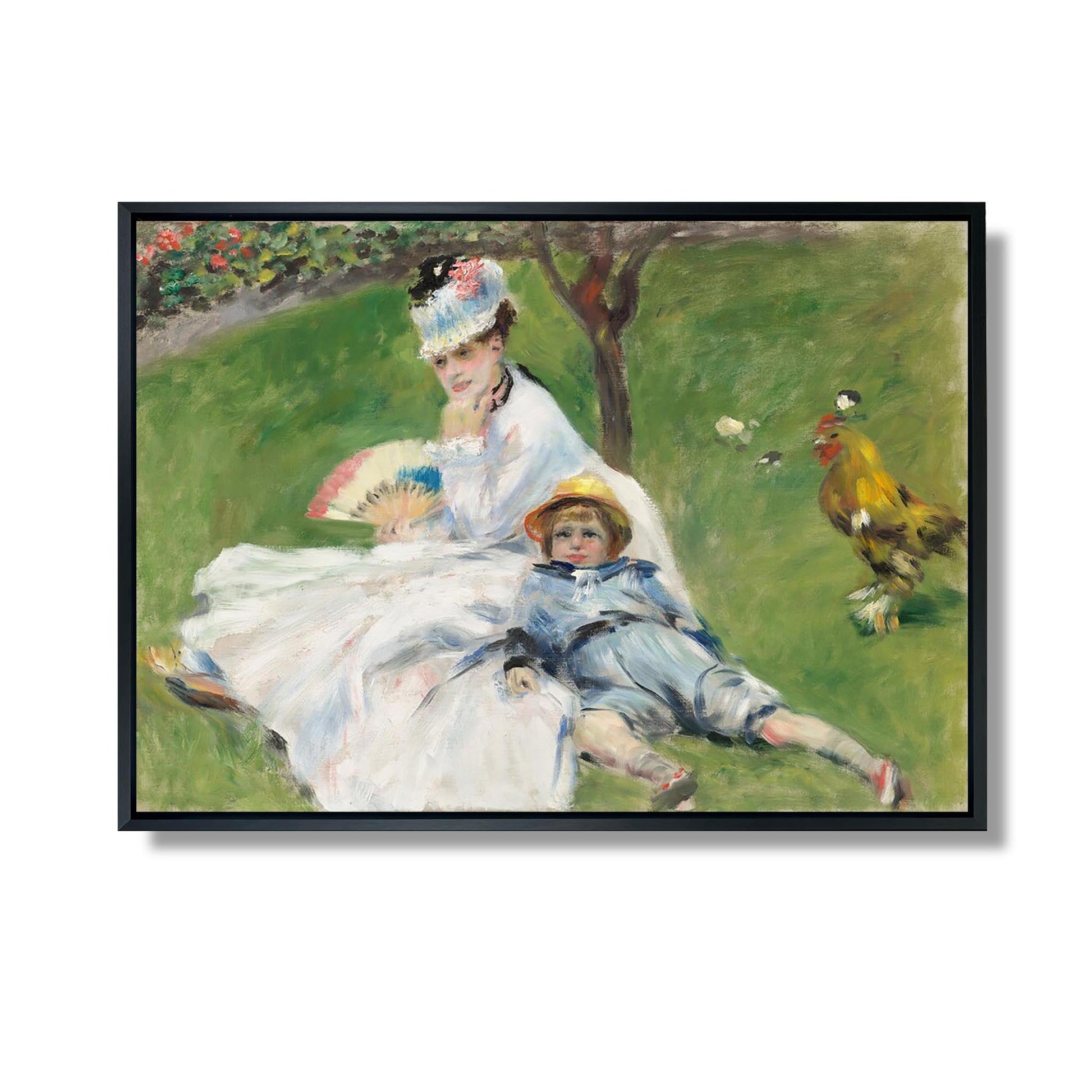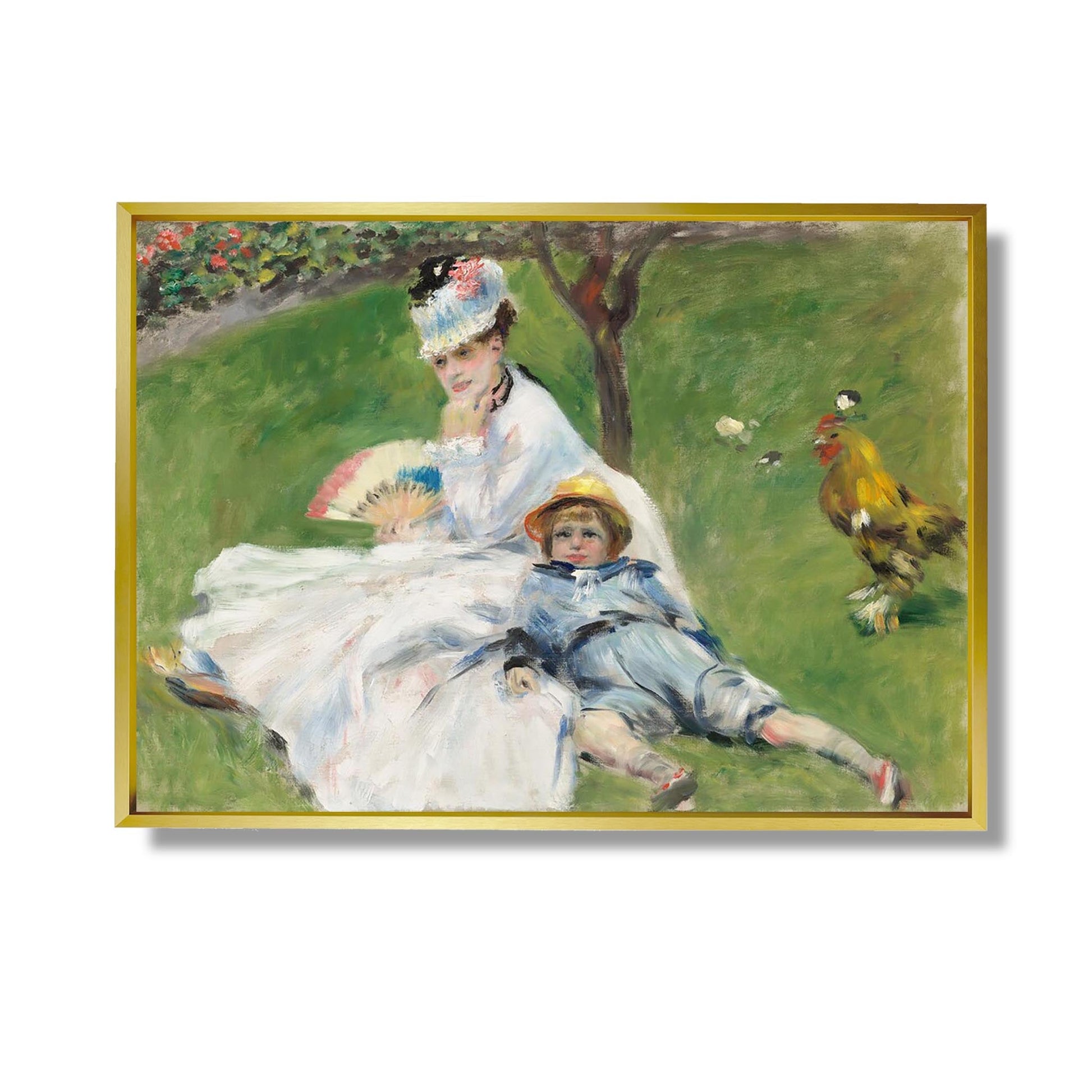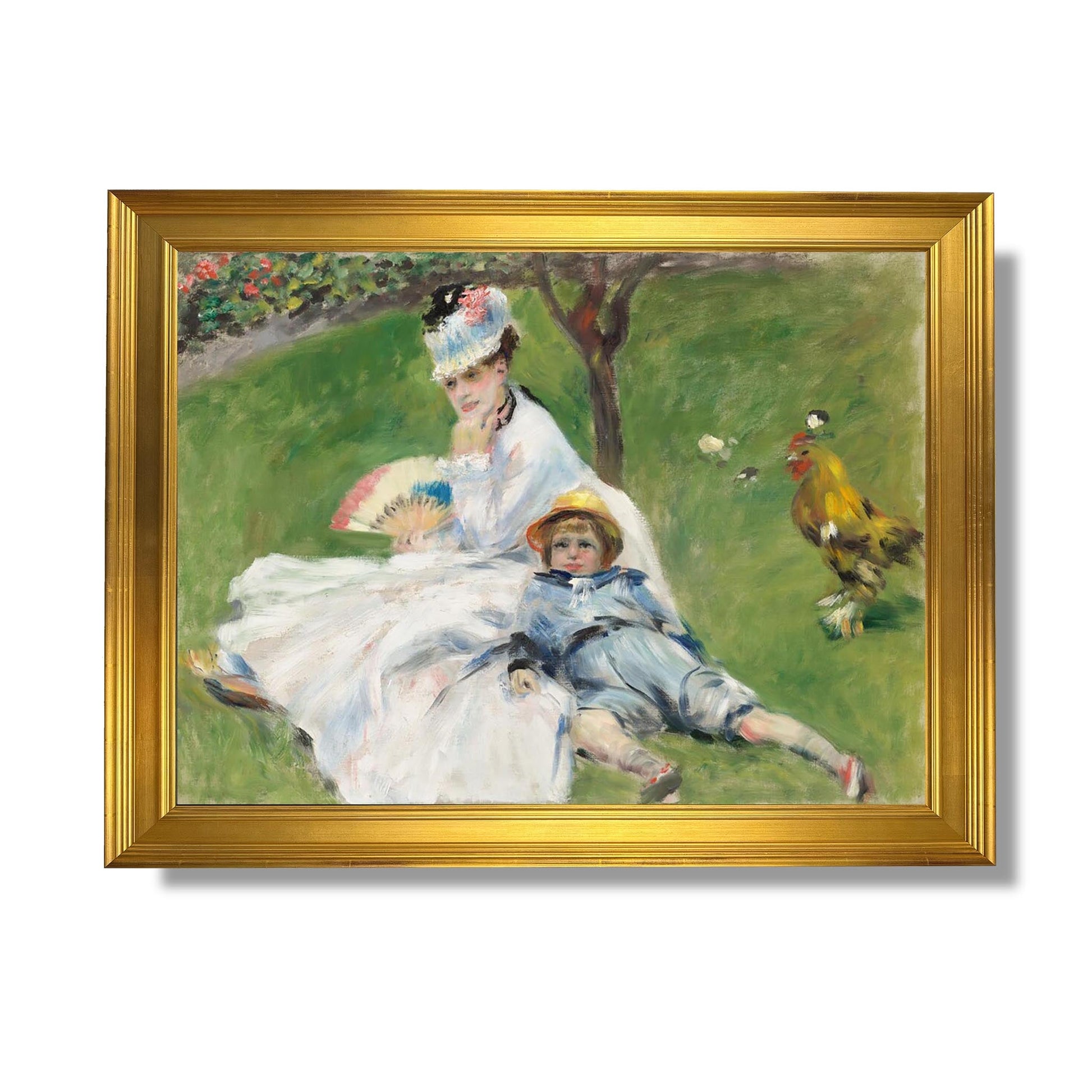 „Madame Monet und ihr Sohn“ ist ein ikonisches Werk von Auguste Renoir, gemalt im Jahr 1874. Dieses Gemälde zeigt Claude Monets Frau Camille, wie sie ihren Sohn Jean in einem blühenden Garten hält. Die Komposition strahlt eine Atmosphäre der Zärtlichkeit und Gelassenheit aus und fängt einen intimen Moment des Familienlebens ein. Renoir verwendet leuchtende Farben und fließende Pinselstriche, um das natürliche Licht und die Schönheit impressionistischer Landschaften hervorzurufen. Dieses Werk veranschaulicht die Harmonie zwischen Kunst und Alltag und beleuchtet zugleich die Themen Mutterschaft und Familienliebe.