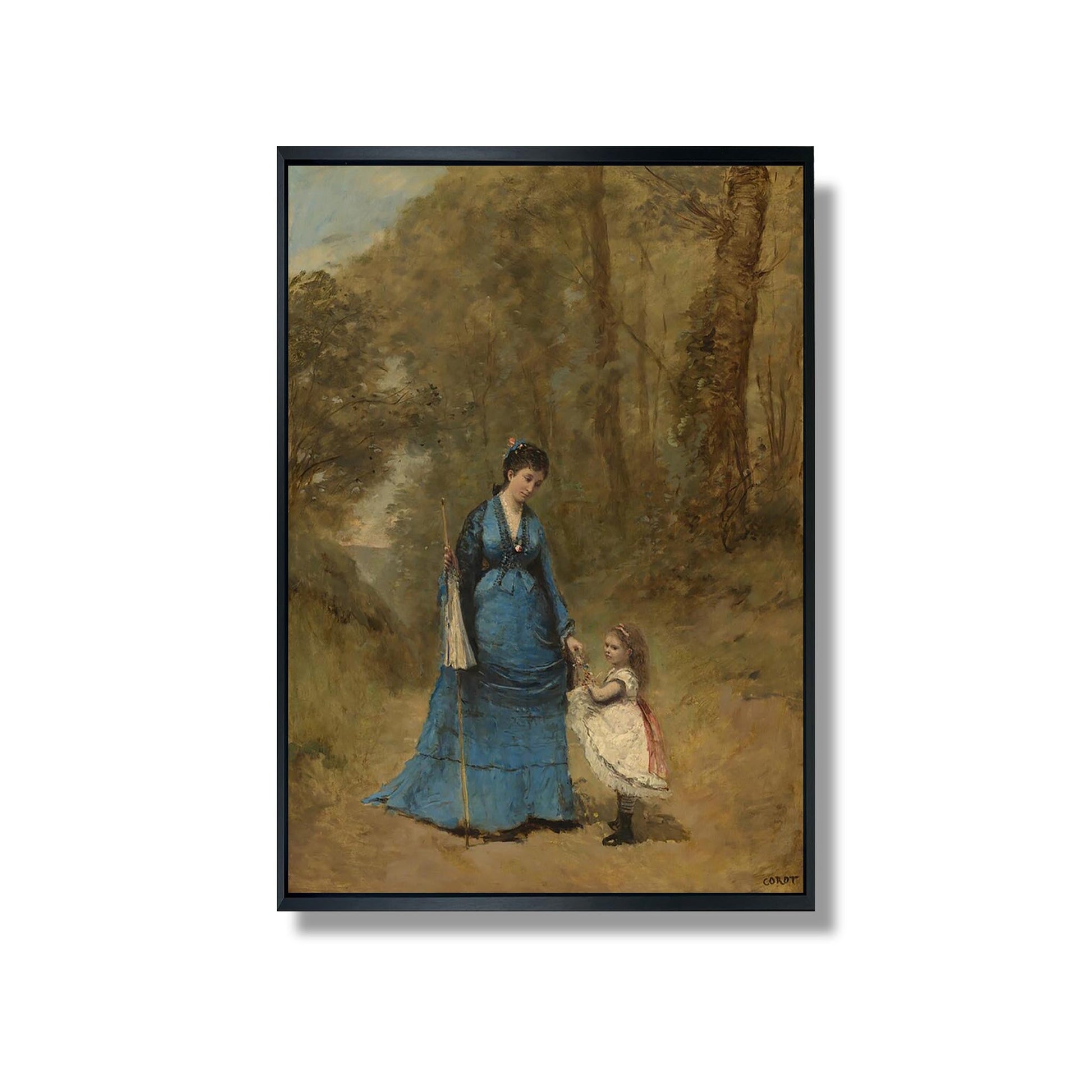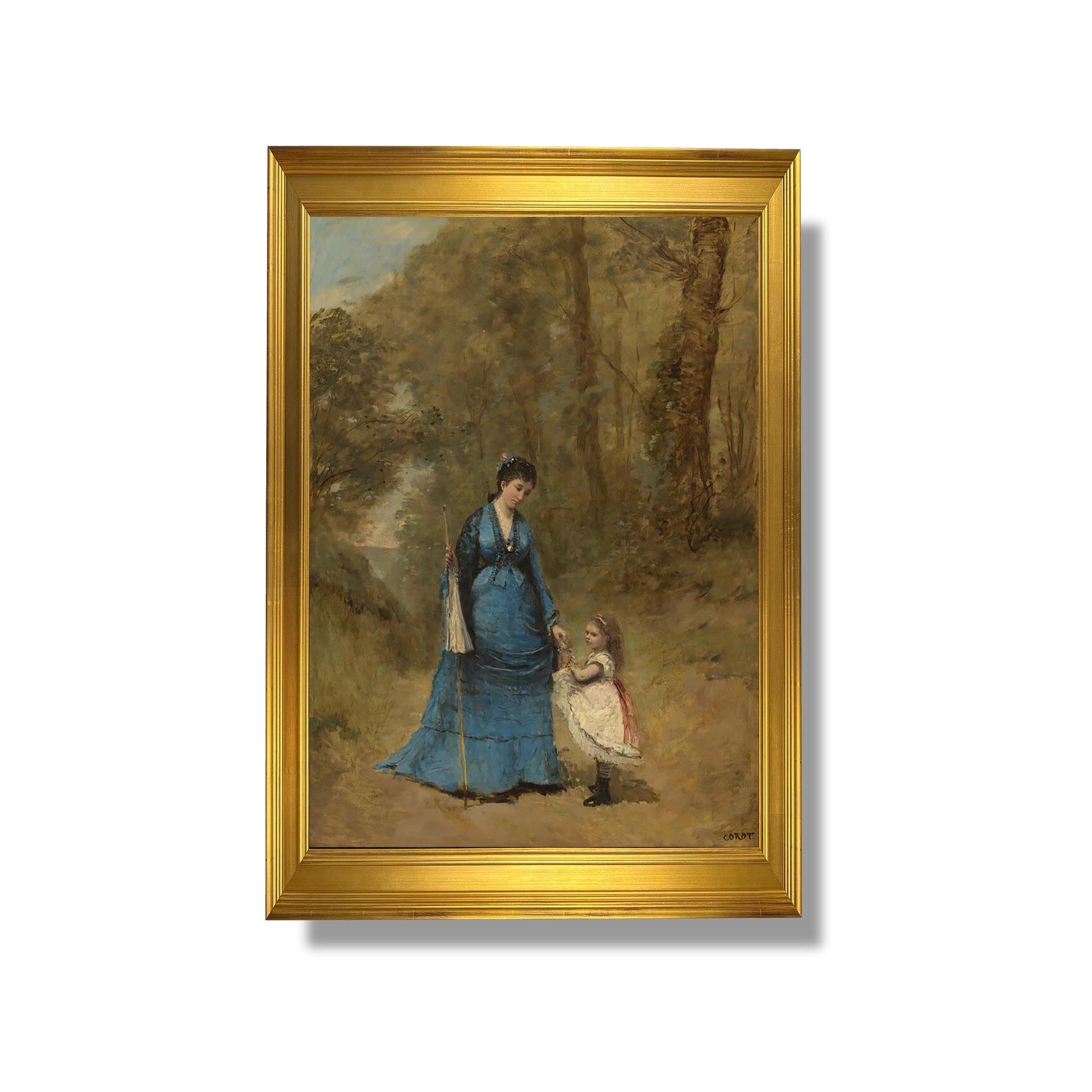 „Madame Stumpf und ihre Tochter“ ist ein ikonisches Werk von Jean-Baptiste-Camille Corot aus dem Jahr 1874. Dieses Gemälde veranschaulicht die Sensibilität des Künstlers für Licht und Natur und hebt gleichzeitig die innige Beziehung zwischen einer Mutter und ihrer Tochter hervor. Corot, Meister der Landschaftsmalerei, verwendet sanfte Töne und zarte Berührungen, um eine friedliche Atmosphäre zu schaffen. Die Figuren sind in eine natürliche Umgebung eingebettet und betonen die Harmonie zwischen Mensch und Umwelt. Dieses Werk veranschaulicht Corots Entwicklung hin zu einem intimeren Stil, wobei er gleichzeitig seiner Liebe zur Schönheit der Welt treu bleibt.