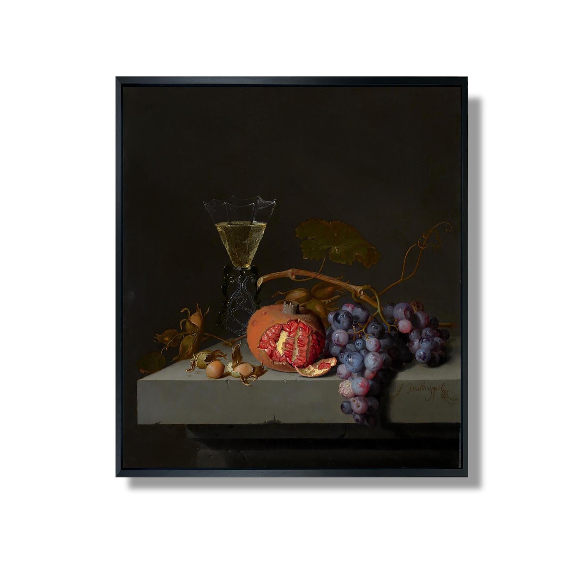 Jacob van Walscapelle, ein niederländischer Maler des 17. Jahrhunderts, ist für seine lebendigen und detailreichen Stillleben bekannt. In seinem Werk „Stillleben mit Früchten“ fängt er die Essenz des Alltags durch eine Komposition ein, die reich an Farben und Texturen ist. Die sorgfältig angeordneten Früchte erinnern an den Reichtum der Natur und die vergängliche Schönheit des Lebens. Das Spiel aus Licht und Schatten hebt den Glanz der Oberflächen hervor, während der dunkle Hintergrund die Helligkeit der Objekte akzentuiert. Dieses Werk ist ein Beweis für das technische Können und den ausgeprägten Sinn für Ästhetik des Künstlers und feiert die Einfachheit und Pracht der natürlichen Welt.