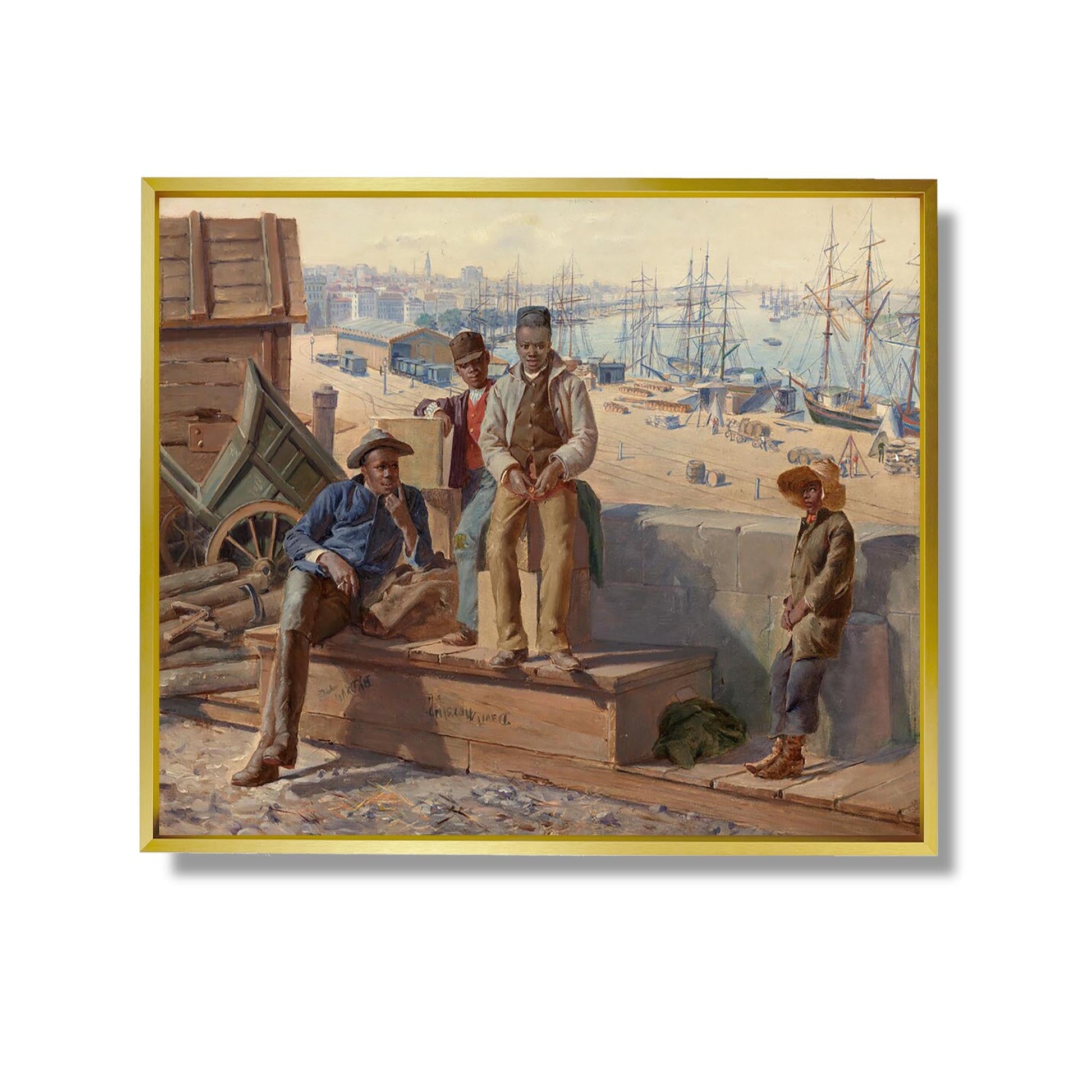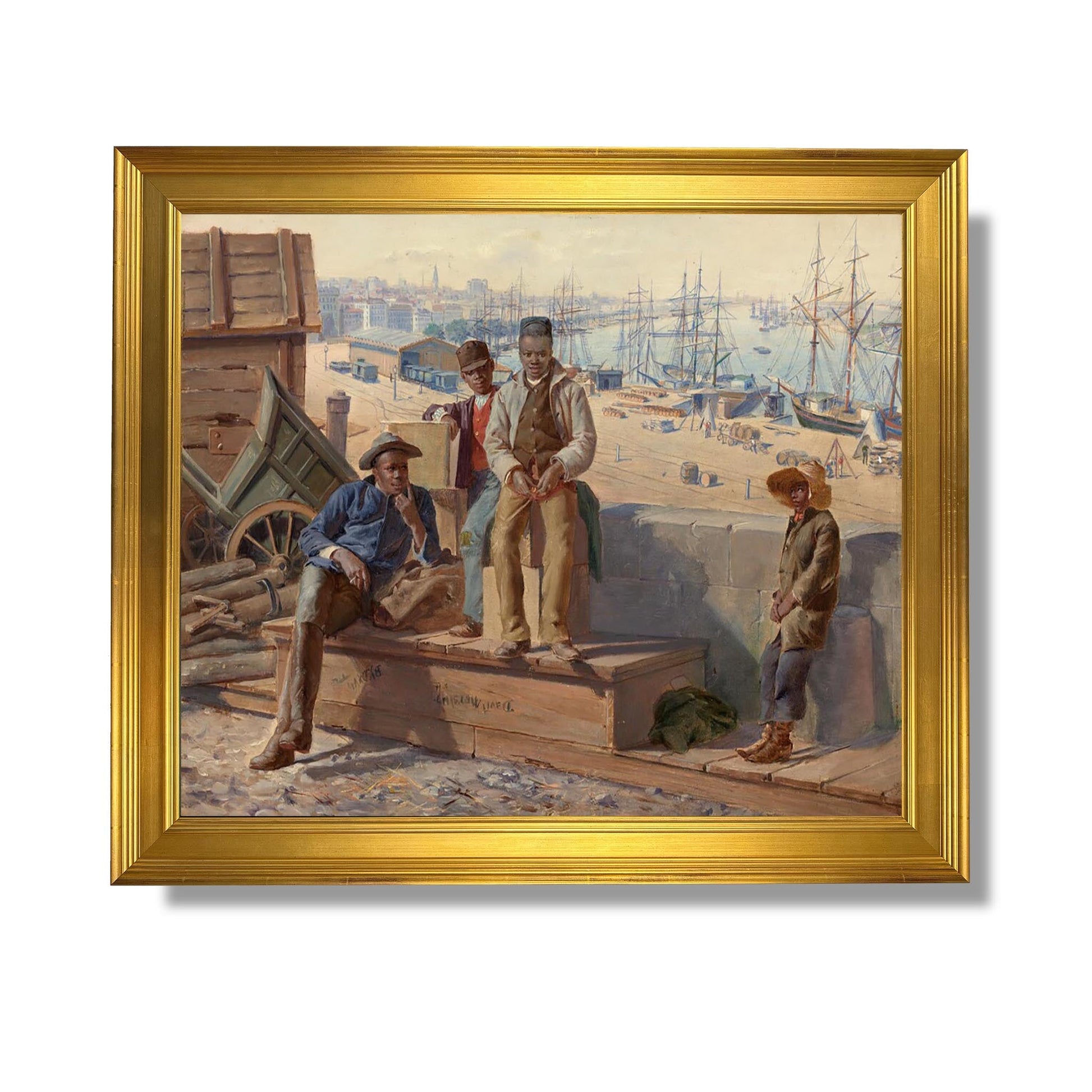 „Negro Boys on the Quayside“ von David Norslup ist ein ergreifendes Werk, das das tägliche Leben junger Jungen afrikanischer Abstammung am Kai einfängt. Mit einer lebendigen Farbpalette und sorgfältiger Detailarbeit stellt Norslup eine Szene voller Realismus und Emotionen dar. Die sowohl fröhlichen als auch nachdenklichen Charaktere erinnern an Themen wie Kameradschaft, Kampf und Hoffnung. Das Werk lädt den Betrachter ein, über Identität, Kultur und die Herausforderungen nachzudenken, denen diese jungen Menschen in einer oft feindseligen Welt gegenüberstehen. Es ist eine Feier der Widerstandskraft und der Schönheit der Jugend.