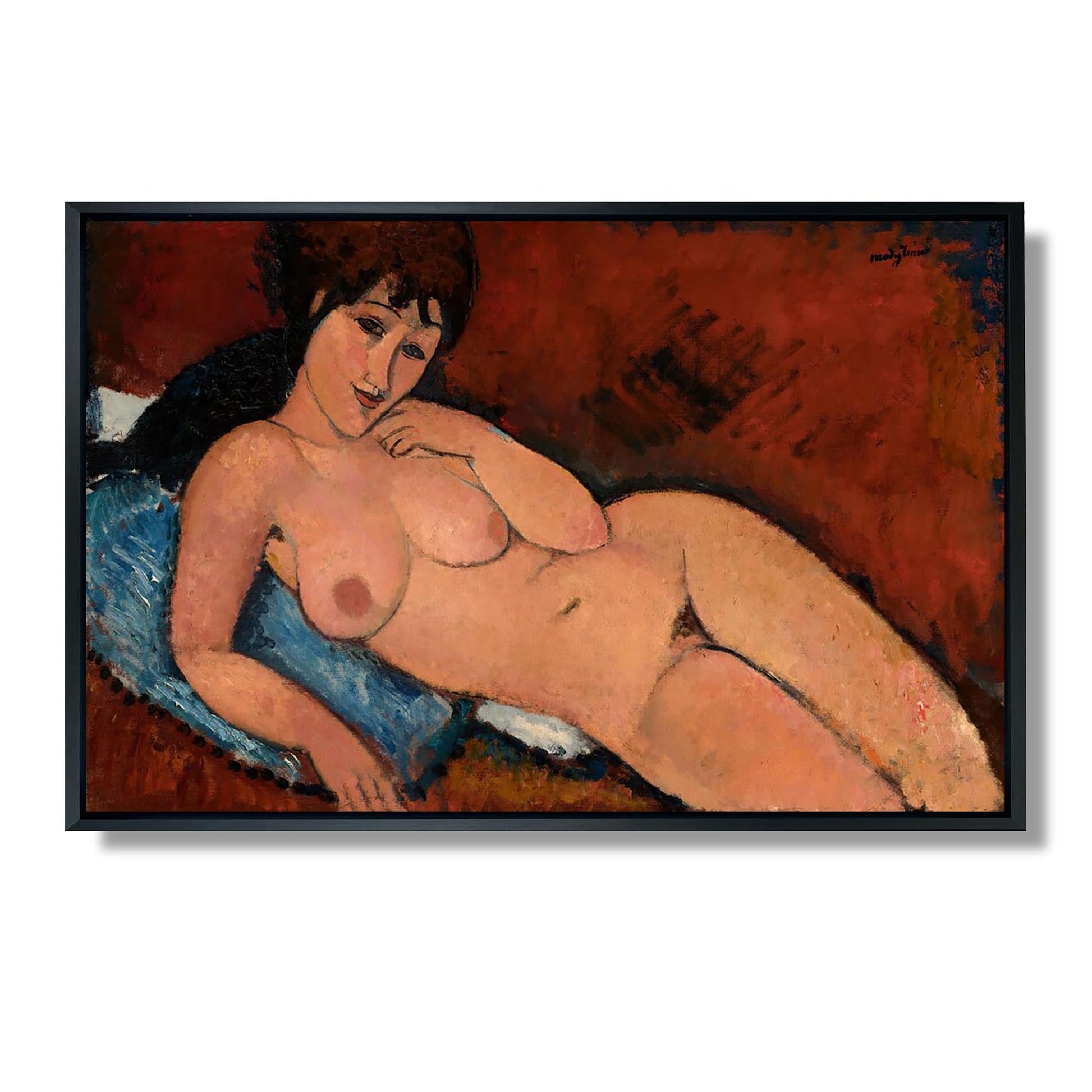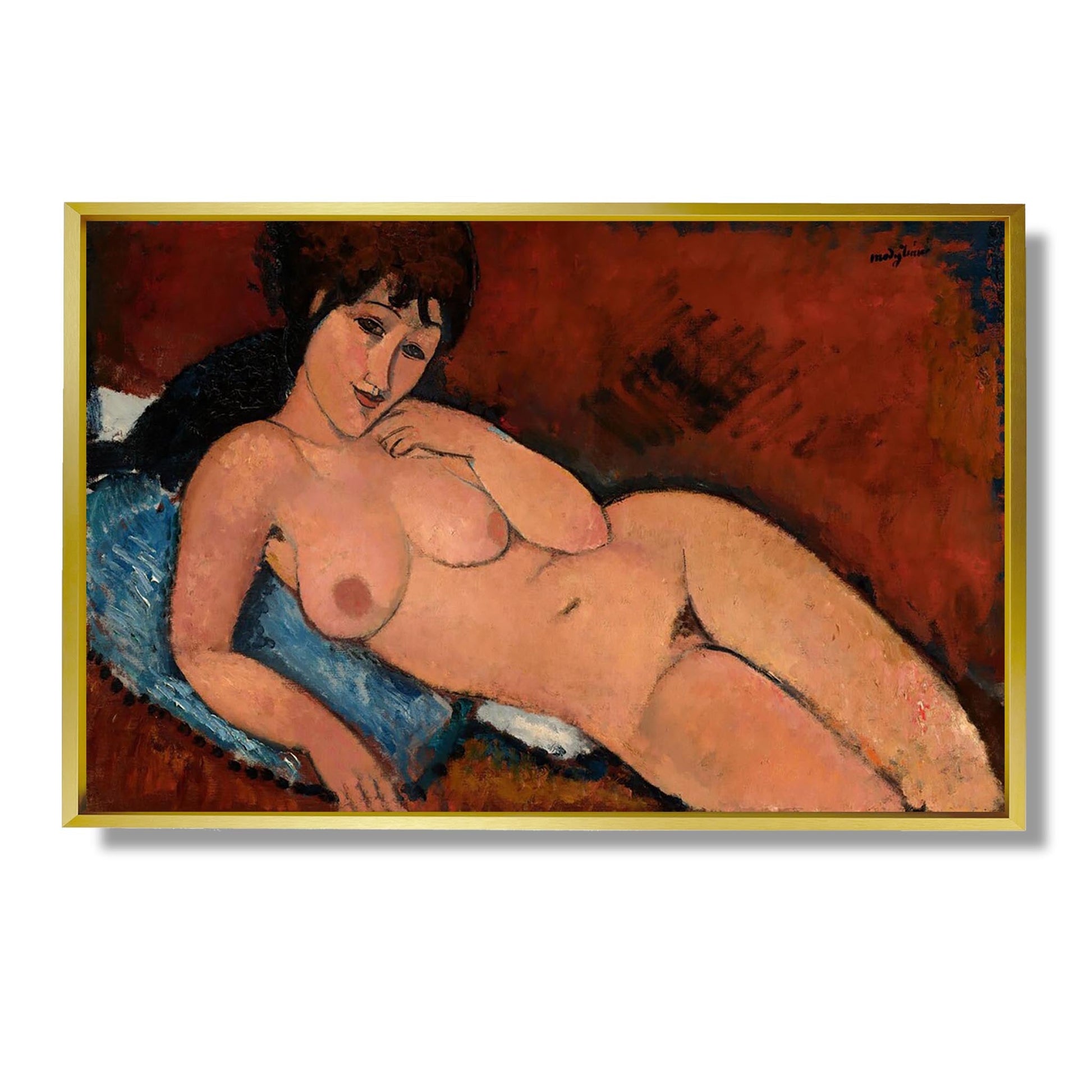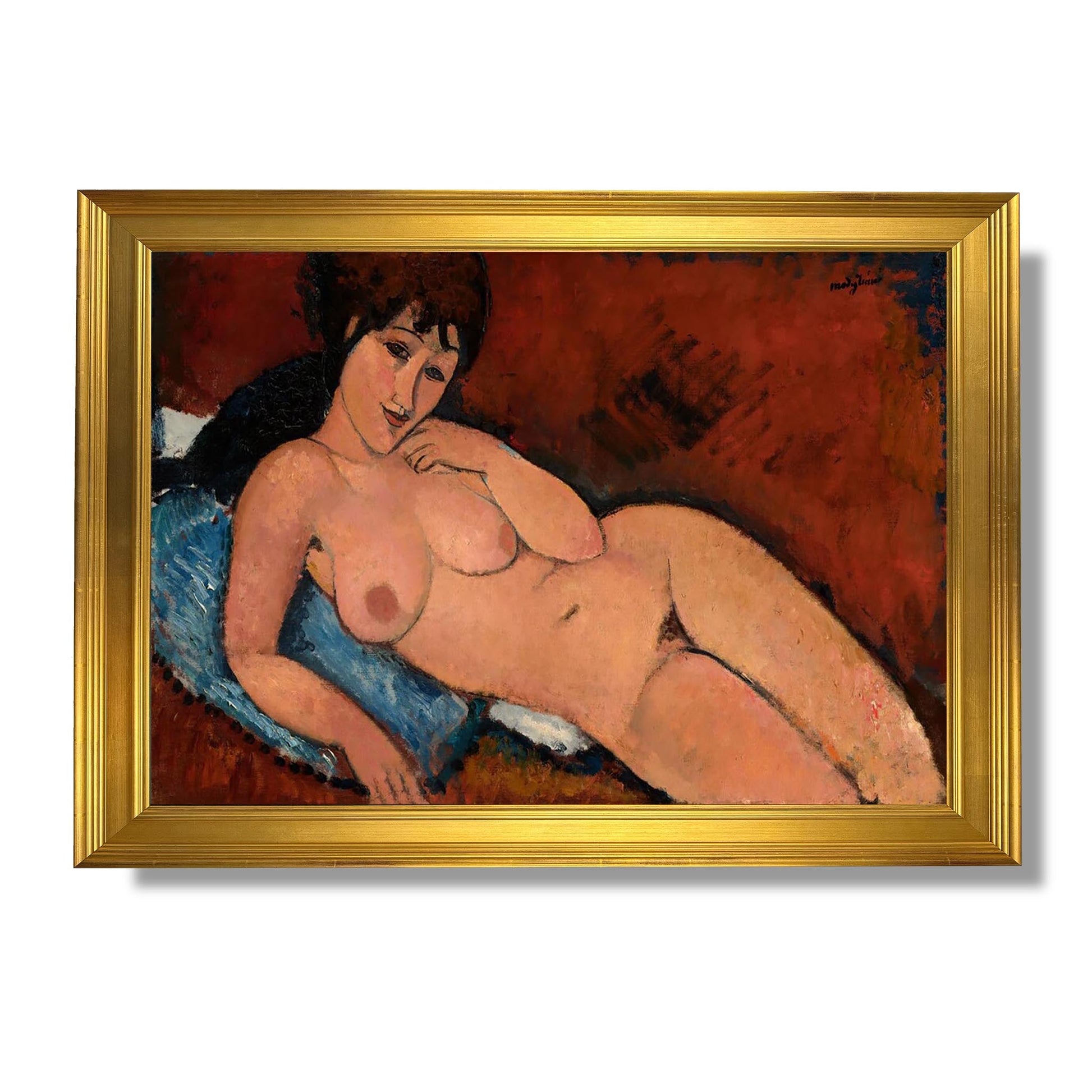 „Akt auf blauem Kissen“ ist ein ikonisches Werk von Amedeo Modigliani, gemalt im Jahr 1917. Dieses Gemälde veranschaulicht den einzigartigen Stil des Künstlers, der durch längliche Formen und sanfte Farben gekennzeichnet ist. Die nackt dargestellte Frau ruht auf einem blauen Kissen und ruft sowohl Sinnlichkeit als auch Melancholie hervor. Modigliani, beeinflusst vom Kubismus und der afrikanischen Kunst, gelingt es, die Essenz weiblicher Schönheit einzufangen und dabei über die einfache Darstellung hinauszugehen. Dieses Werk ist ein Beweis für seine Erforschung menschlicher Emotionen und seinen Wunsch, die menschliche Figur von akademischen Konventionen zu befreien.
