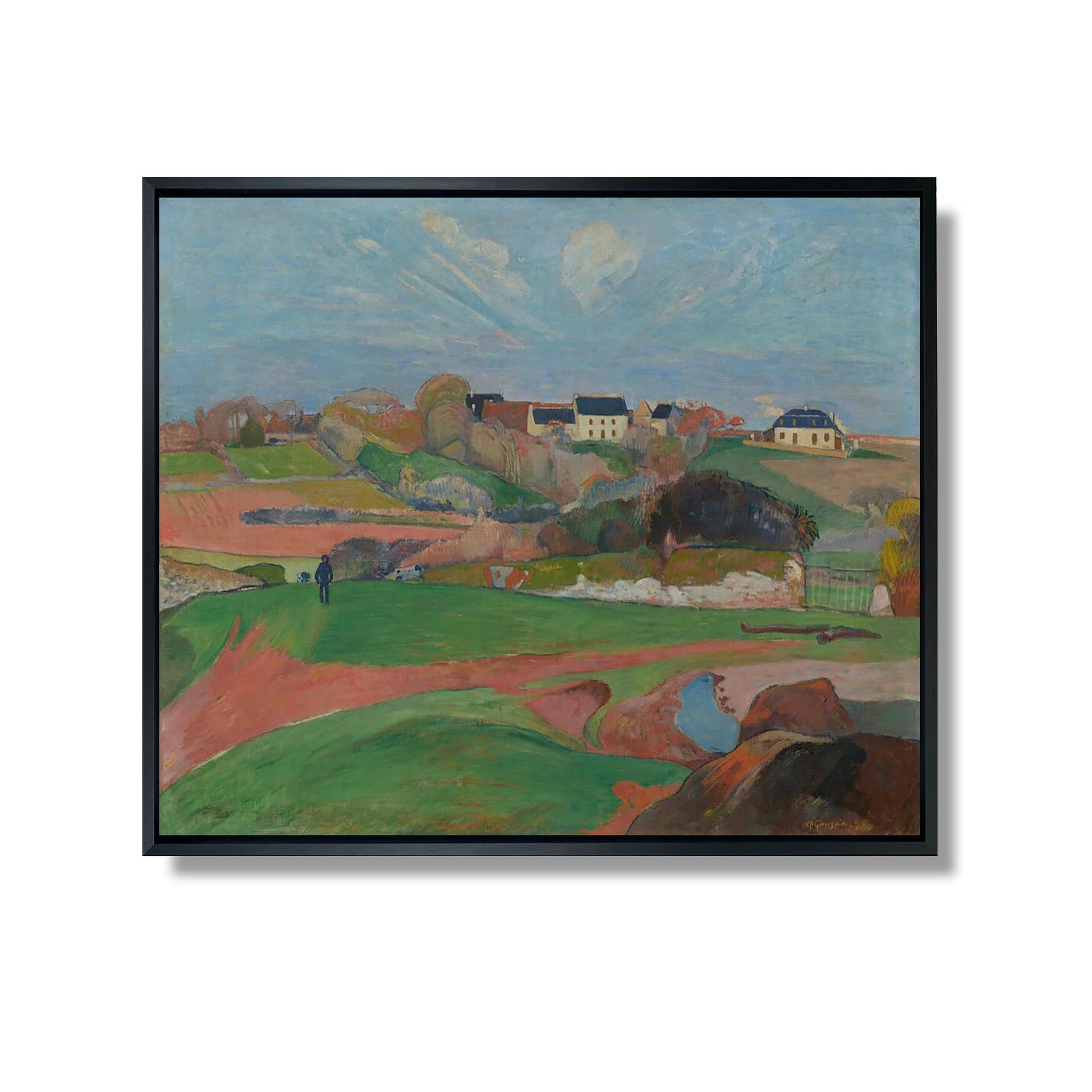 „Landschaft bei Pouldu“ ist ein emblematisches Werk von Paul Gauguin, das er 1890 während seines Aufenthalts in der Bretagne malte. Dieses Gemälde veranschaulicht die Suche des Künstlers nach einem authentischeren und ursprünglicheren Ausdruck, fernab von akademischen Konventionen. Die durch leuchtende Farben und vereinfachte Formen gekennzeichnete Komposition erinnert an die wilde Schönheit der bretonischen Landschaft. Kräftige Farbspritzer und fließende Linien zeigen den Einfluss des Postimpressionismus. Mit diesem Werk erforscht Gauguin die Beziehung zwischen Mensch und Natur und nimmt zugleich kommende moderne Kunstbewegungen vorweg.