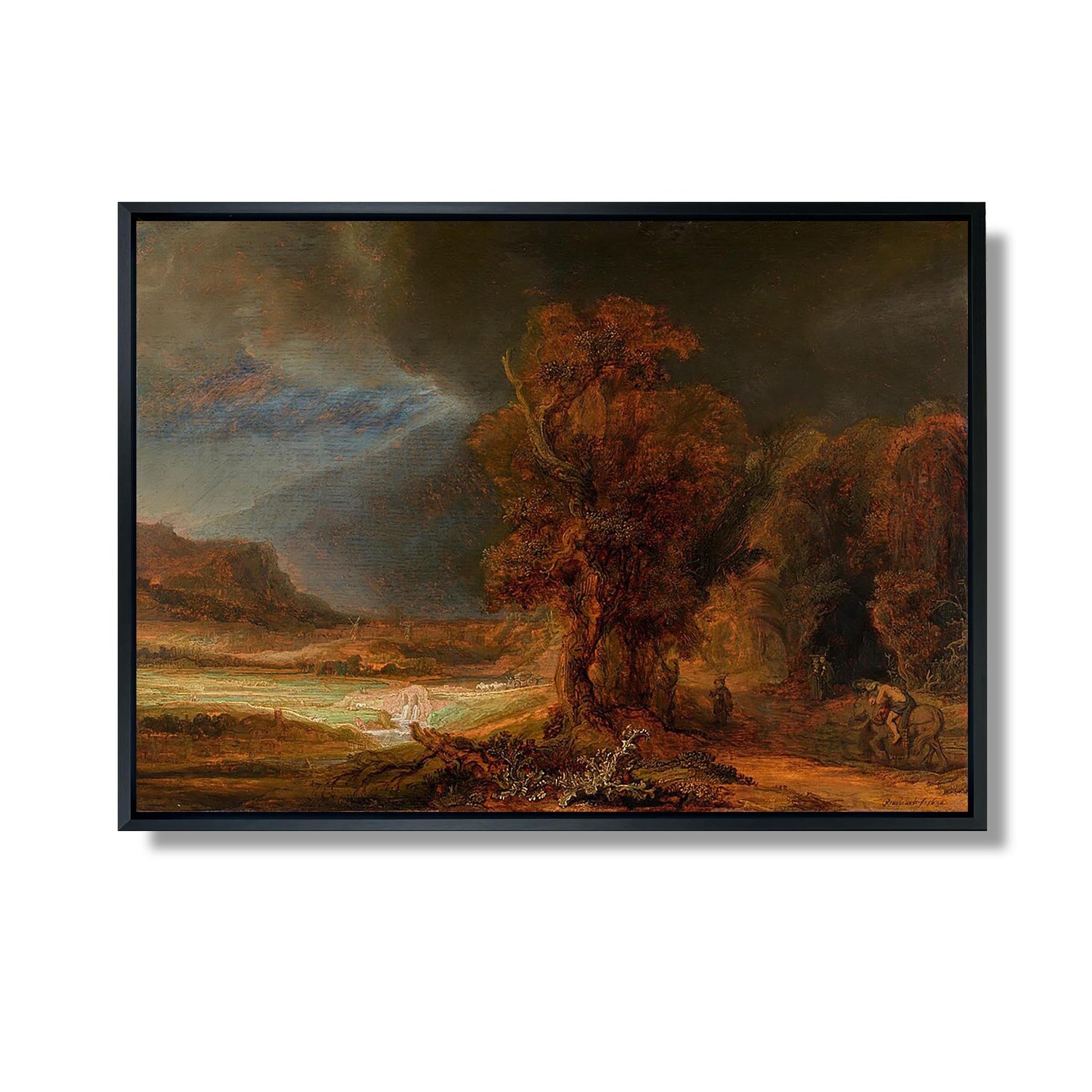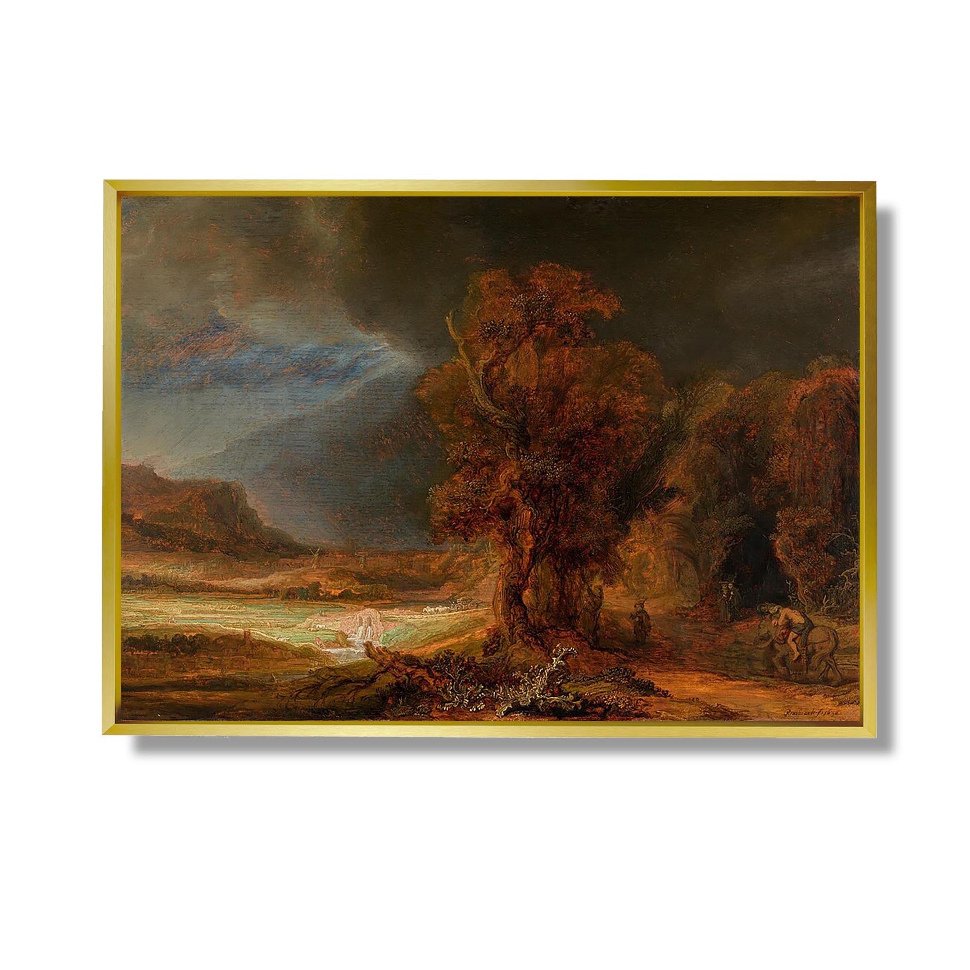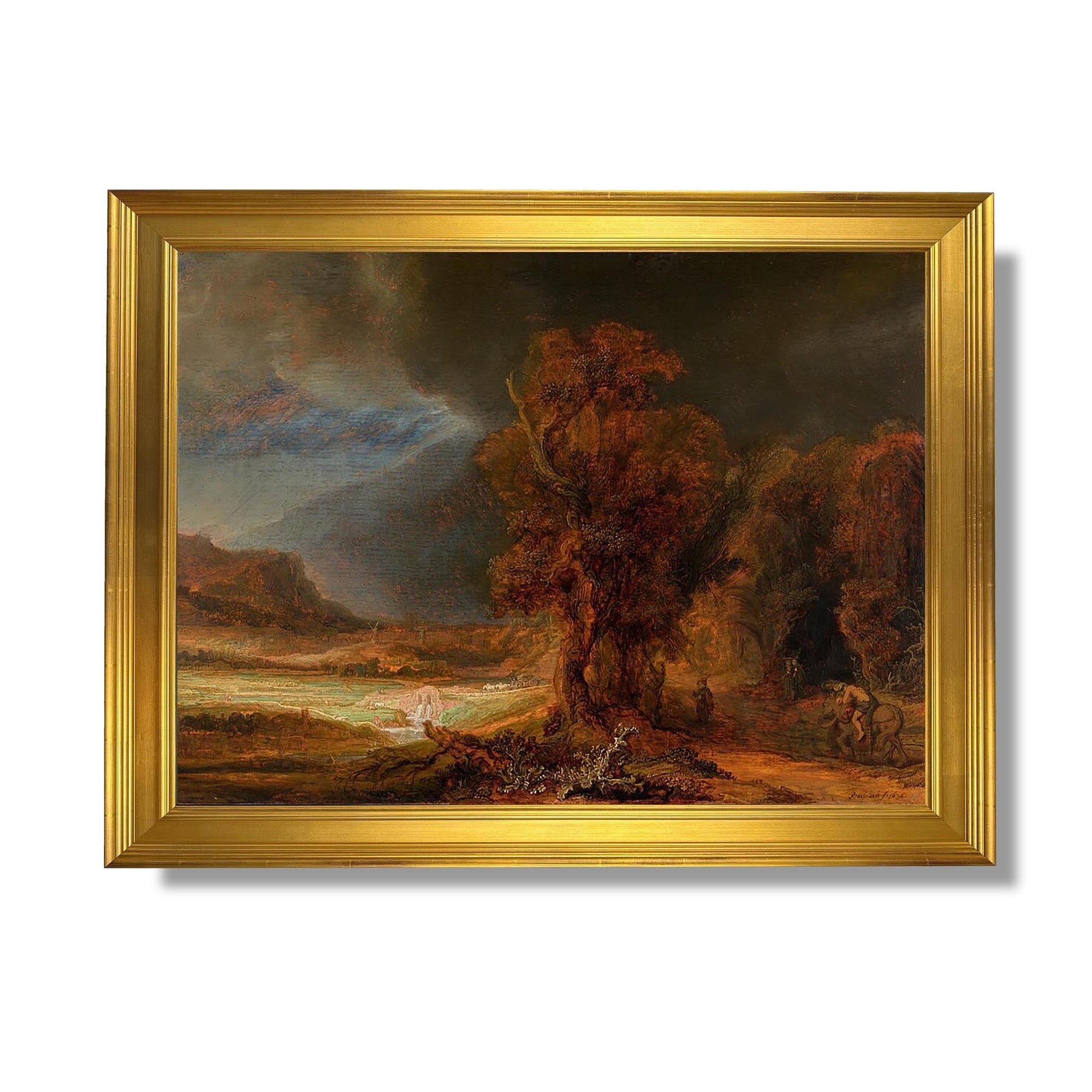 „Landschaft mit dem barmherzigen Samariter“ ist ein ikonisches Werk von Rembrandt, das um 1630 gemalt wurde. Dieses Gemälde illustriert das berühmte biblische Gleichnis vom barmherzigen Samariter und zeigt einen verwundeten Reisenden, der von einem mitfühlenden Fremden gerettet wird. Rembrandt, ein Meister von Licht und Schatten, verwendet auffällige Kontraste, um die Emotionen der Szene hervorzuheben. Die detailreiche Landschaft dient als Hintergrund für die Menschlichkeit der Geste. Das Werk thematisiert universelle Themen wie Mitgefühl und Altruismus und zeigt gleichzeitig Rembrandts außergewöhnliches Talent, die psychologische Tiefe der Charaktere einzufangen.
