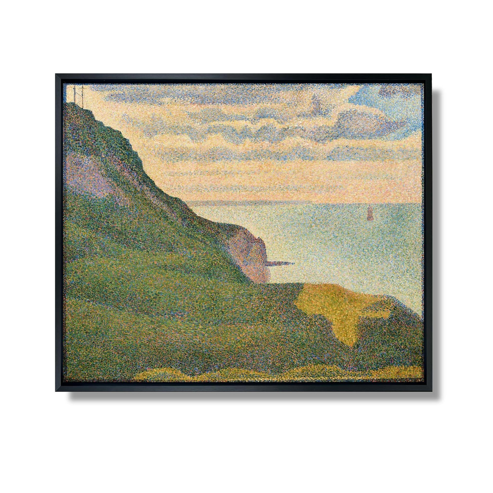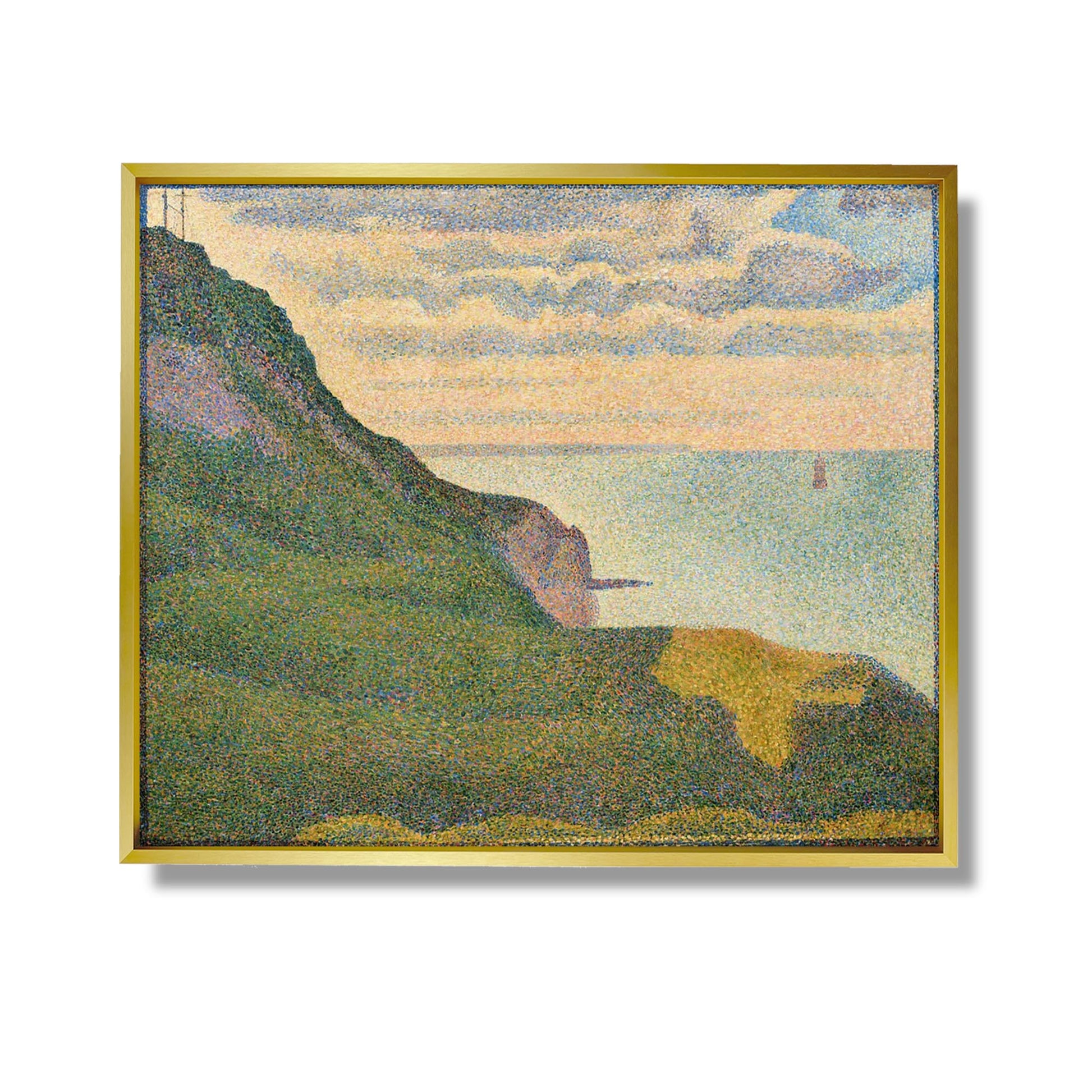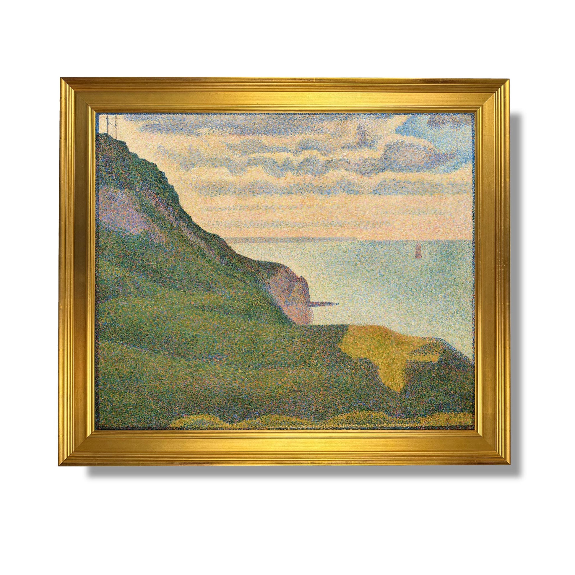 „Seelandschaft bei Port-en-Bessin, Normandie“ ist ein ikonisches Werk von Georges Seurat aus dem Jahr 1888. Dieses Gemälde veranschaulicht die für den Künstler typische Pointillismus-Technik, bei der durch das Auftragen nebeneinander liegender Farbtupfer eine visuelle Harmonie geschaffen wird. Die Szene zeigt einen geschäftigen Hafen in der Normandie, wo Meer und Himmel in leuchtenden Farbtönen verschmelzen. Seurat fängt das Licht und die maritime Atmosphäre mit bemerkenswerter Präzision ein und ruft gleichzeitig ein Gefühl der Ruhe und Gelassenheit hervor. Dieses Werk veranschaulicht seine Auseinandersetzung mit der Wirkung von Farbe und Licht und stellt einen wichtigen Schritt in der Entwicklung des Impressionismus dar.