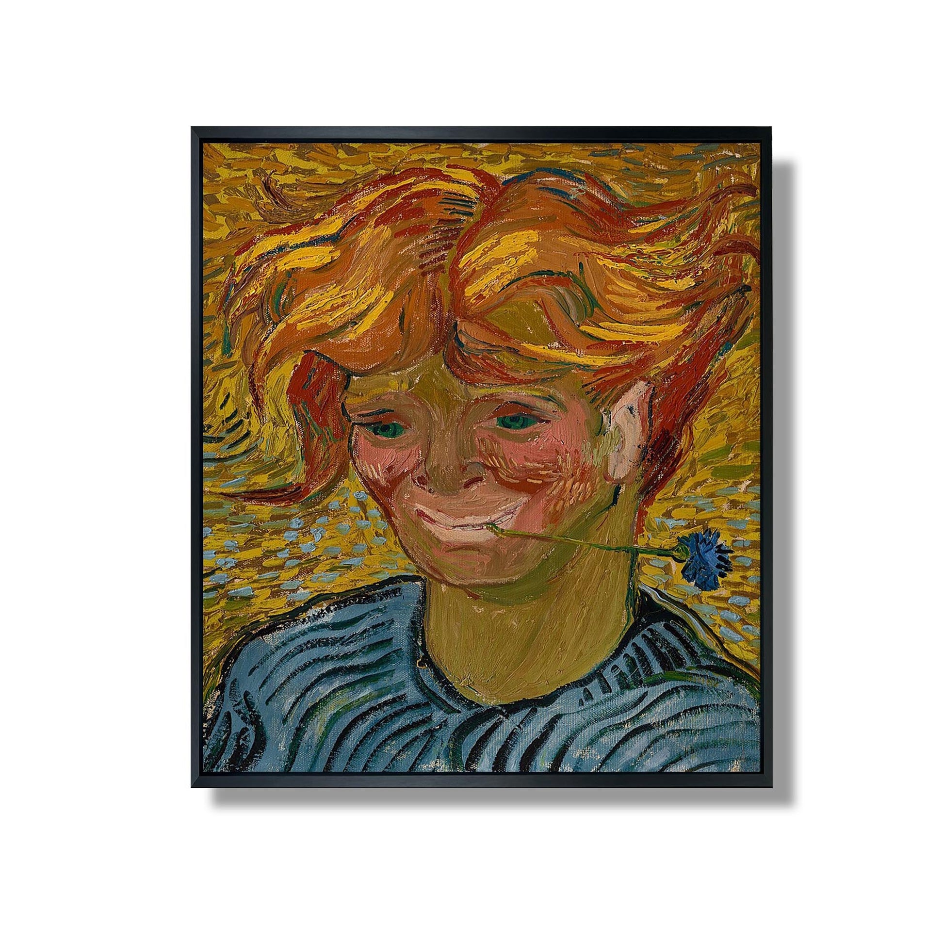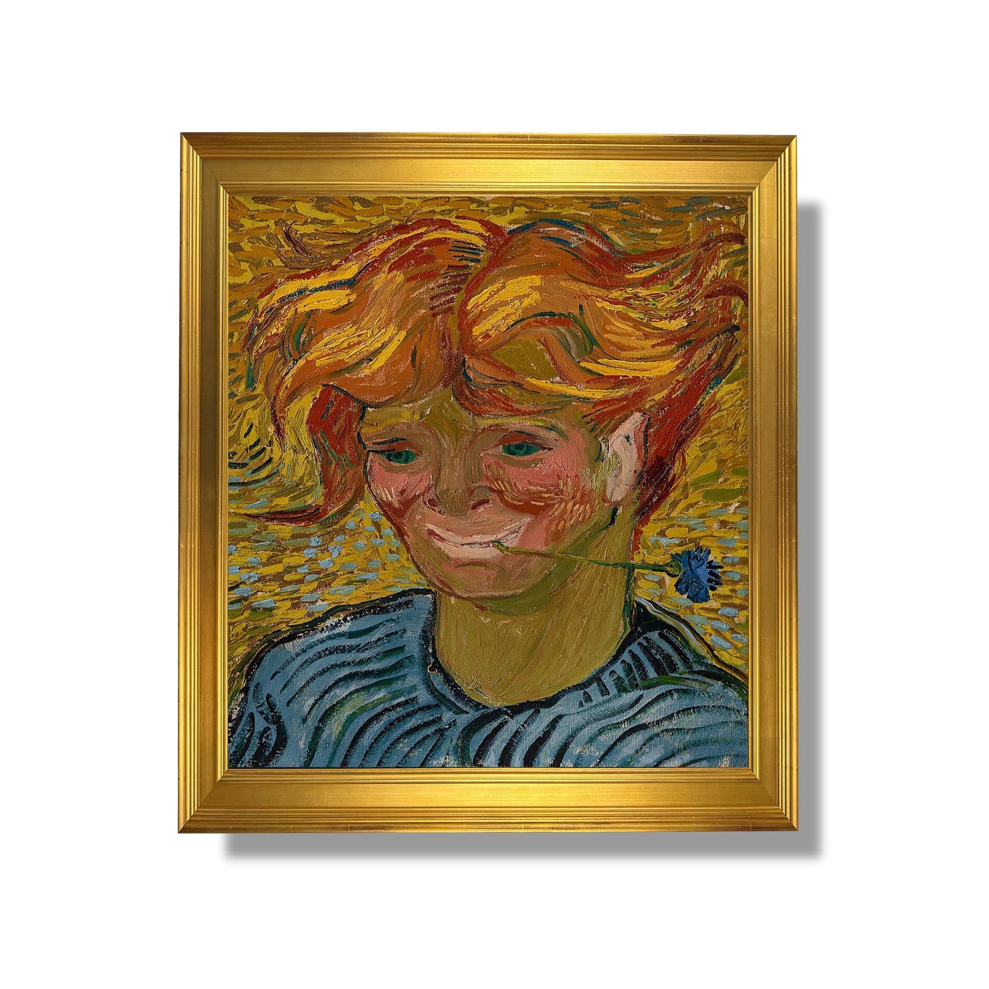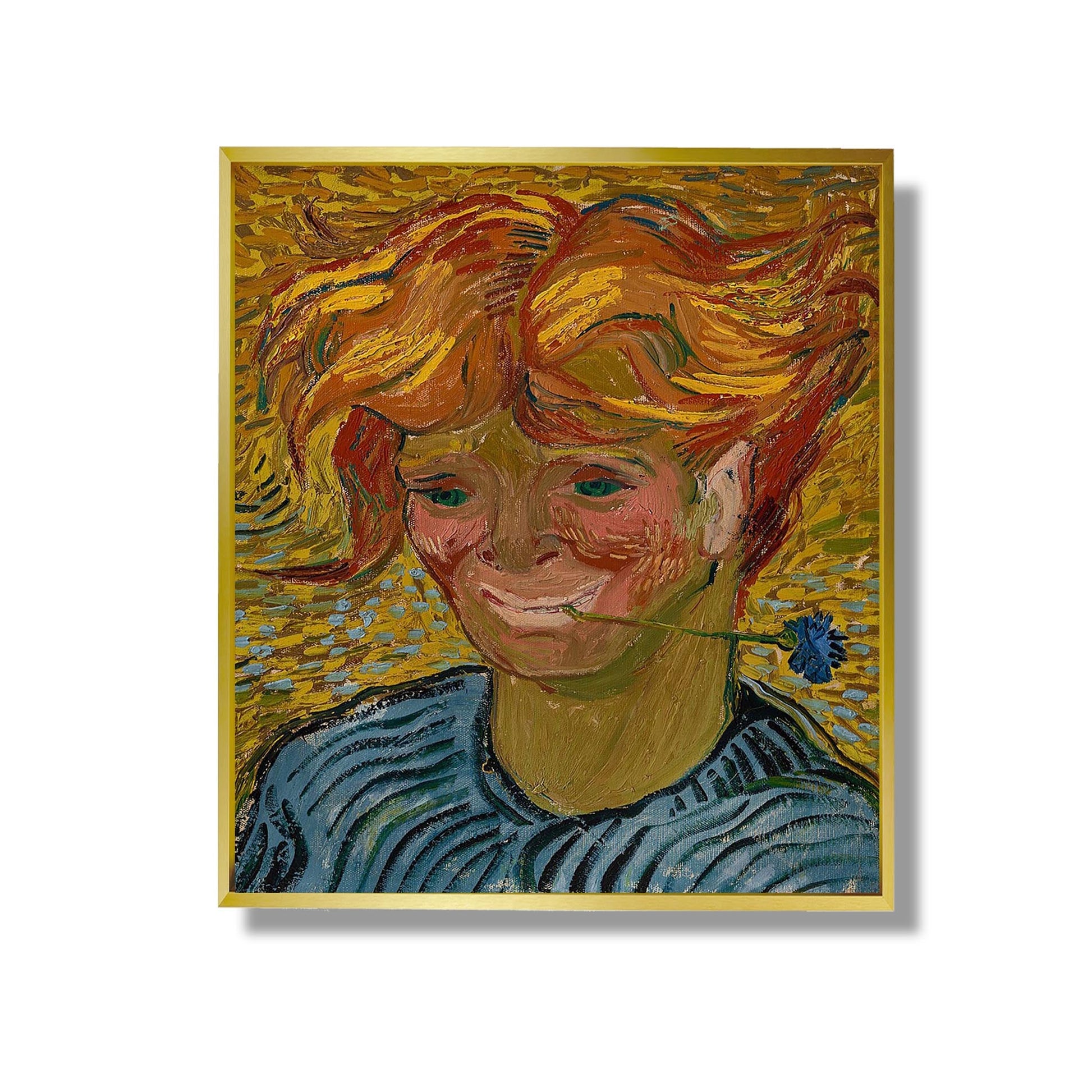 „Porträt eines jungen Mannes mit Kornblume“ ist ein ikonisches Werk von Vincent Van Gogh, das 1888 entstand. Dieses Gemälde zeigt einen jungen Mann, wahrscheinlich einen Freund des Künstlers, der eine Kornblume im Knopfloch trägt. Die Komposition zeichnet sich durch leuchtende Farben und ausdrucksstarke Pinselstriche aus, die für Van Goghs postimpressionistischen Stil charakteristisch sind. Der kräftige Einsatz von Farbtönen und das Licht, das das Gesicht des Modells beleuchtet, zeugen von der Emotion und Sensibilität des Künstlers. Dieses Porträt veranschaulicht Van Goghs Bestreben, die menschliche Seele durch Farbe und Form einzufangen.