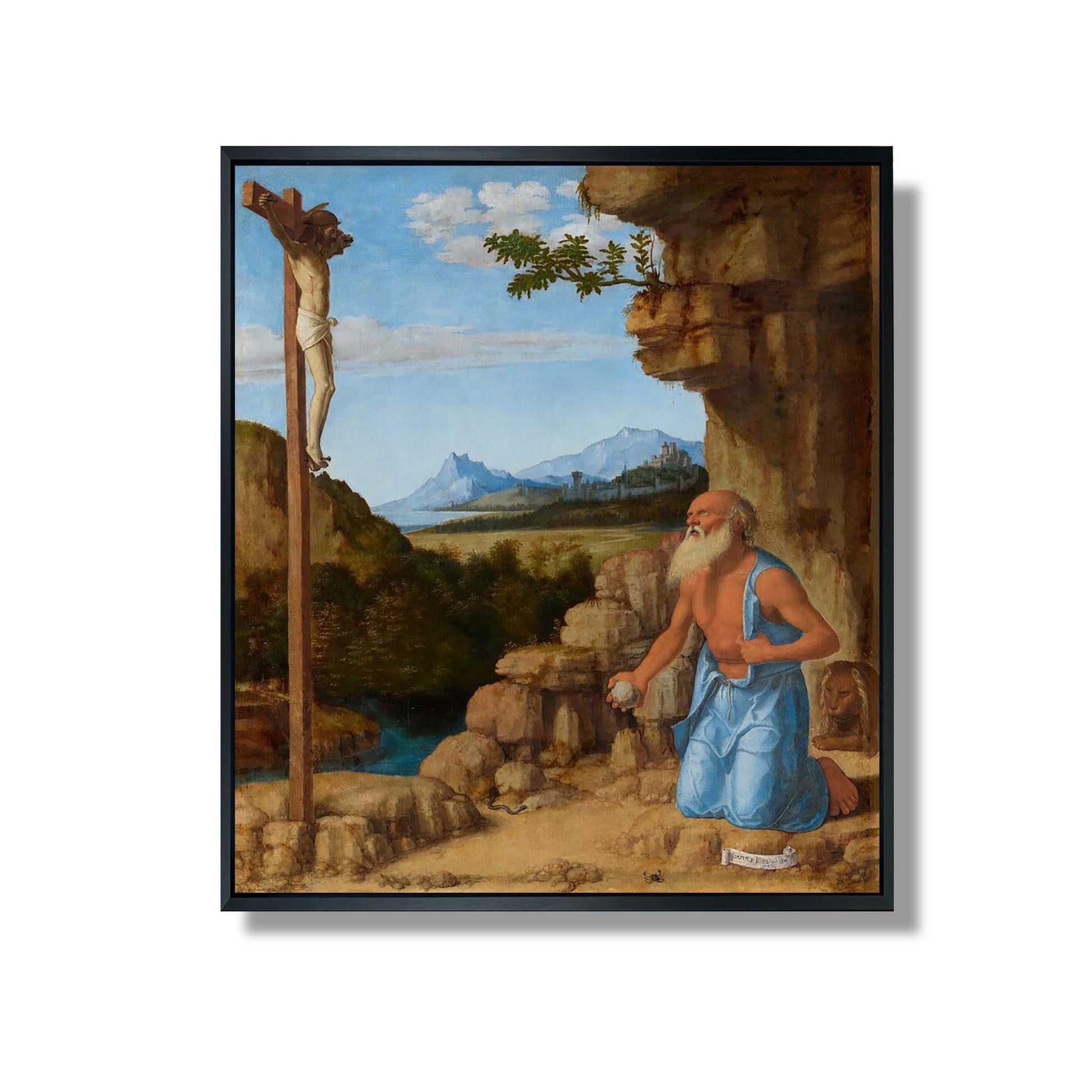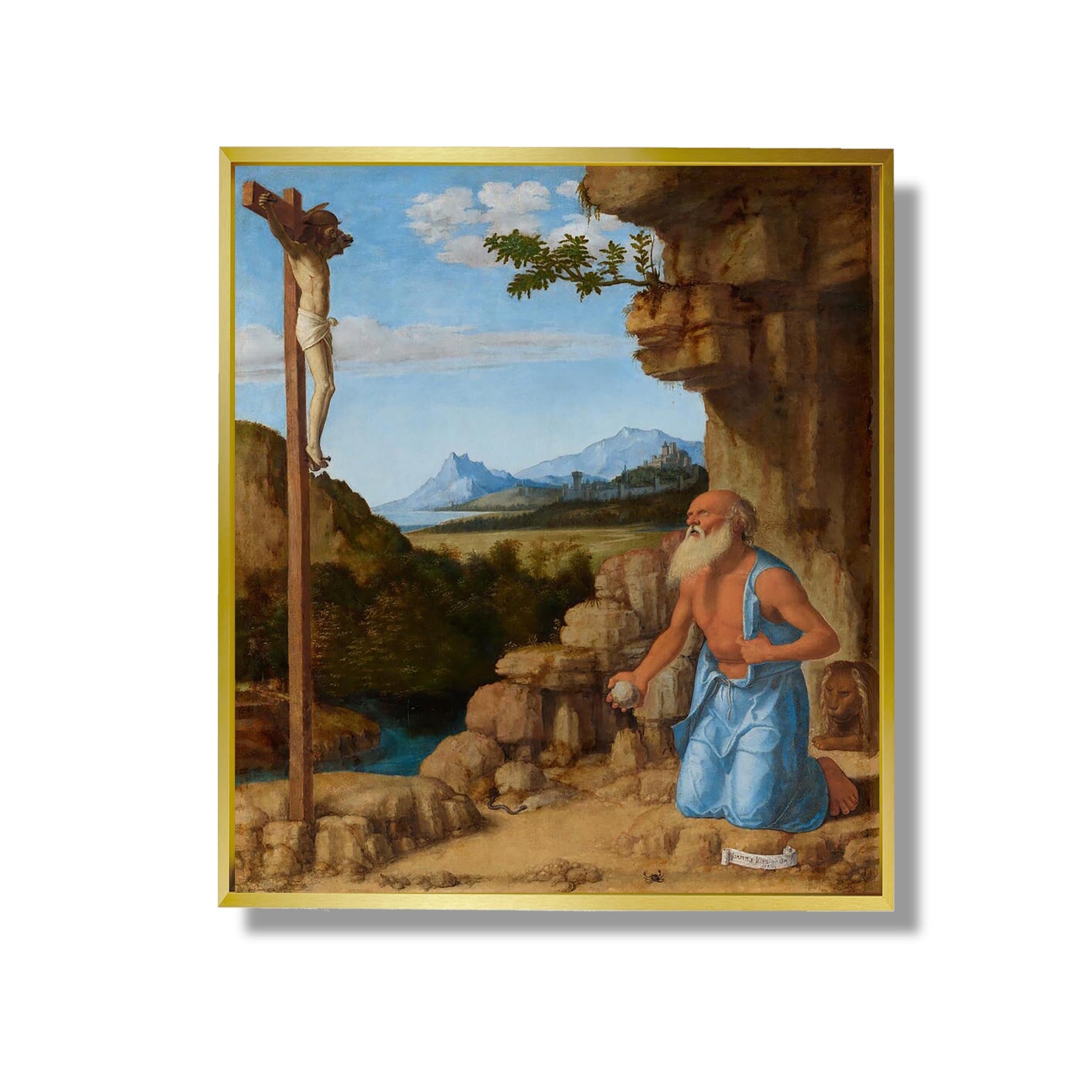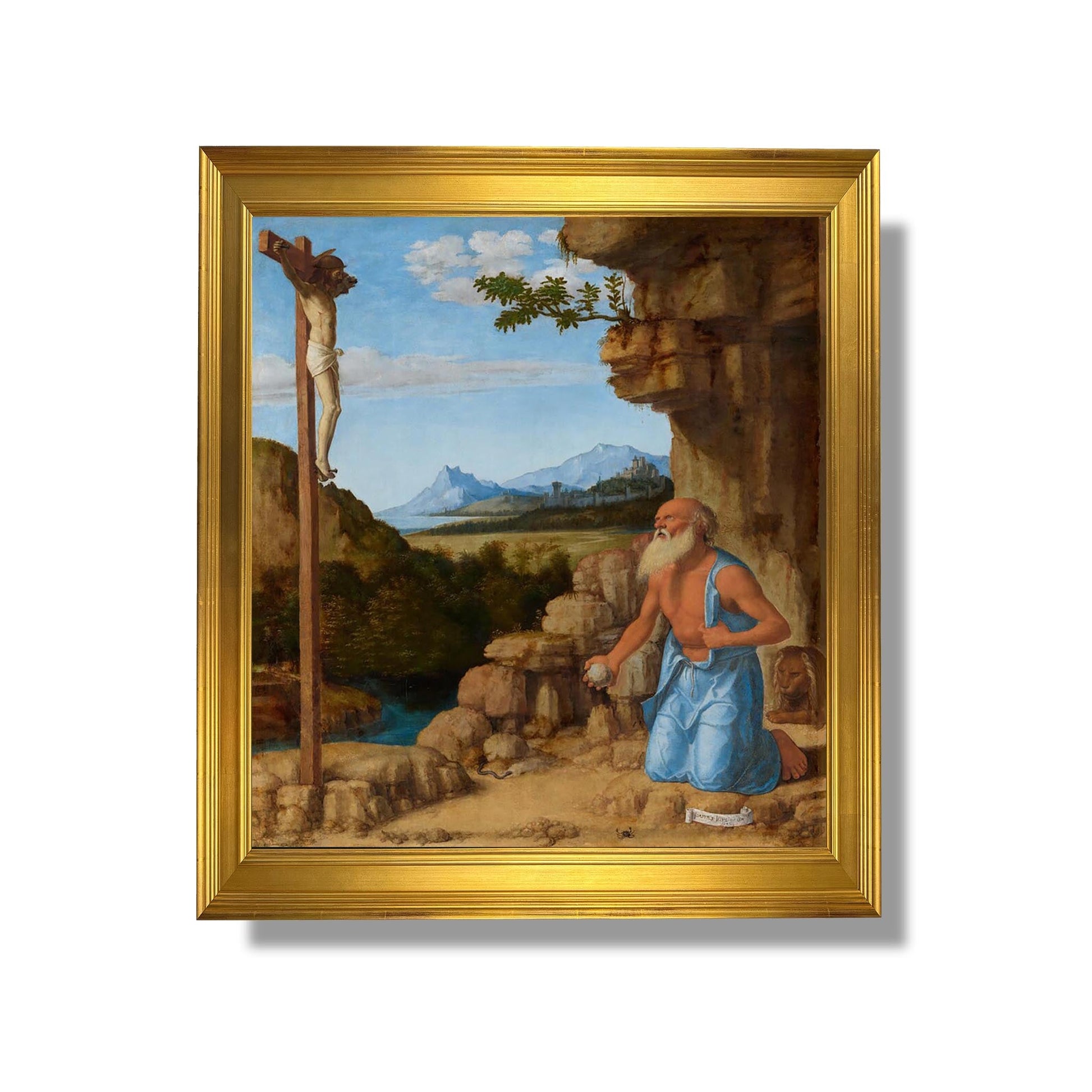 „Der Heilige Hieronymus in der Wüste“ von Cima da Conegliano ist ein ikonisches Werk der italienischen Renaissance, das um 1500 entstand. Dieses Gemälde zeigt den Heiligen Hieronymus, einen christlichen Gelehrten, der in einer Wüstenlandschaft meditiert. Der Künstler verwendet eine sanfte Farbpalette und subtiles Licht, um eine Atmosphäre der Gelassenheit und Kontemplation zu schaffen. Die Figur des Hieronymus, umgeben von Büchern und einem Löwen, symbolisiert Weisheit und Einsamkeit. Cima da Conegliano verbindet mit seinem unverwechselbaren Stil Realismus und Spiritualität und bietet eine Reflexion über die Suche nach Wissen und Glauben. Dieses Werk veranschaulicht perfekt die Harmonie zwischen Natur und Selbstbeobachtung.