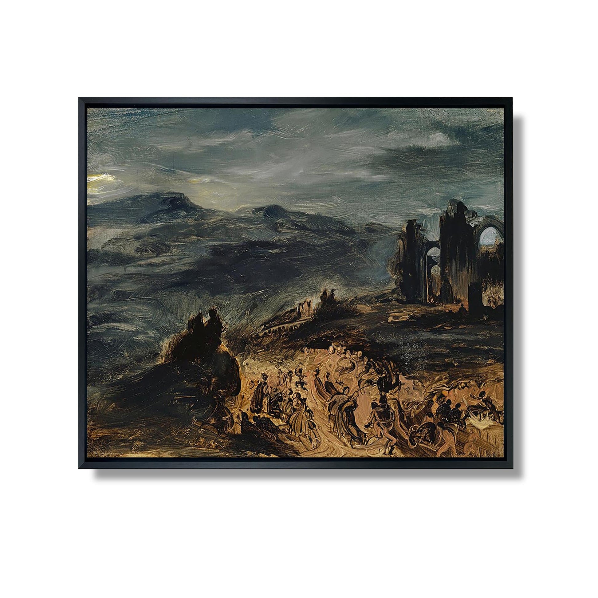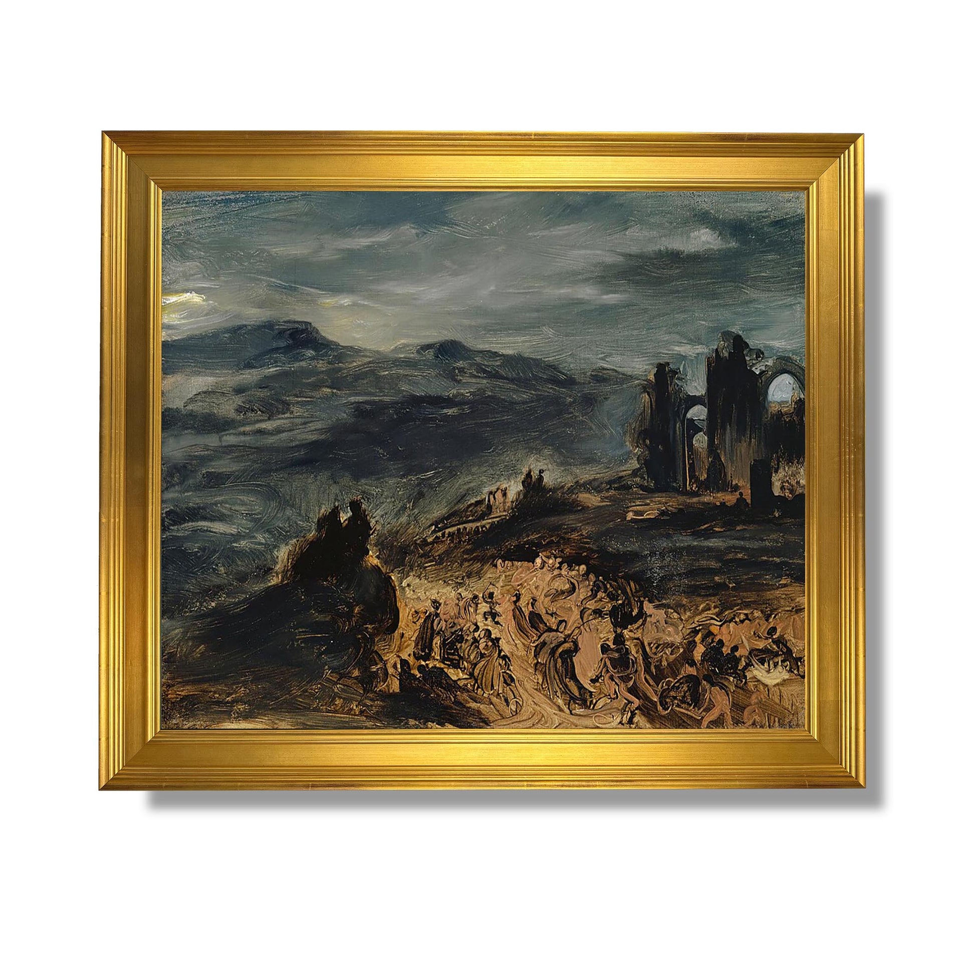 „Sabbatszene“ ist ein ikonisches Werk von Eugène Delacroix, gemalt im Jahr 1857. Dieses Gemälde zeigt eine mystische und dramatische Szene, in der sich Hexen um eine schwarze Ziege, das Symbol des Bösen, versammeln. Die dynamische Komposition, die durch leuchtende Farben und auffällige Kontraste gekennzeichnet ist, erzeugt eine Atmosphäre der Spannung und des Geheimnisvollen. Delacroix, ein Meister der Romantik, verwendet ausdrucksstarke Figuren und fließende Bewegungen, um die Intensität dieses nächtlichen Rituals einzufangen. Das Werk spiegelt die Auseinandersetzung der damaligen Zeit mit dem Fantastischen und Irrationalen wider und unterstreicht zugleich das einzigartige Talent des Künstlers für Emotionen und Farben.