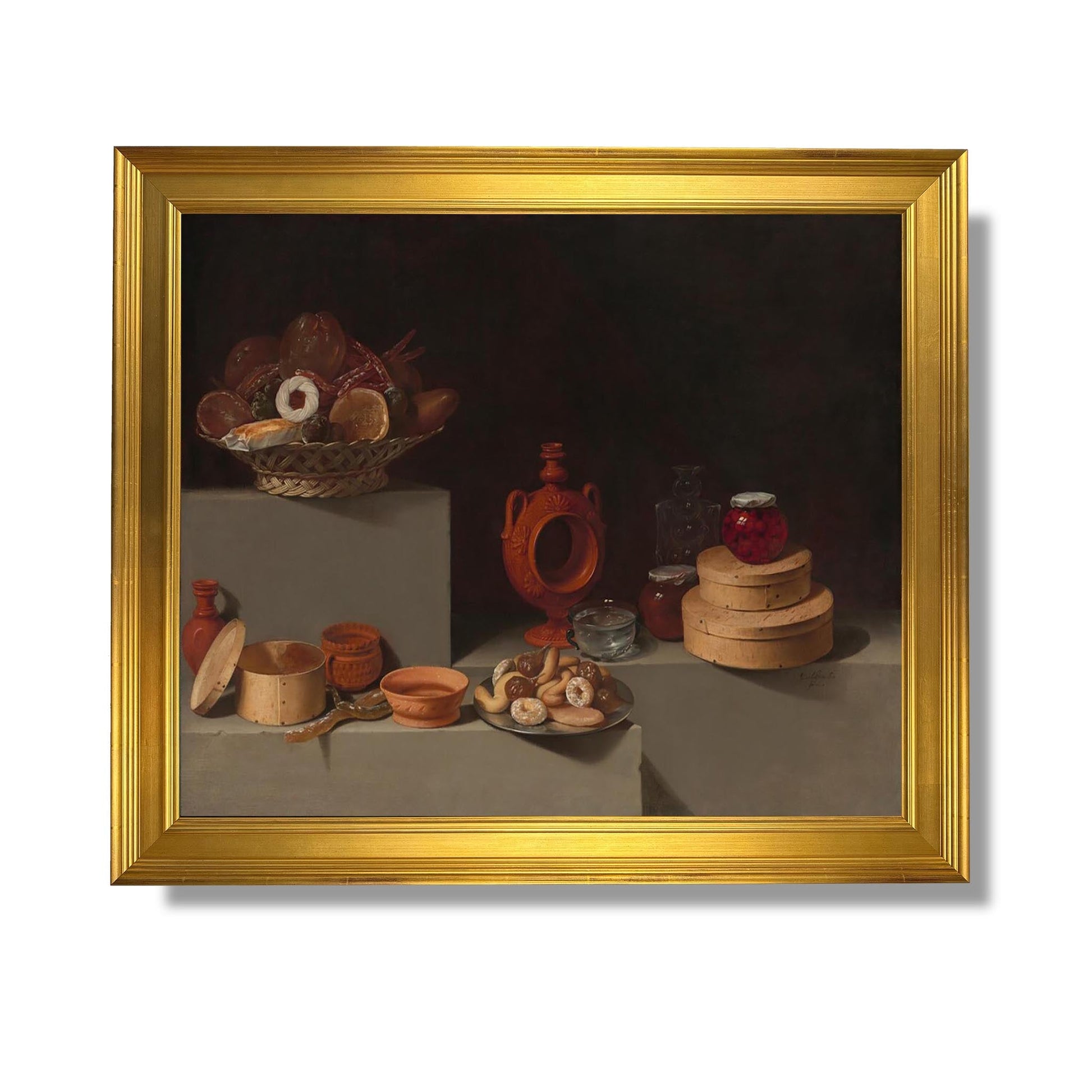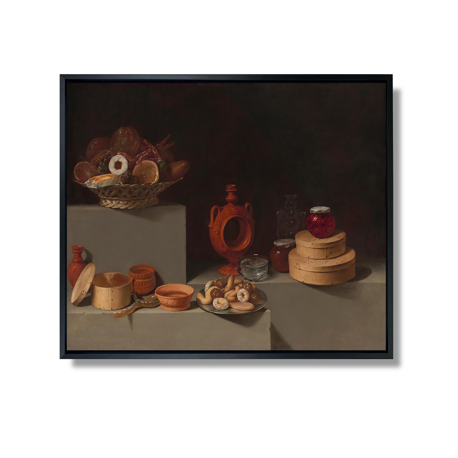 „Stillleben mit Süßigkeiten und Töpferwaren“ von Juan van der Hamen y León ist ein ikonisches Werk aus dem 17. Jahrhundert, das den Reichtum und die Vielfalt des spanischen Stilllebens illustriert. In dieser Komposition stellt der Künstler eine Vielzahl von Süßigkeiten, Töpferwaren und Früchten dar, die den Reichtum der damaligen Zeit widerspiegeln. Die lebendigen Farben und kleinsten Details zeugen von einer ausgeprägten Beobachtungsgabe und technischen Meisterleistung. Van der Hamen, beeinflusst vom Barock, spielt mit Licht und Schatten, um eine Atmosphäre zu schaffen, die sowohl realistisch als auch poetisch ist und den Betrachter einlädt, die vergängliche Schönheit alltäglicher Gegenstände zu würdigen.