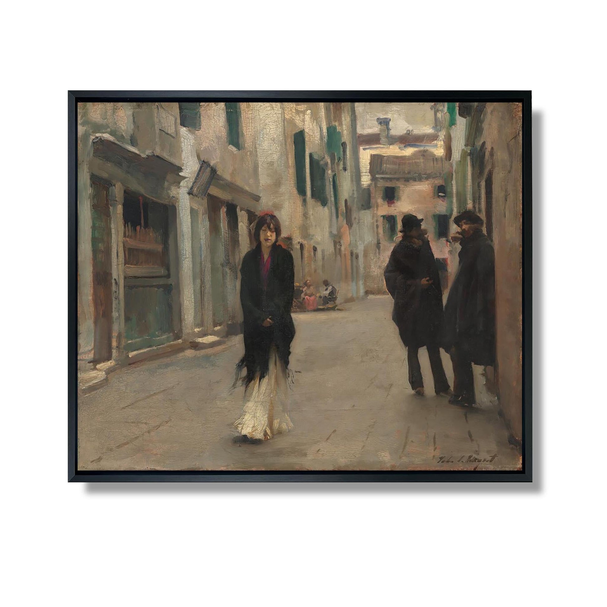 „Straße in Venedig“ von John Singer Sargent ist ein ikonisches Werk, das die pulsierende Essenz der italienischen Stadt einfängt. Dieses 1903 gemalte Gemälde zeigt eine belebte Straße, auf der das Licht auf den bunten Fassaden der Gebäude spielt. Sargent, ein Meister der Porträtmalerei und des Lichts, verwendet fließende Pinselstriche, um die Bewegung und Atmosphäre von Venedig hervorzurufen. Die Charaktere sind zwar zweitrangig, verleihen der Szene jedoch eine menschliche Dimension. Dieses Werk ist ein Beweis für Sargents Liebe zur Stadt und sein Talent, flüchtige Momente einzufangen und dabei Realismus und Impressionismus brillant zu vermischen.