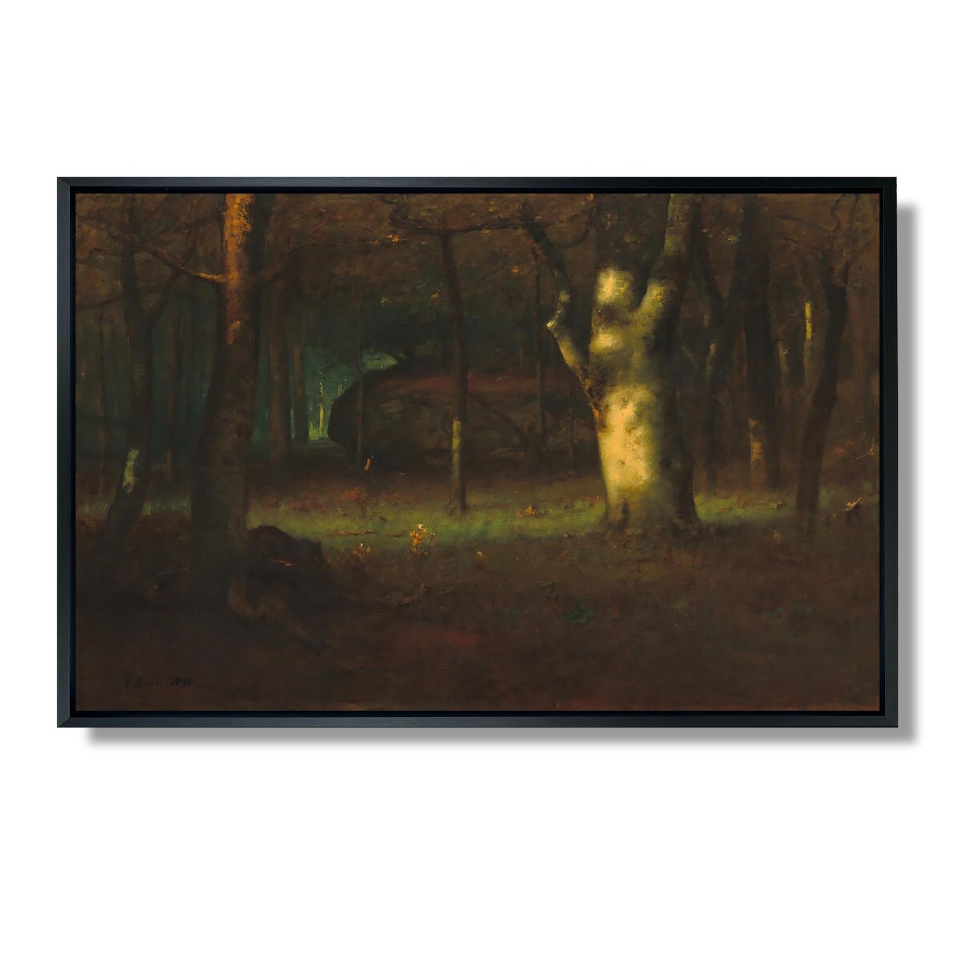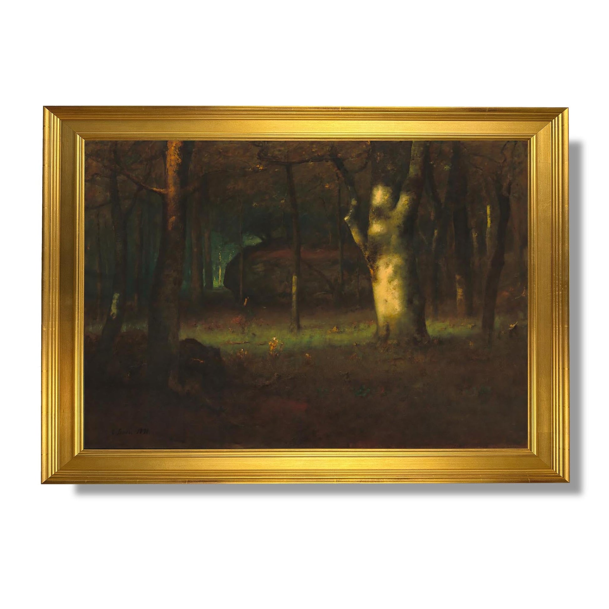 „Sunset in the Woods“ von George Inness ist ein ikonisches Werk der amerikanischen Landschaft des 19. Jahrhunderts und illustriert den Übergang von der Romantik zum Impressionismus. Das 1890 gemalte Bild fängt die heitere Schönheit eines Waldes in der Abenddämmerung ein, in der das goldene Licht der untergehenden Sonne durch die Bäume fällt. Inness verwendet warme Farben und fließende Pinselstriche, um eine Atmosphäre des Friedens und der Kontemplation hervorzurufen. Dieses Gemälde spiegelt die Harmonie zwischen Mensch und Natur wider und zeugt gleichzeitig vom spirituellen Einfluss der Umwelt auf die menschliche Seele. Das Werk lädt zum Meditieren und Staunen angesichts der Schönheit der Natur ein.