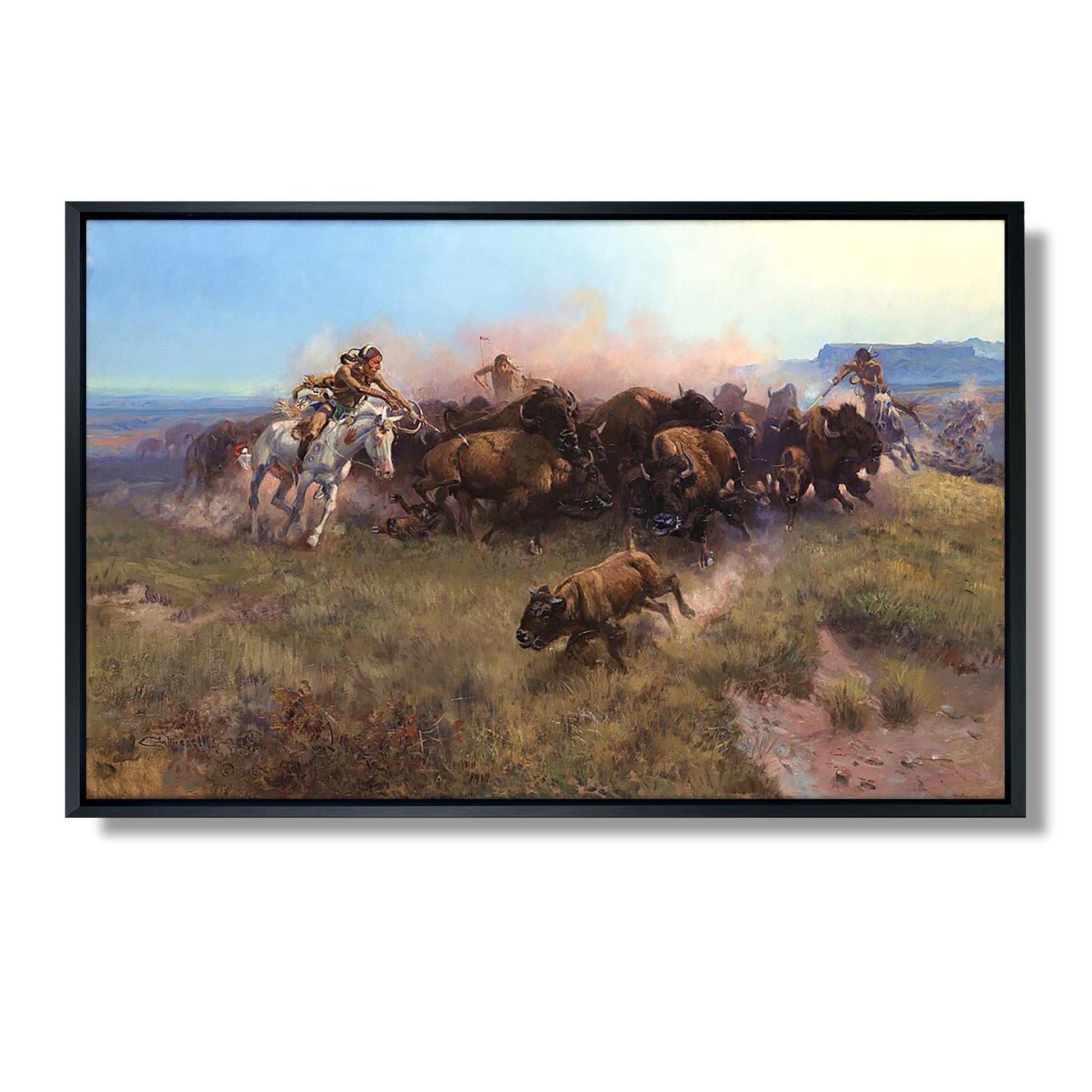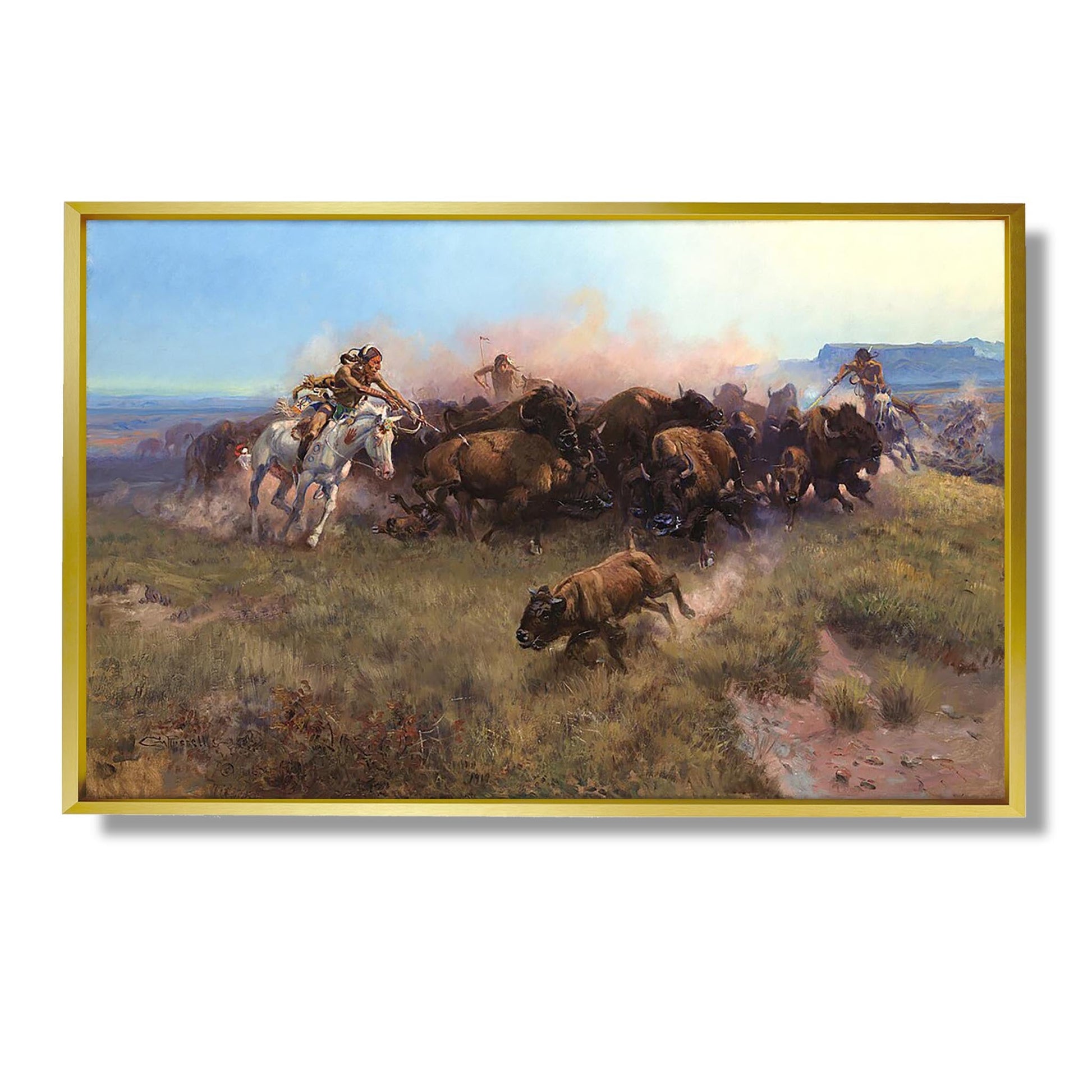 „The Buffalo Hunt – Nr. 39“ (1919) von Charles M. Russell ist ein ikonisches Werk, das die Essenz des Lebens der amerikanischen Ureinwohner und der Pioniere des Wilden Westens einfängt. Russell, bekannt für sein Talent zur Darstellung von Wildnis und Wildtieren, illustriert hier eine dynamische Bisonjagdszene. Die in traditionelle Kostüme gekleideten Figuren sind in voller Aktion und zeugen von der symbiotischen Beziehung zwischen Mensch und Tier. Die lebendige Komposition und die erdigen Farben erinnern an die Erhabenheit amerikanischer Landschaften. Dieses Werk unterstreicht die kulturelle und historische Bedeutung des Bisons und feiert gleichzeitig den unbezwingbaren Geist des Westens.