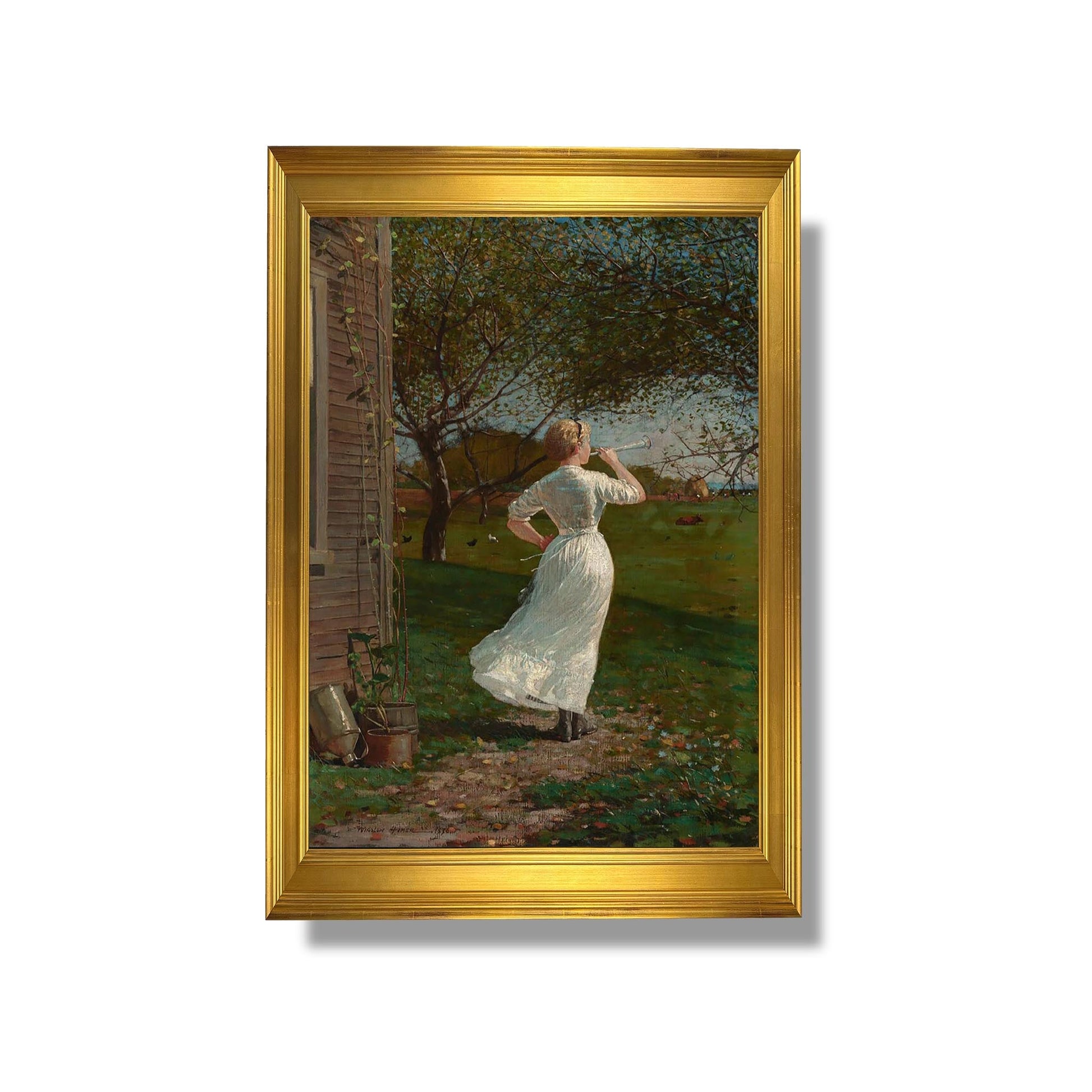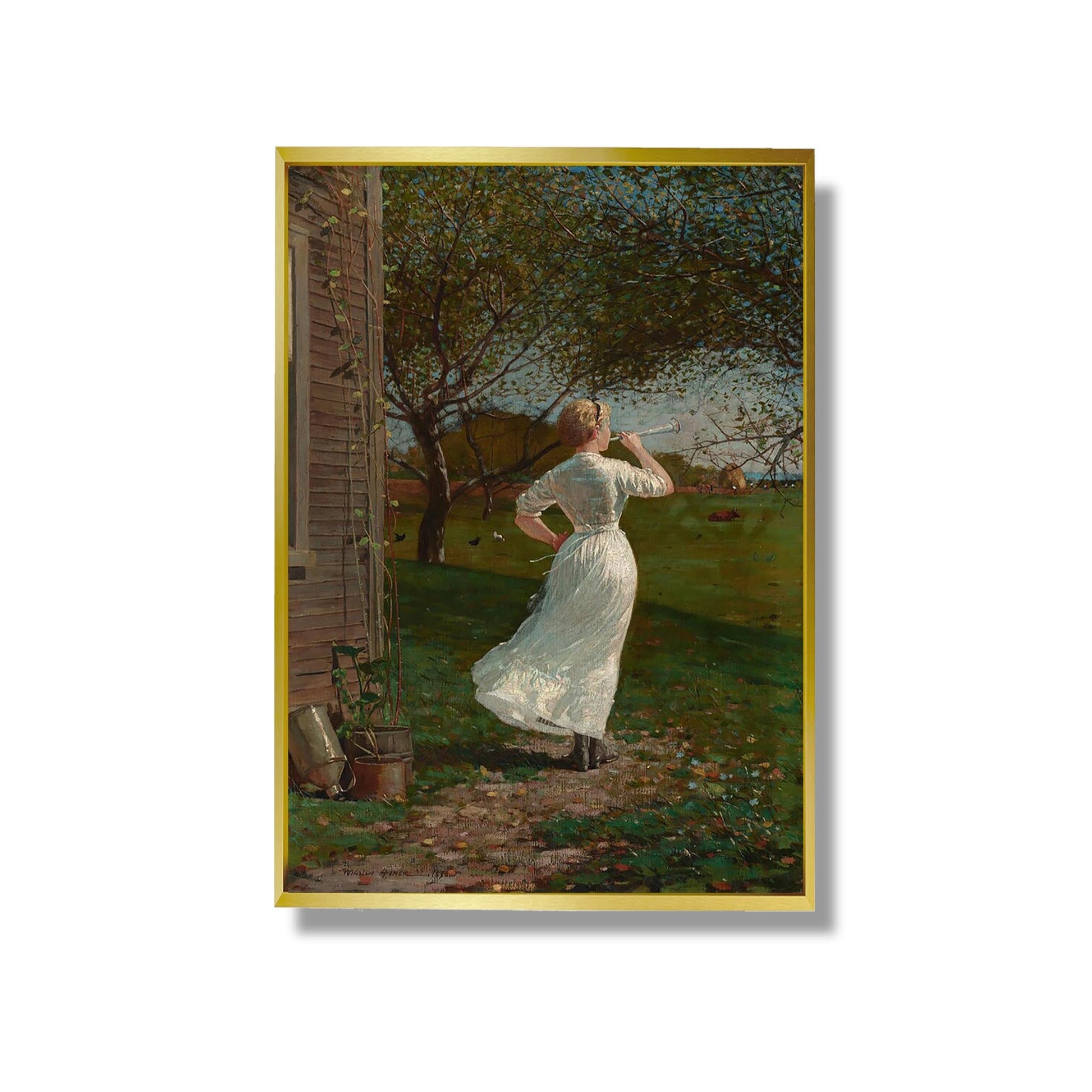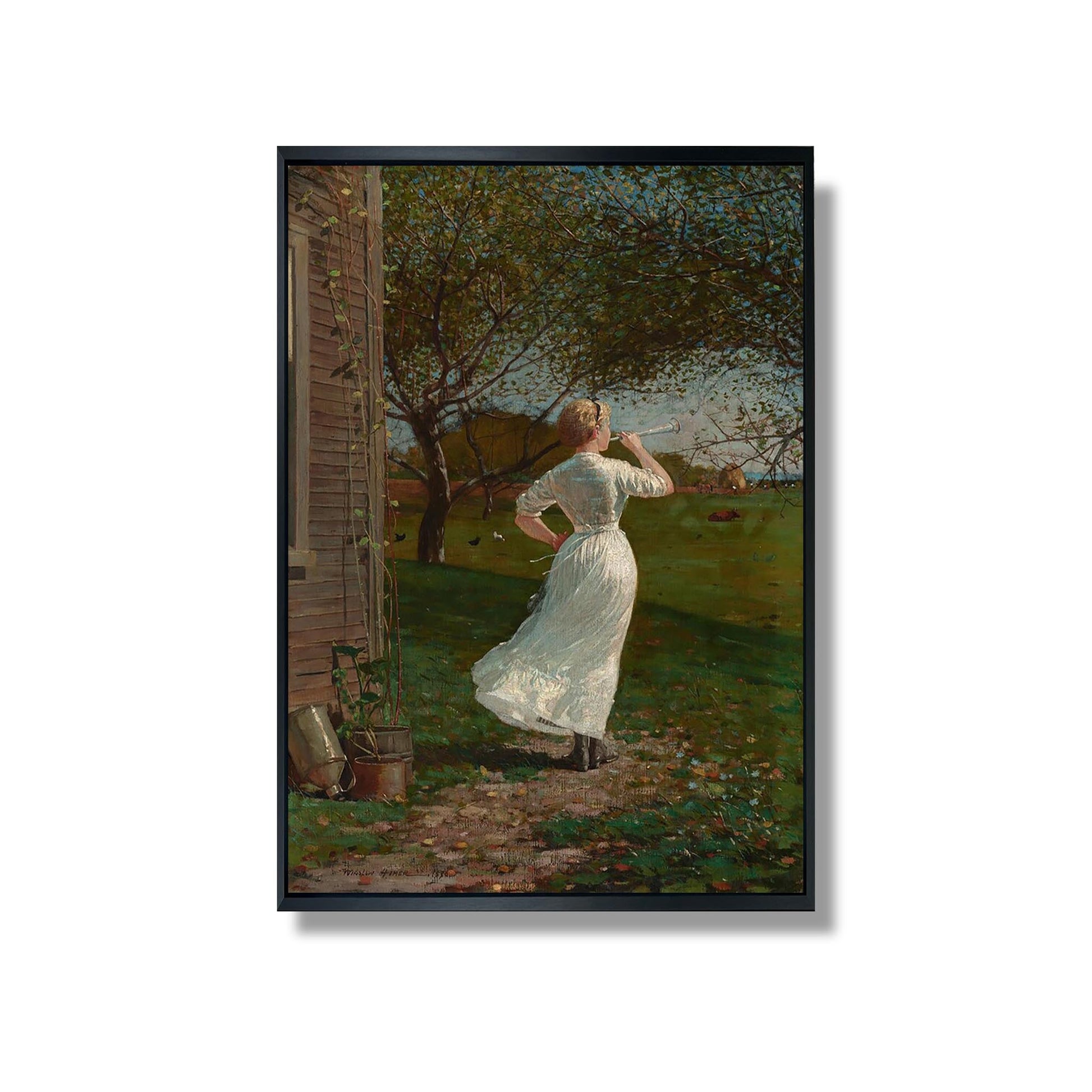 „The Dinner Horn“, auch bekannt als „Blowing the Horn at Seaside“, von Winslow Homer ist ein ikonisches Werk, das die Essenz des amerikanischen Küstenlebens im späten 19. Jahrhundert einfängt. Homer malt eine lebendige Szene: Er zeigt eine Frau an einem Strand, die in ein Horn bläst, um ihre Familienmitglieder zu versammeln. Die Komposition hebt das natürliche Licht und die Textur der Wellen hervor und schafft so eine Atmosphäre, die zugleich heiter und dynamisch ist. Mit diesem Werk beschwört Homer die Einfachheit familiärer Momente und die Schönheit der Natur herauf und stellt zugleich sein Geschick unter Beweis, menschliche Emotionen einzufangen.